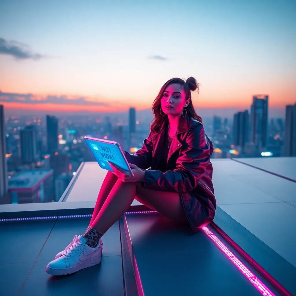 Create an AI-generated image of a futuristic influencer sitting on a sleek, neon-lit rooftop, surrounded by cityscape at dusk, with a holographic tablet in hand, showcasing a trendy outfit and striking a pose, conveying confidence and style. Incorporate subtle AI-generated special effects to enhance the futuristic ambiance.