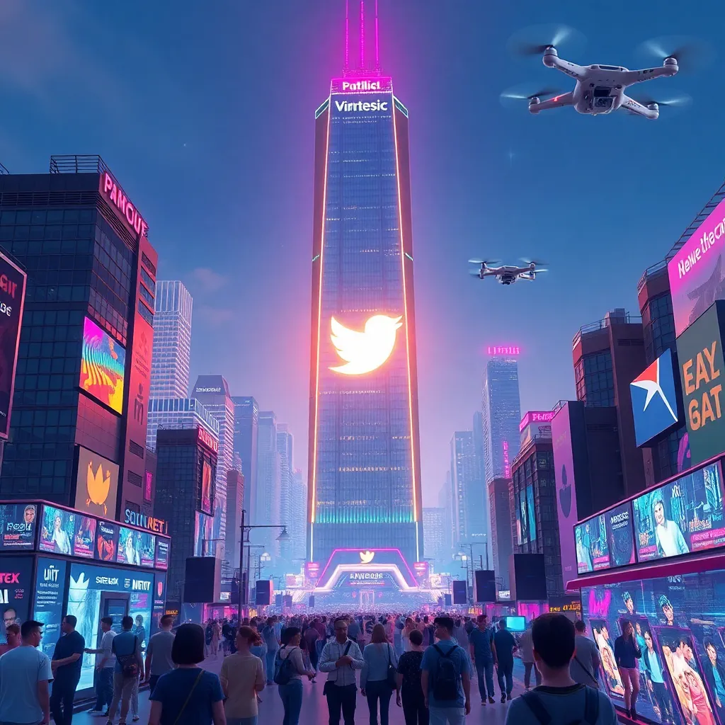 Create an image of a futuristic cityscape with a prominent skyscraper featuring a bold, neon-lit logo of a popular social media platform. The city is bustling with people of diverse backgrounds, and the atmosphere is vibrant and energetic. Incorporate AI-generated elements, such as holographic advertisements and flying drones.