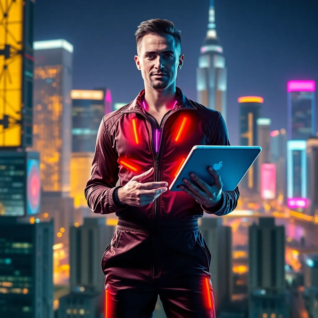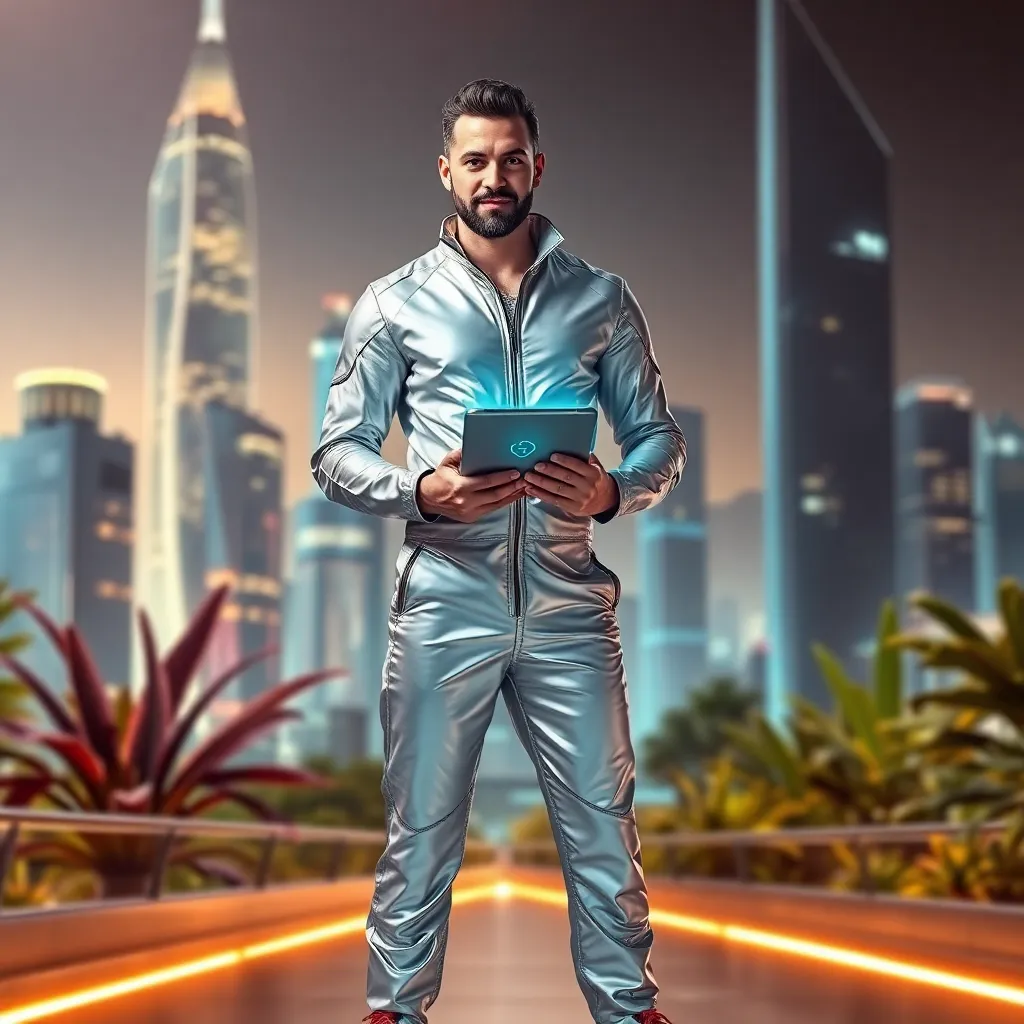 Create an image of a futuristic social media influencer, 'TechTitan,' standing in front of a sleek, neon-lit cityscape. TechTitan is dressed in a bold, metallic jumpsuit and holding a tablet with a holographic display. The background is a blend of organic and digital elements, showcasing the fusion of technology and nature.