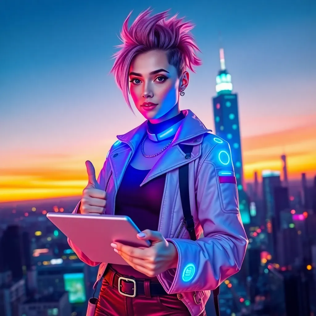 Create an image of a futuristic, high-tech influencer surrounded by a cityscape at sunset. The influencer is a young woman with a bold, edgy hairstyle and a fashionable outfit. She's holding a tablet and giving a thumbs up to the camera. Incorporate neon lights and holographic displays in the background.