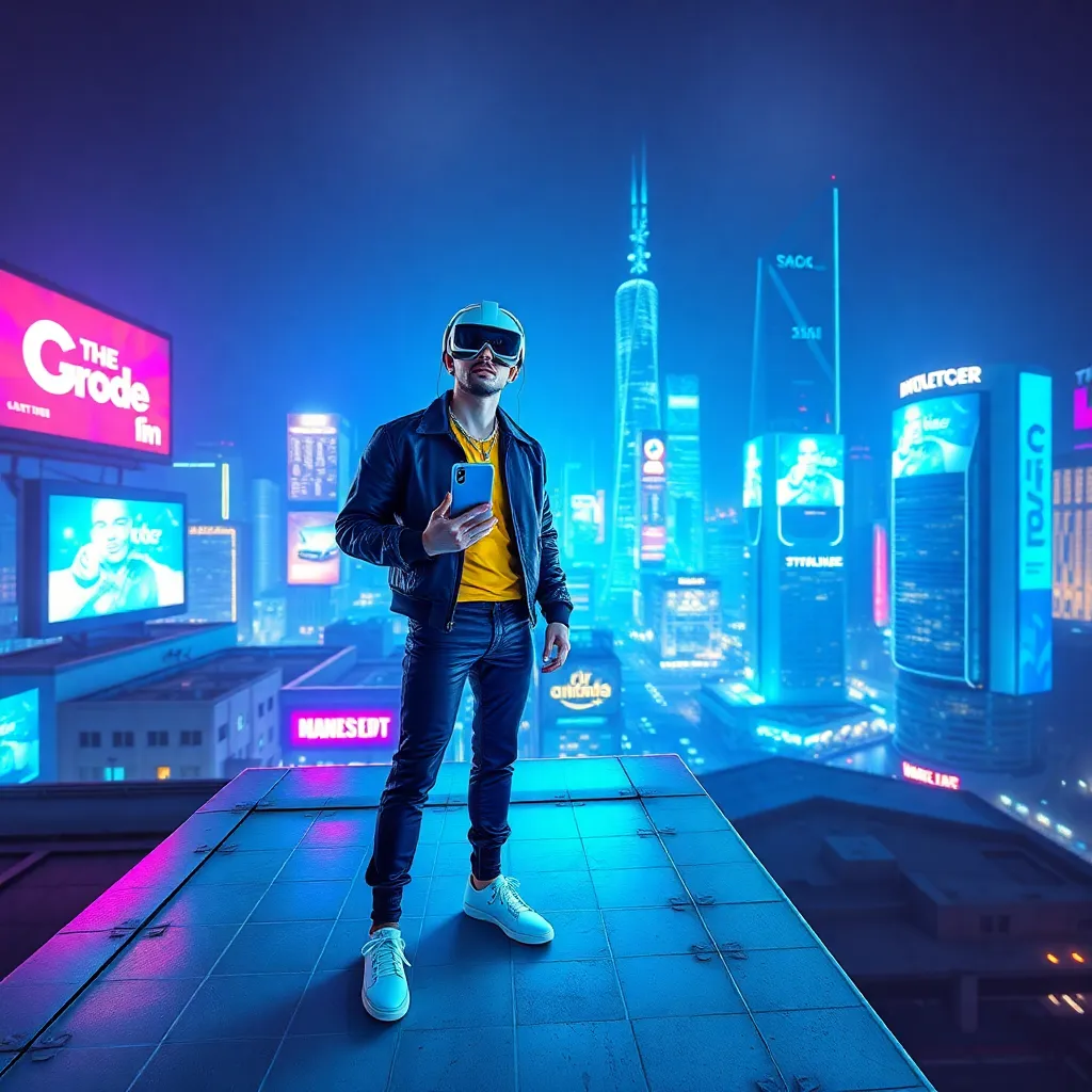Create an image of a futuristic cityscape with a trendy influencer standing on a rooftop, surrounded by neon lights and holographic advertisements. The influencer is dressed in a bold, futuristic outfit and holding a smartphone with a virtual reality headset. The cityscape should have a vibrant, electric blue hue.
