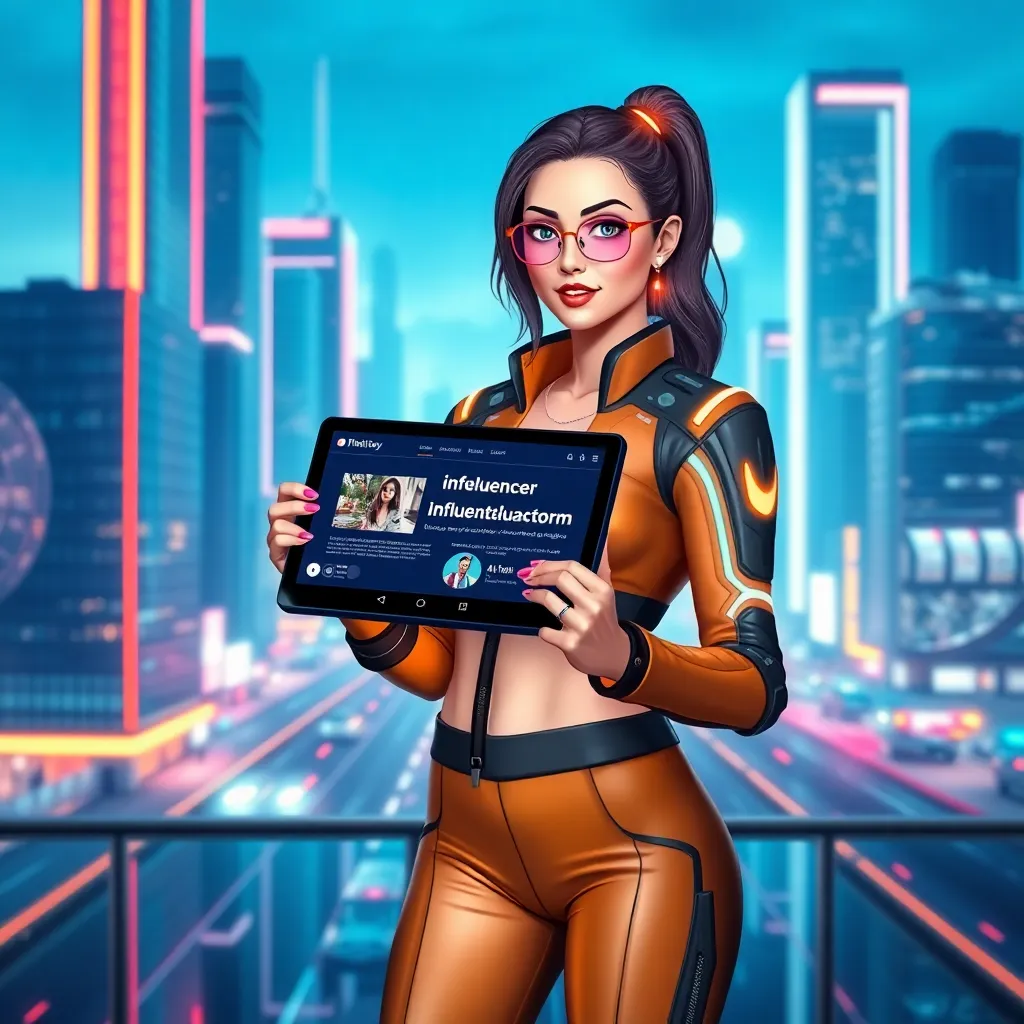 Create an AI-generated image of a futuristic social media influencer standing in front of a sleek, neon-lit cityscape. She's dressed in a bold, high-tech outfit with glowing accents and holding a tablet displaying a popular influencer platform. The image should convey confidence, innovation, and a sense of limitless possibilities.