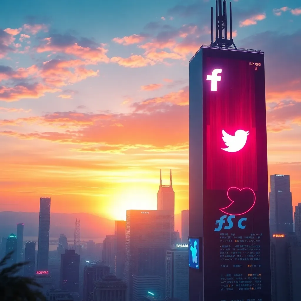 Create an AI-generated image of a futuristic cityscape at sunset, with a prominent skyscraper featuring a massive LED screen displaying a popular social media logo. Incorporate vibrant colors, neon lights, and a sense of movement to convey the intersection of technology and social media in a futuristic urban landscape.