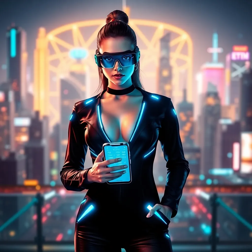 Create an AI-generated image of a futuristic influencer posing in front of a sleek, neon-lit cityscape, surrounded by holographic advertisements and robots. The influencer should be dressed in a stylish, high-tech outfit with glowing accents, holding a smartphone with a virtual reality headset. Incorporate a subtle glow effect.