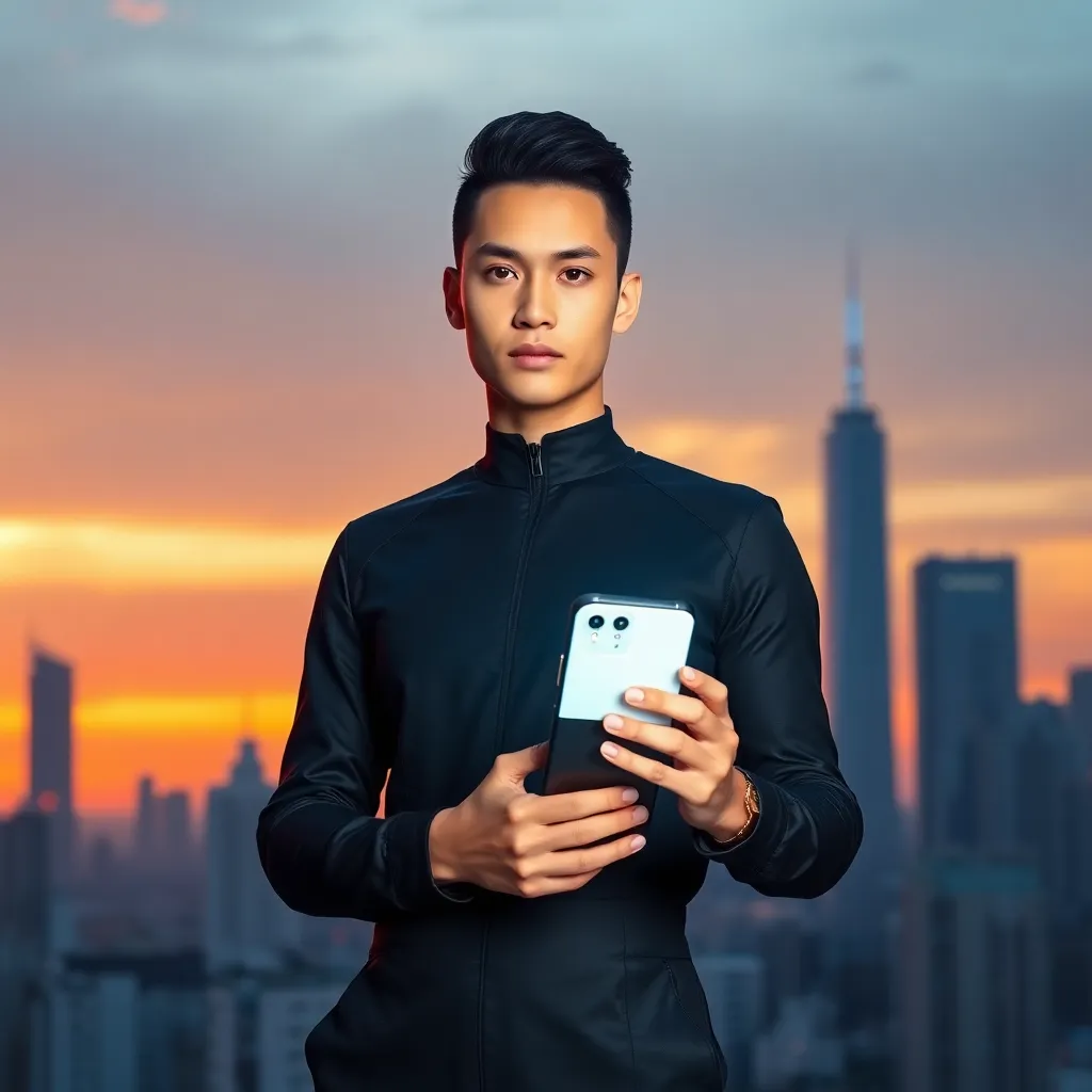 Create an AI-generated image of a futuristic influencer standing in front of a cityscape at sunset, wearing a sleek black jumpsuit and holding a smartphone with a glowing screen, conveying confidence and tech-savviness. Incorporate subtle neon accents and a city skyline with towering skyscrapers and flying cars.