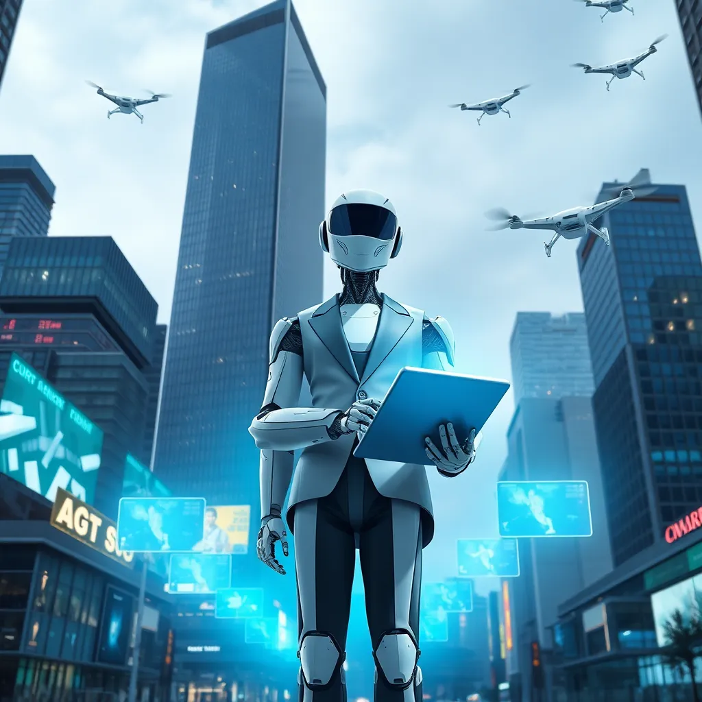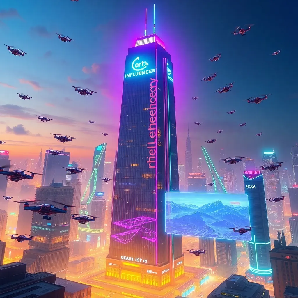 Create an image of a futuristic cityscape with a prominent skyscraper featuring a neon-lit influencer logo. The building should be surrounded by a swarm of drones and robots, with a holographic display projecting a virtual reality landscape. Incorporate vibrant colors and a sense of energy and movement.