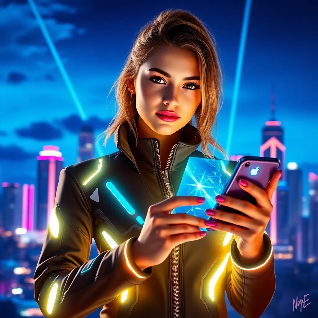 Create an image of a futuristic influencer, 'Nova Star', standing in front of a neon-lit cityscape at dusk. Nova is dressed in a sleek, high-tech outfit with glowing accents, holding a smartphone with a holographic display. The background is a vibrant, electric blue, with subtle laser beams and wispy clouds.