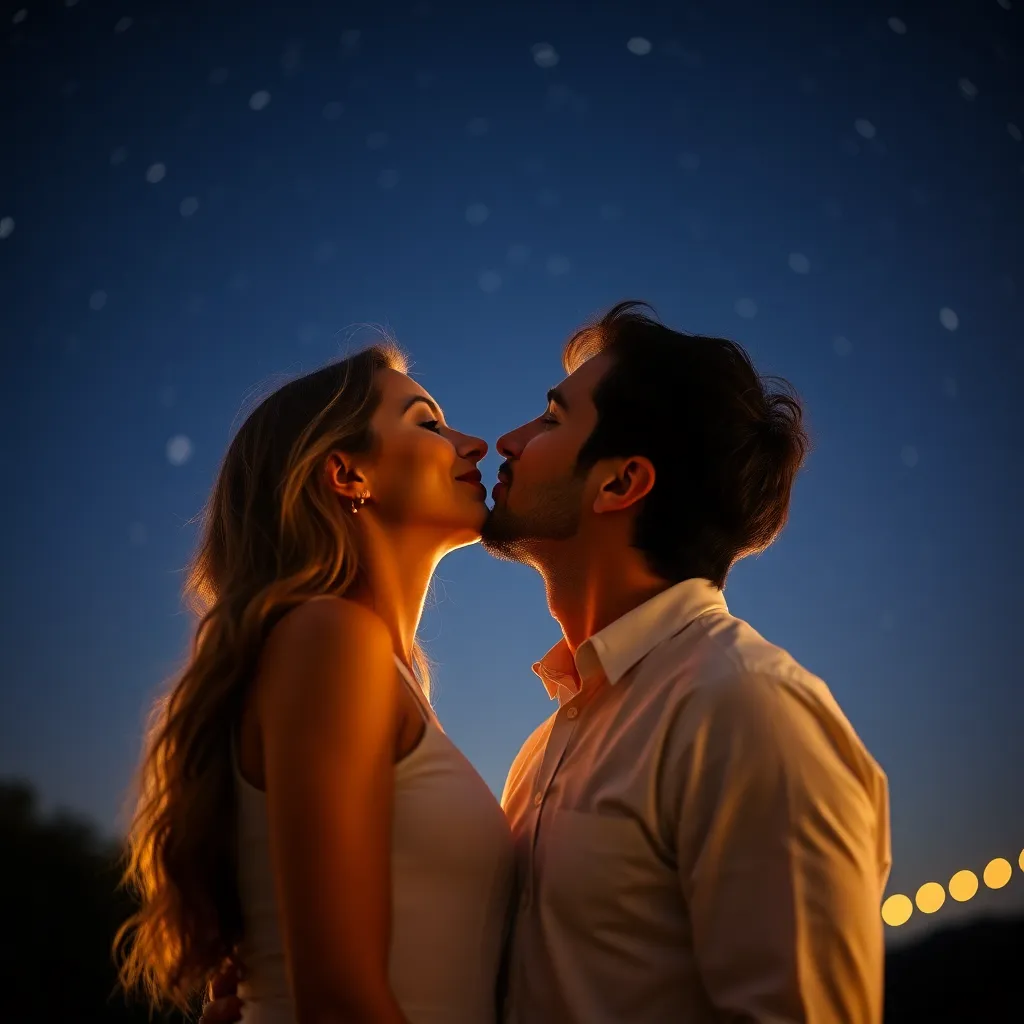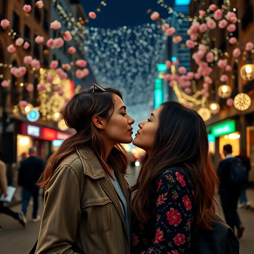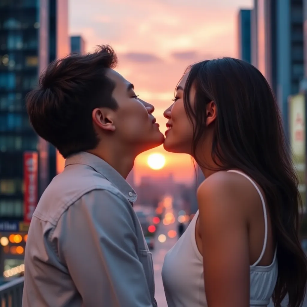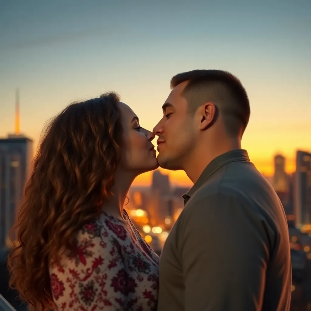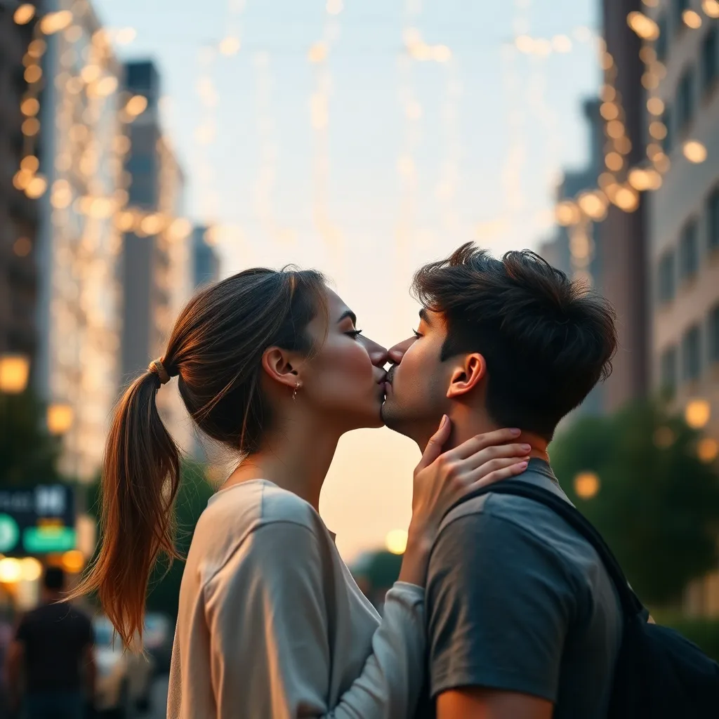 Two strangers, a free-spirited artist and a tech-savvy entrepreneur, share a romantic kiss under the twinkling city lights. The air is filled with the sweet scent of blooming flowers and the soft hum of street performers. The couple's lips lock in a tender, passionate embrace, as the world slows down.