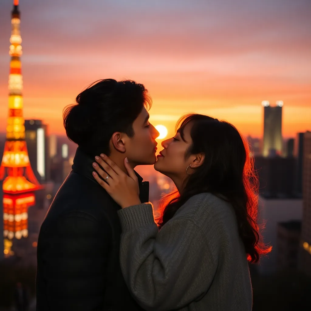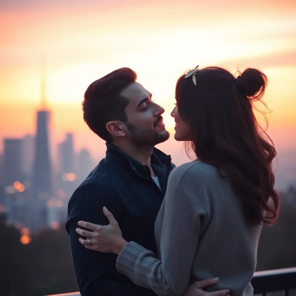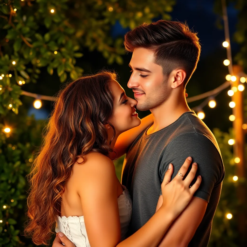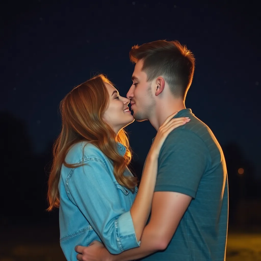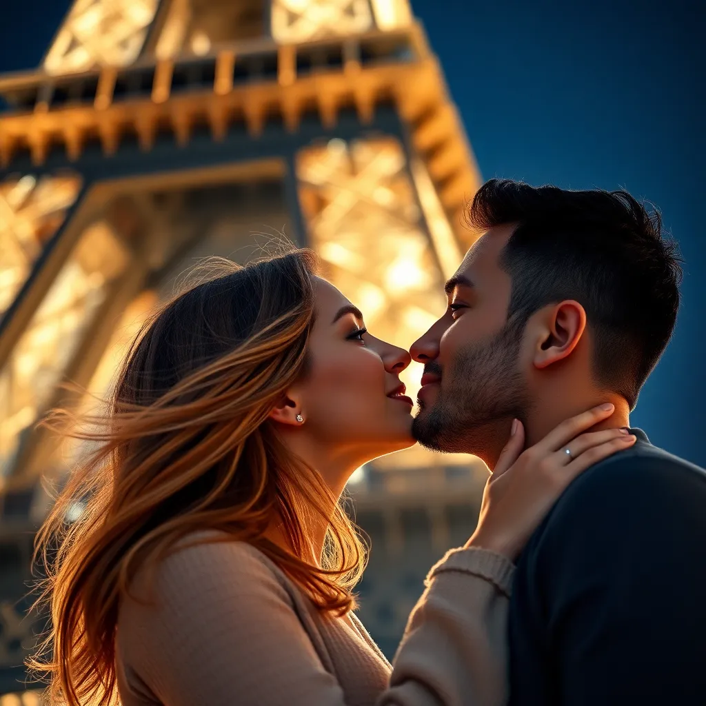 Two strangers, a free-spirited artist and a tech-savvy entrepreneur, share a romantic kiss under the twinkling city lights. The air is filled with the sweet scent of blooming flowers and the soft hum of street performers. The couple's lips lock in a tender, passionate embrace, as the world slows down.