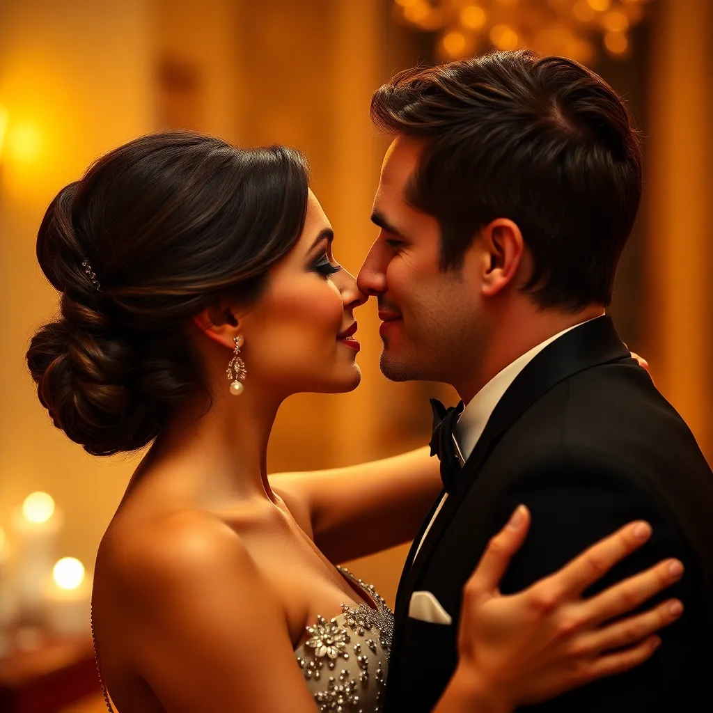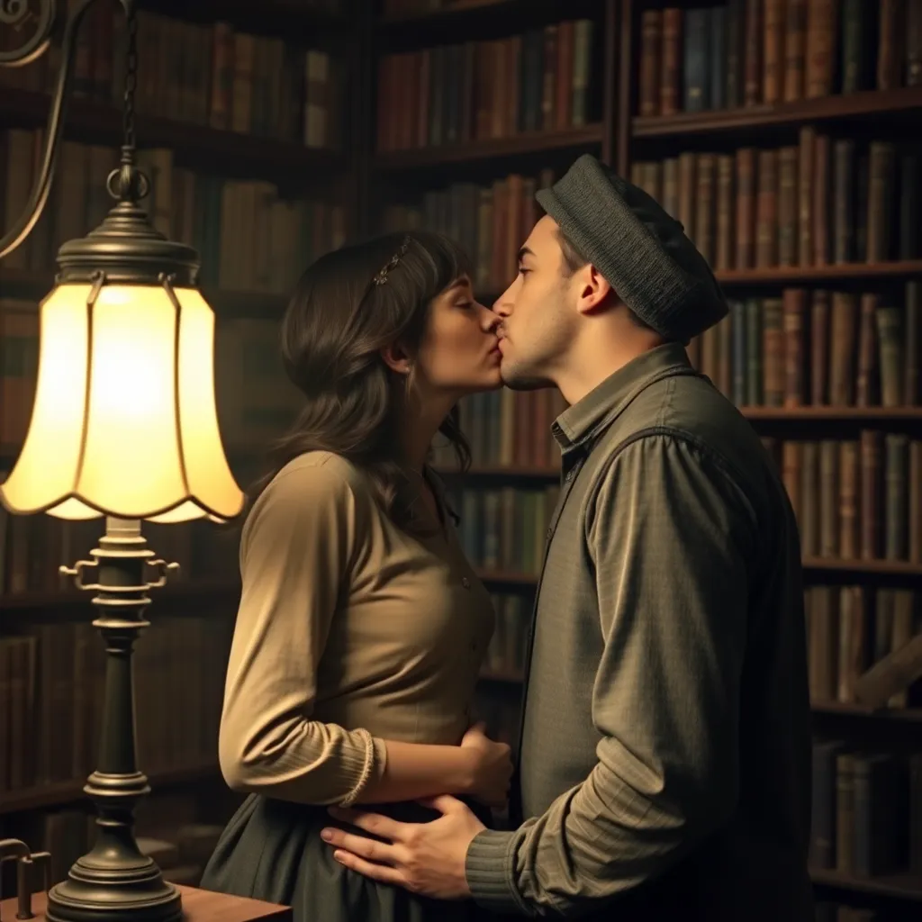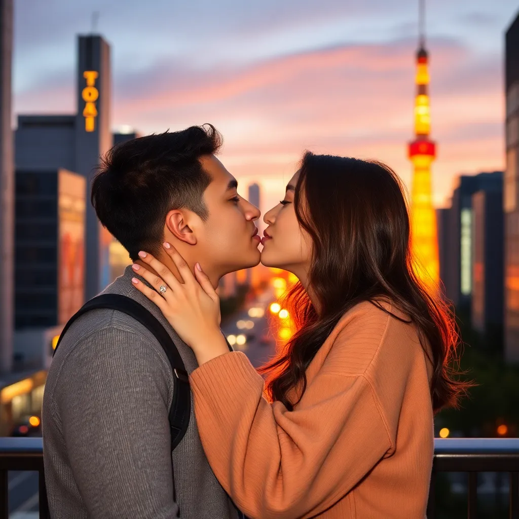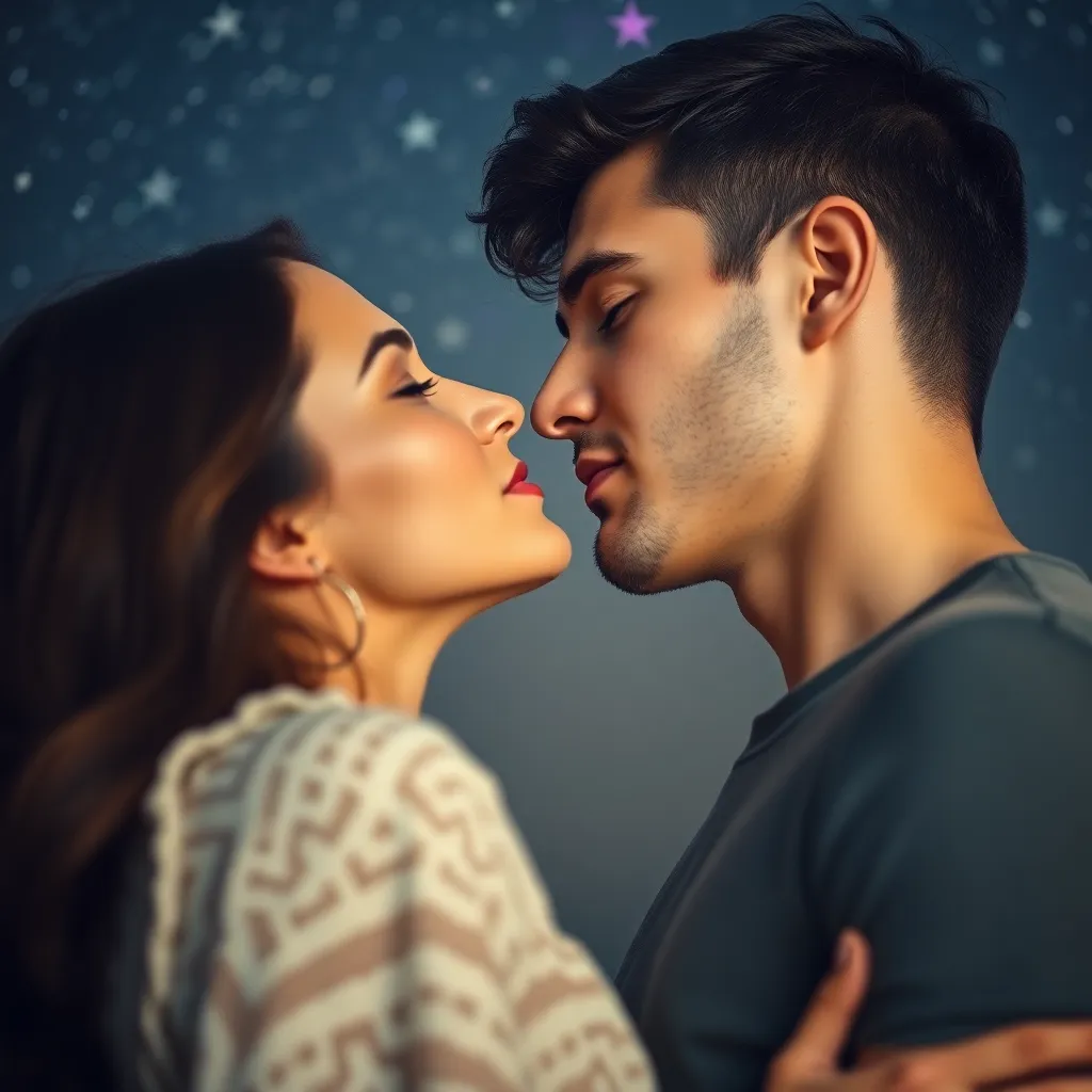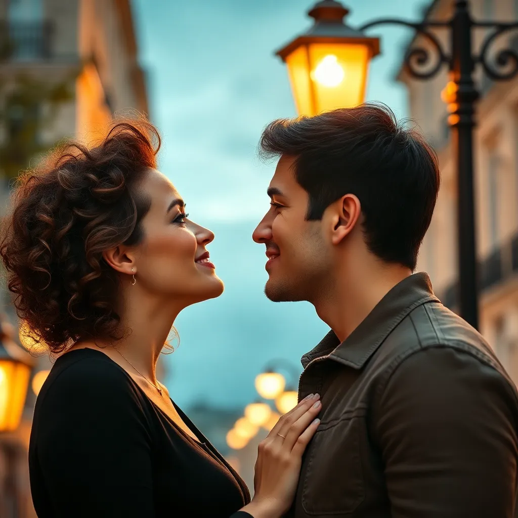 Two strangers, a free-spirited artist and a tech-savvy entrepreneur, share a romantic kiss under the twinkling city lights. The air is filled with the sweet scent of blooming flowers and the soft hum of street performers. The couple's lips lock in a tender, passionate embrace, as the world slows down.