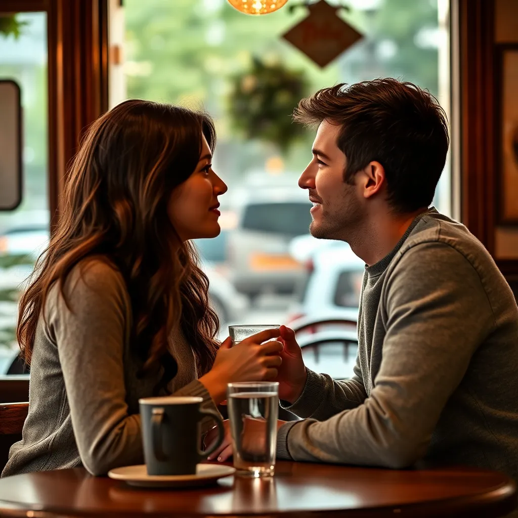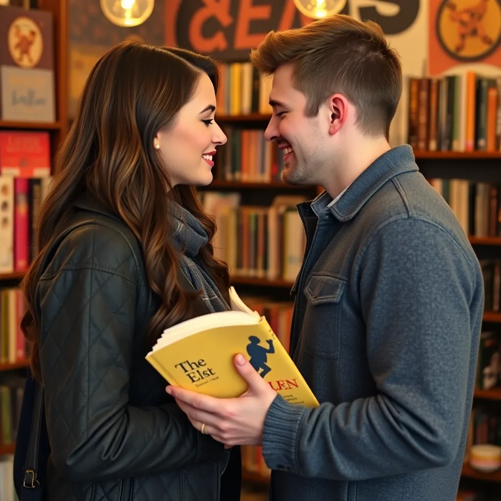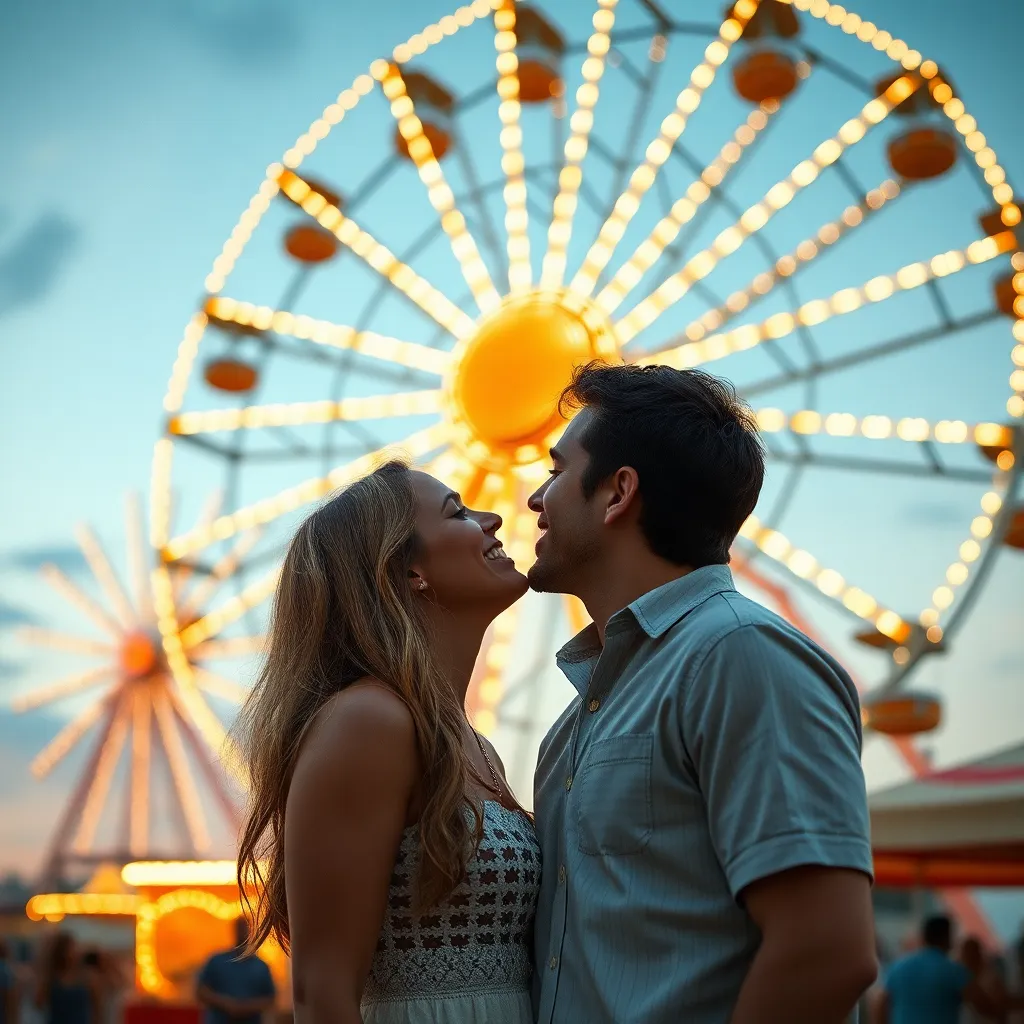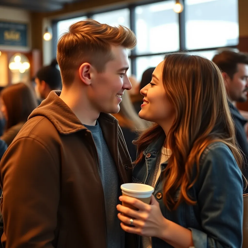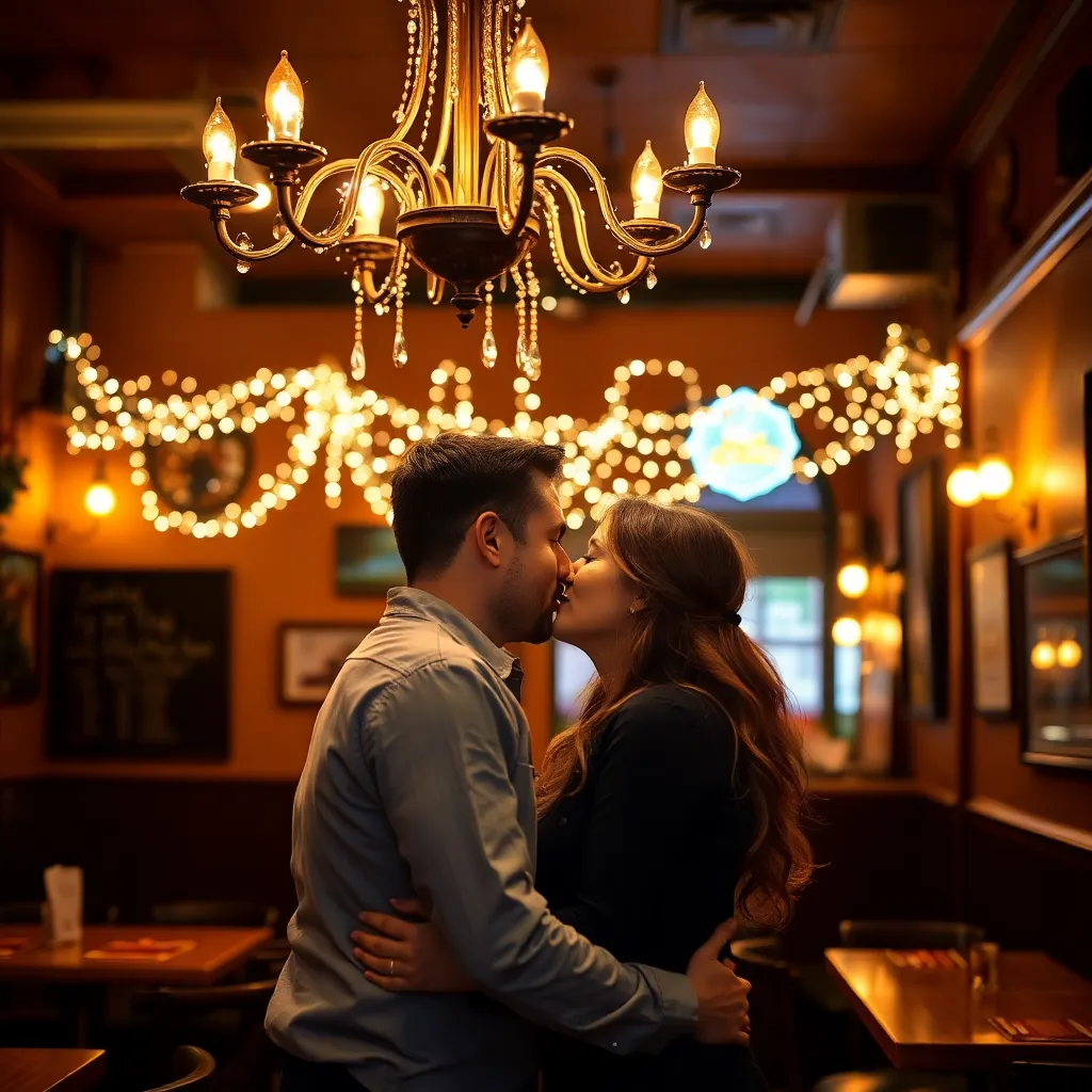 Two strangers, a free-spirited artist and a tech-savvy entrepreneur, share a romantic kiss under the twinkling city lights. The air is filled with the sweet scent of blooming flowers and the soft hum of street performers. The couple's lips lock in a tender, passionate embrace, as the world slows down.