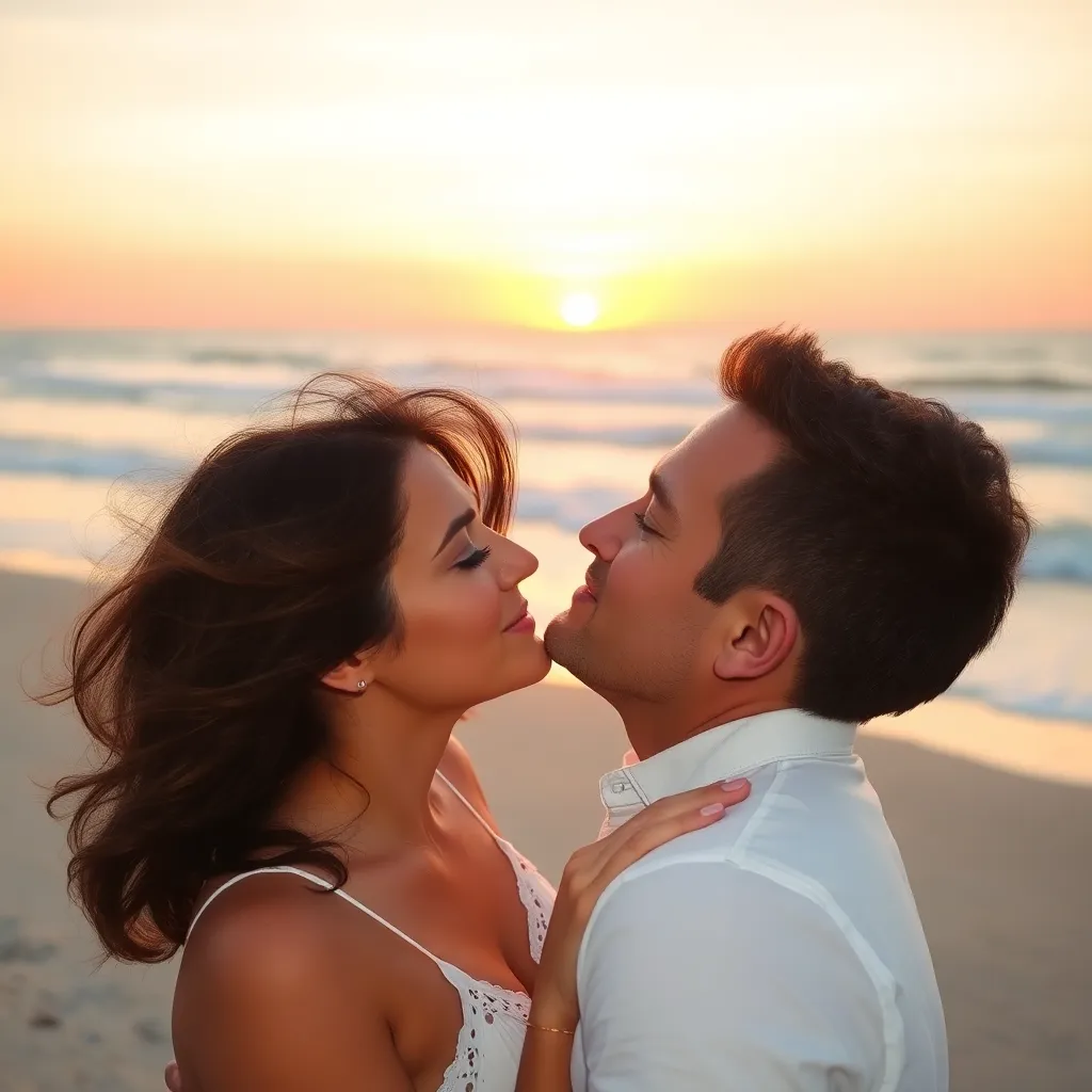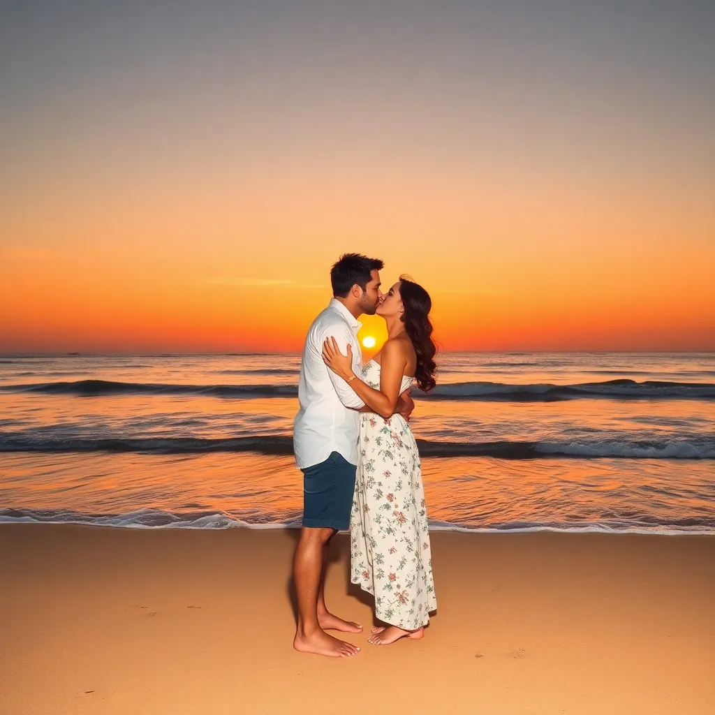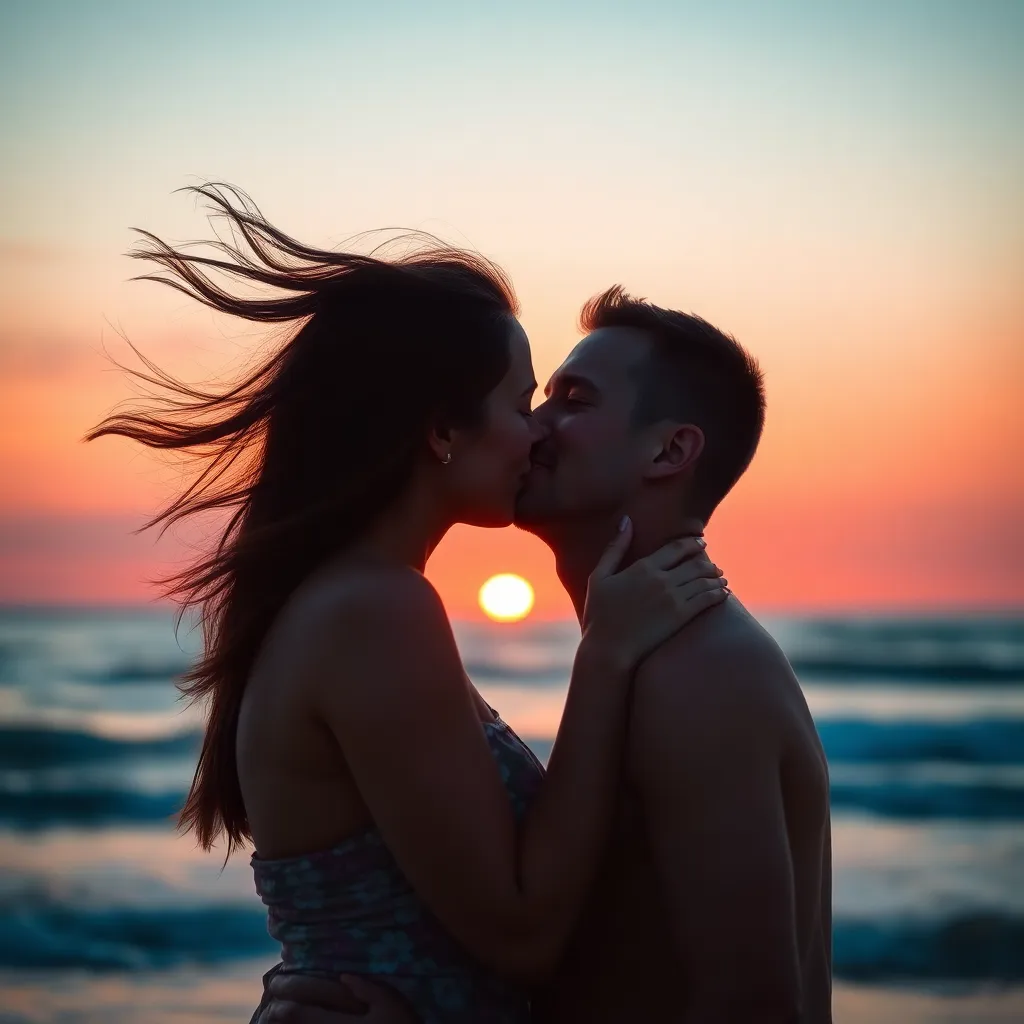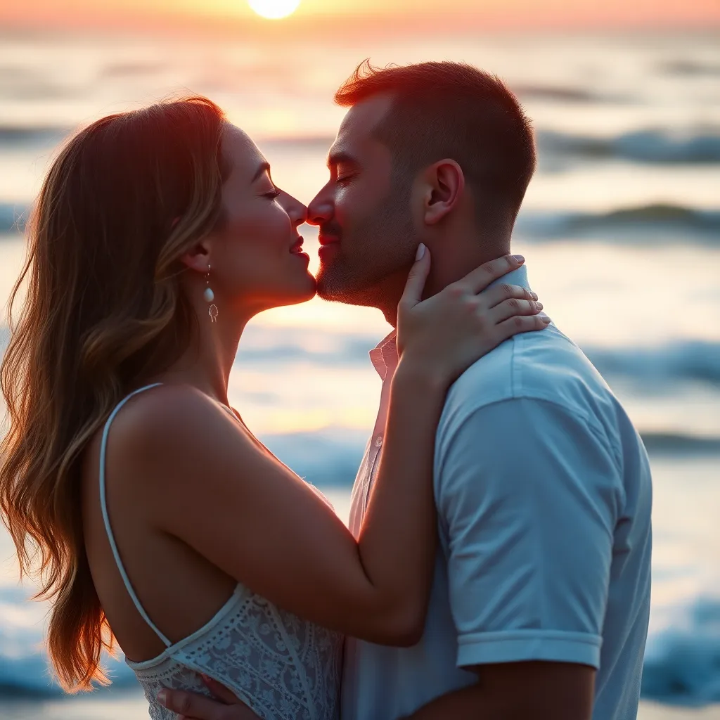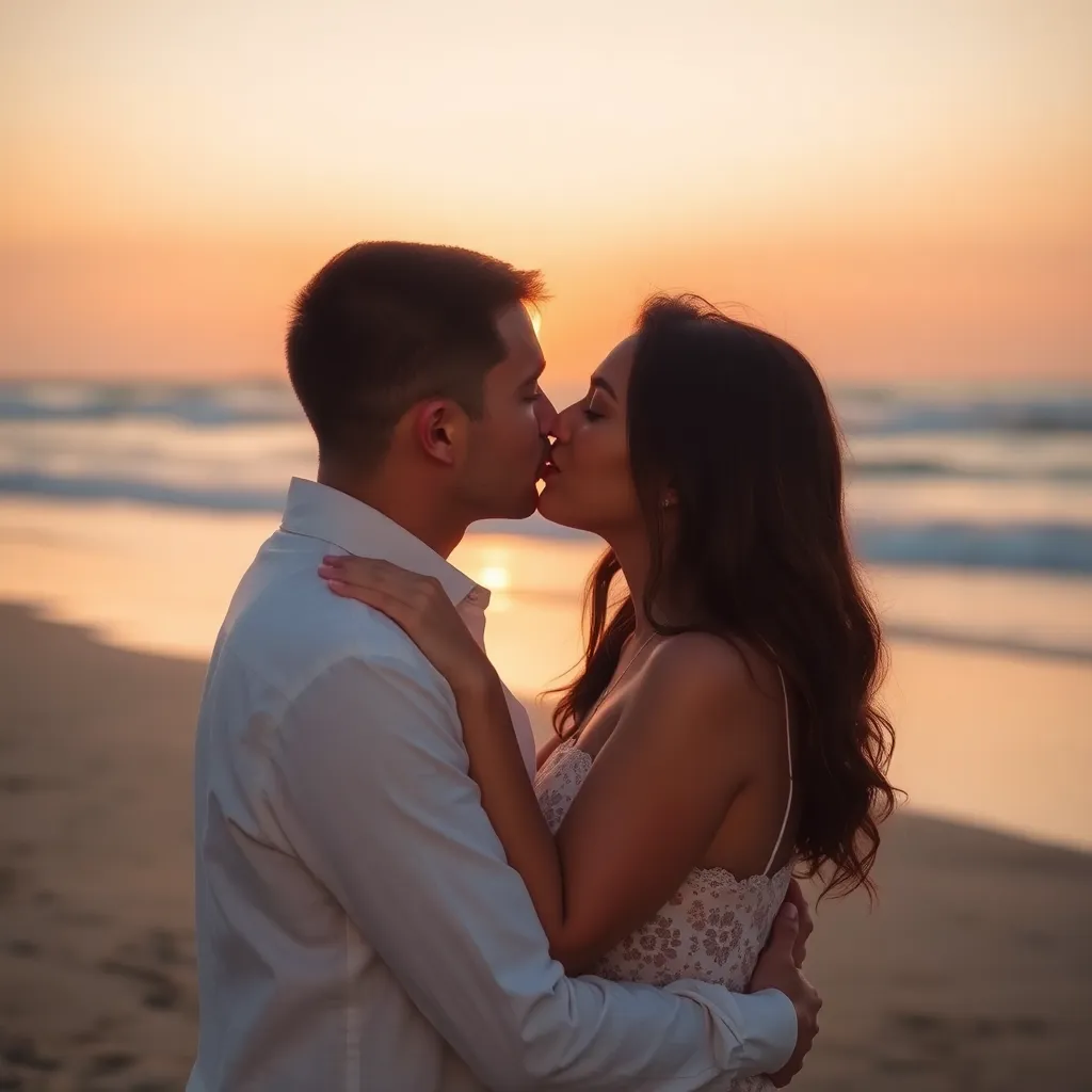 Imagine a warm summer evening, the sun dipping into the ocean. A couple, hand in hand, standing on the beach, feeling the gentle breeze. As they gaze into each other's eyes, their lips meet in a tender kiss, the sound of the waves crashing in the background. Generate an image of this romantic moment.