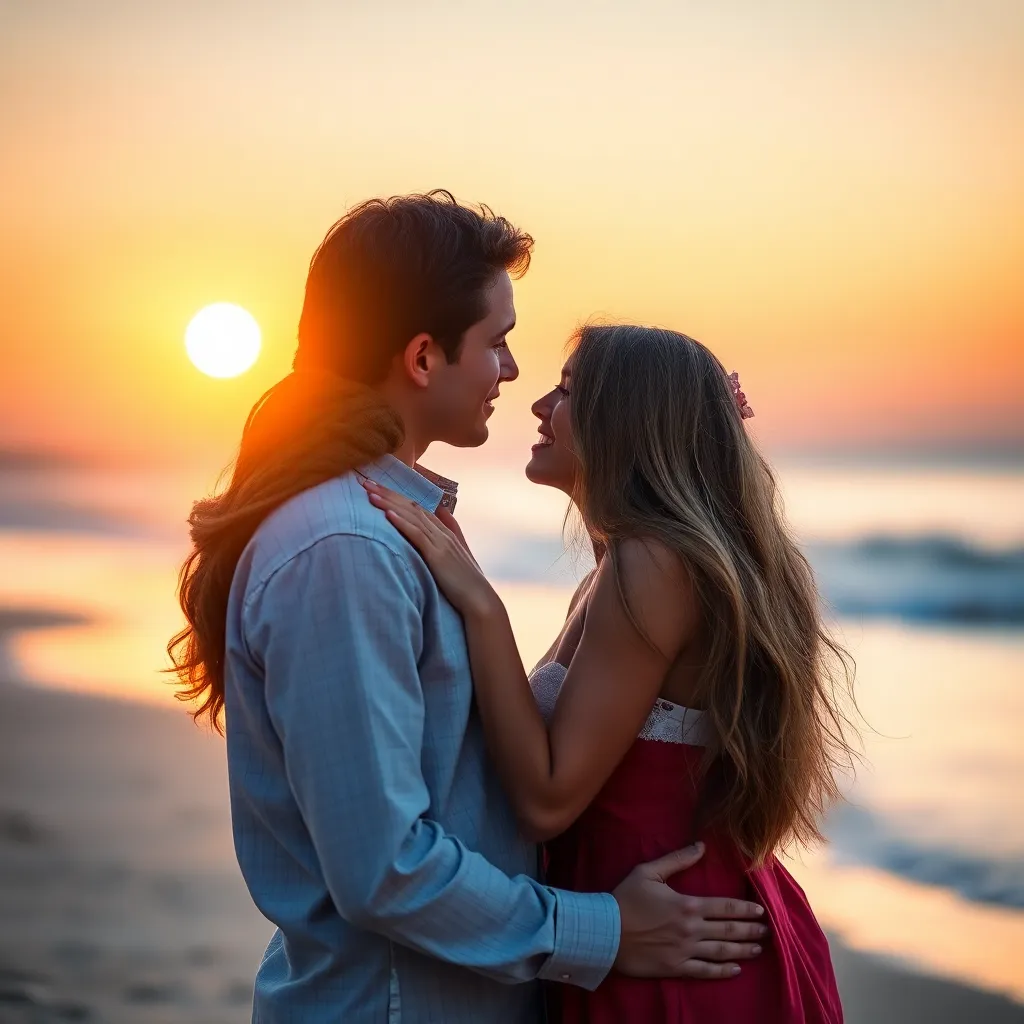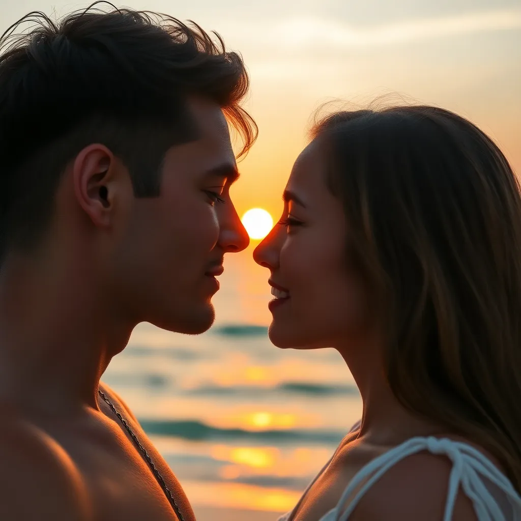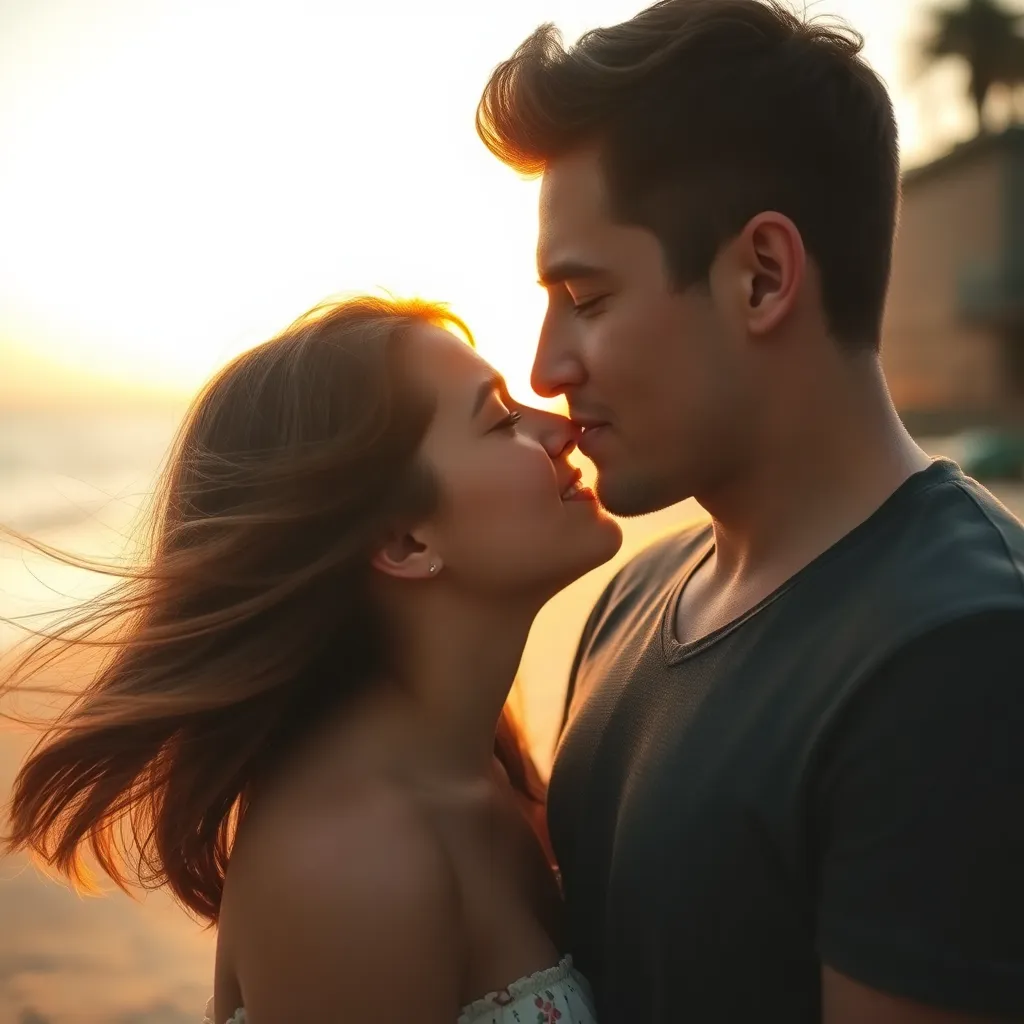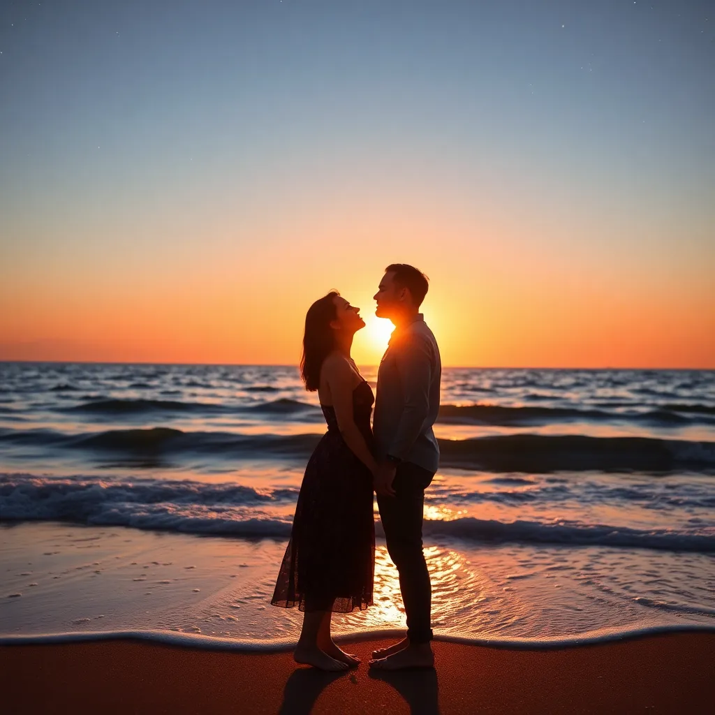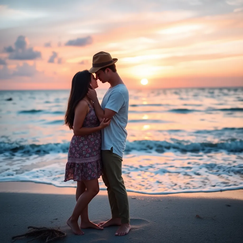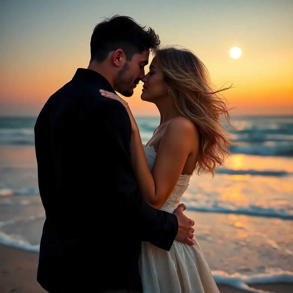 Imagine a warm summer evening, the sun dipping into the ocean. A couple, hand in hand, standing on the beach, feeling the gentle breeze. As they gaze into each other's eyes, their lips meet in a tender kiss, the sound of the waves crashing in the background. Generate an image of this romantic moment.