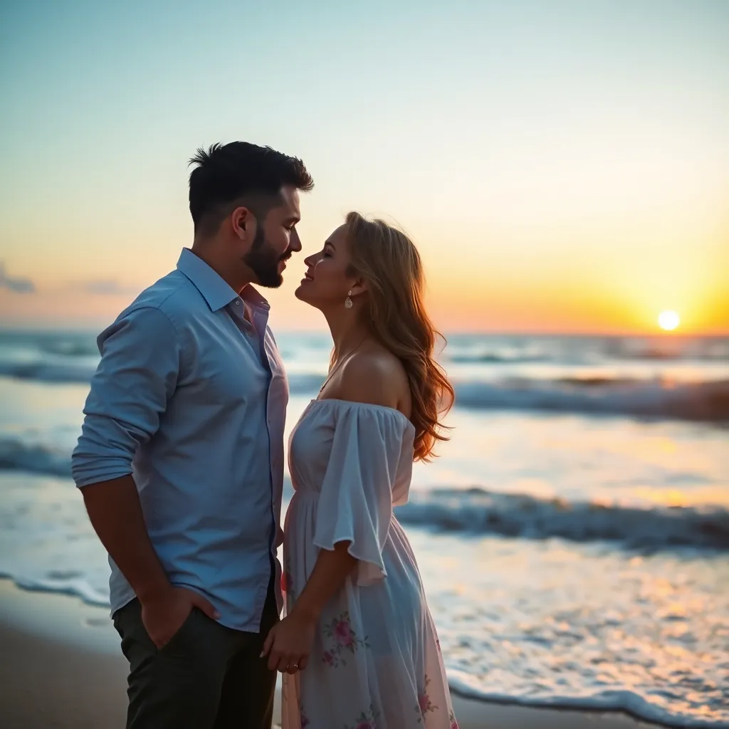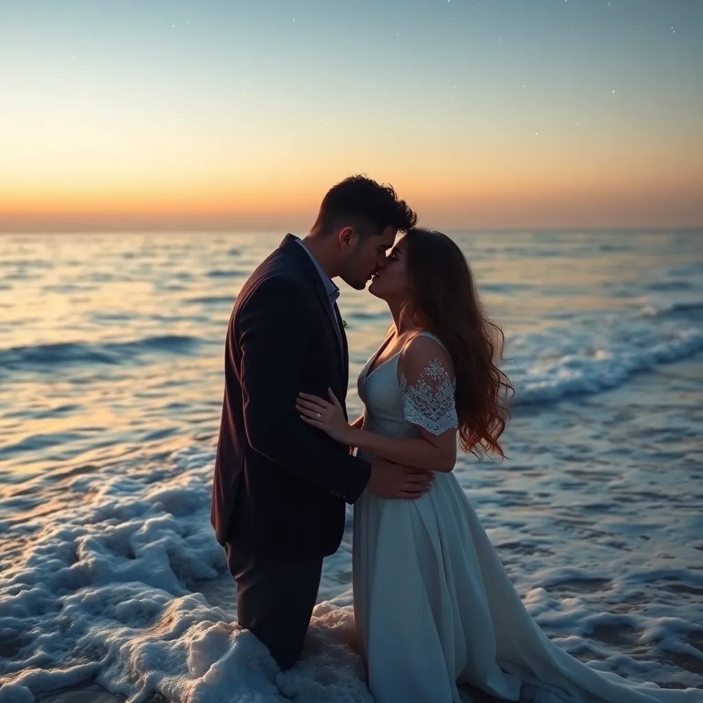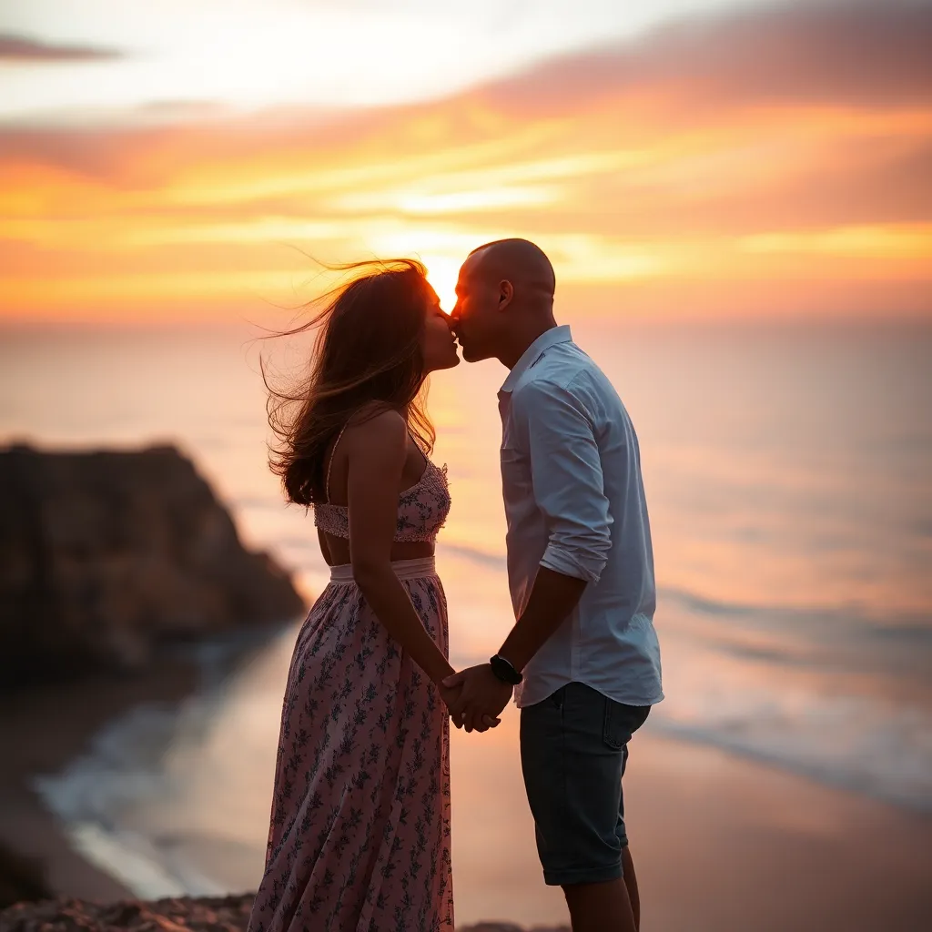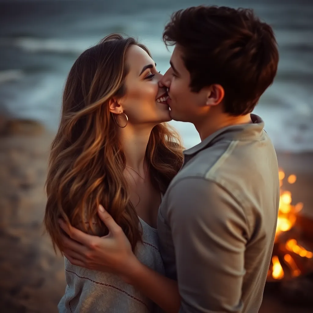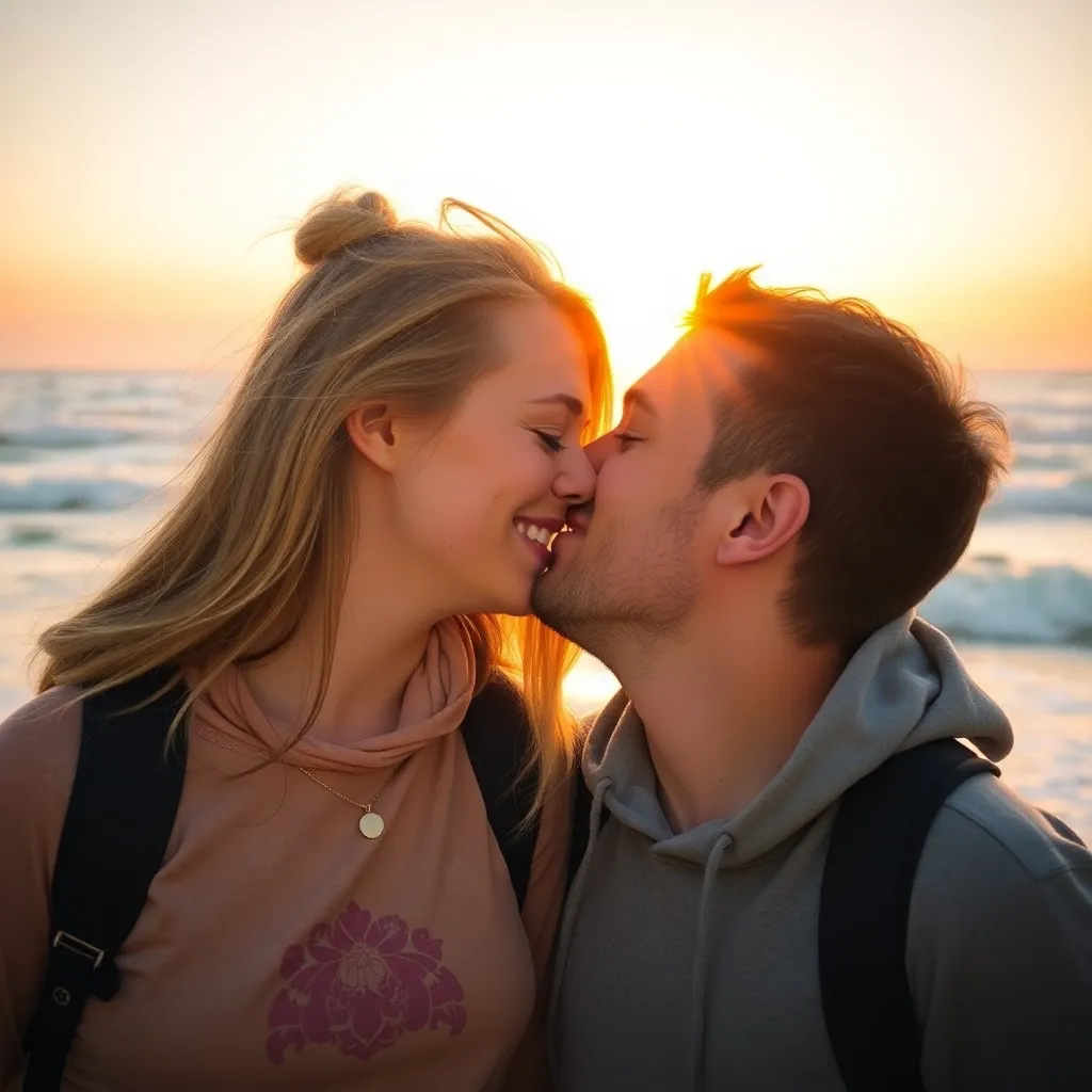 Imagine a warm summer evening, the sun dipping into the ocean. A couple, hand in hand, standing on the beach, feeling the gentle breeze. As they gaze into each other's eyes, their lips meet in a tender kiss, the sound of the waves crashing in the background. Generate an image of this romantic moment.