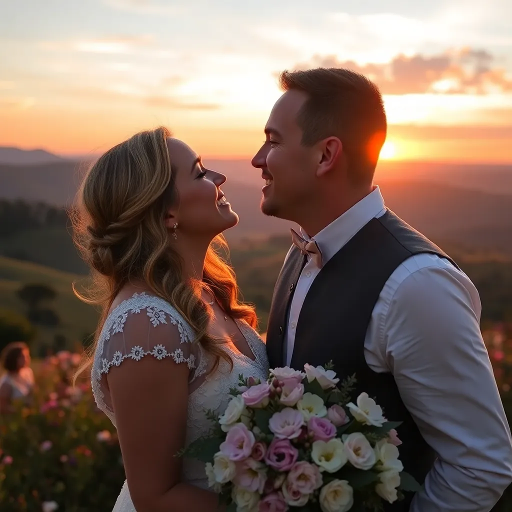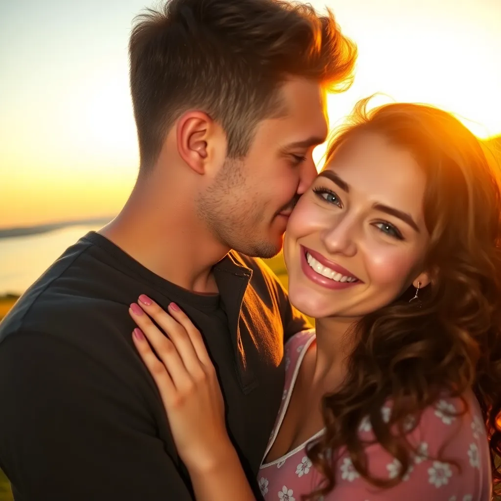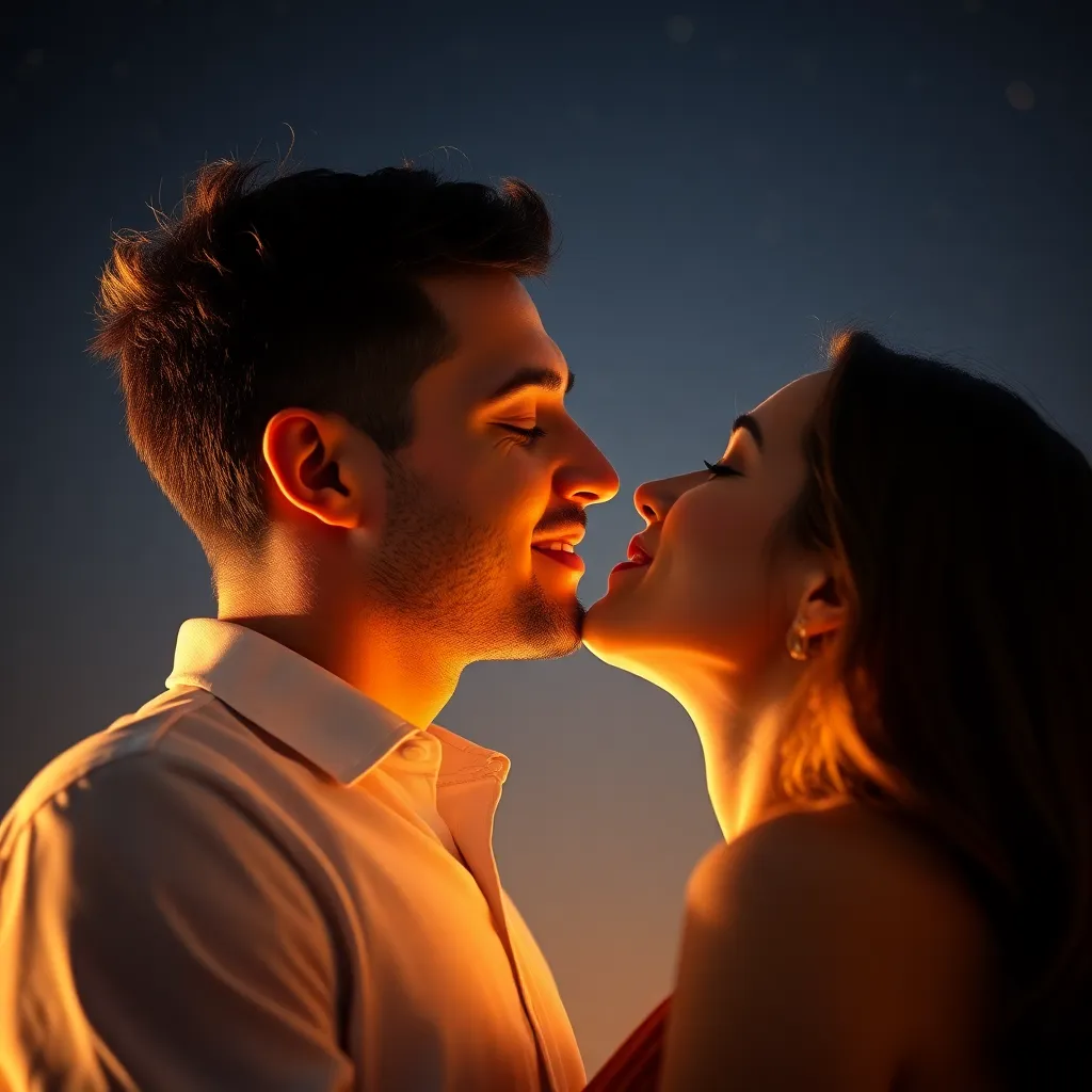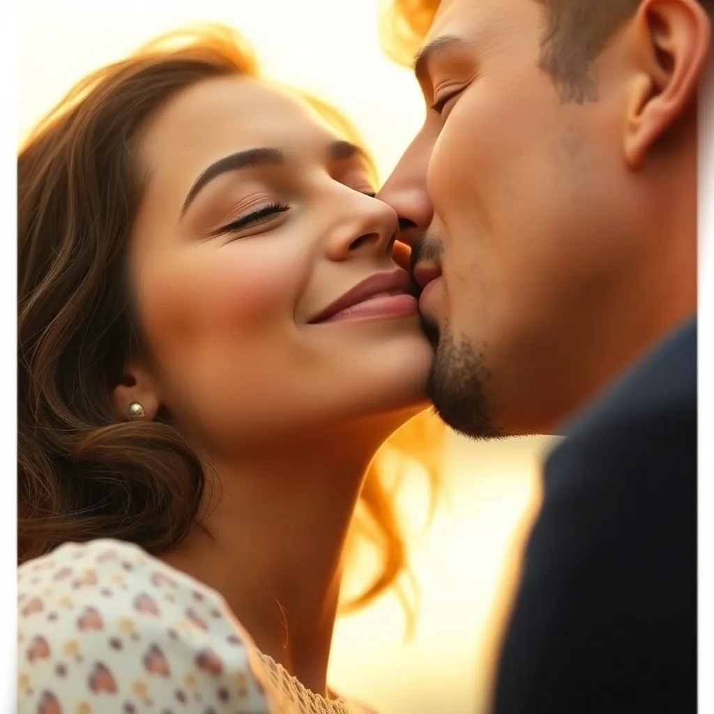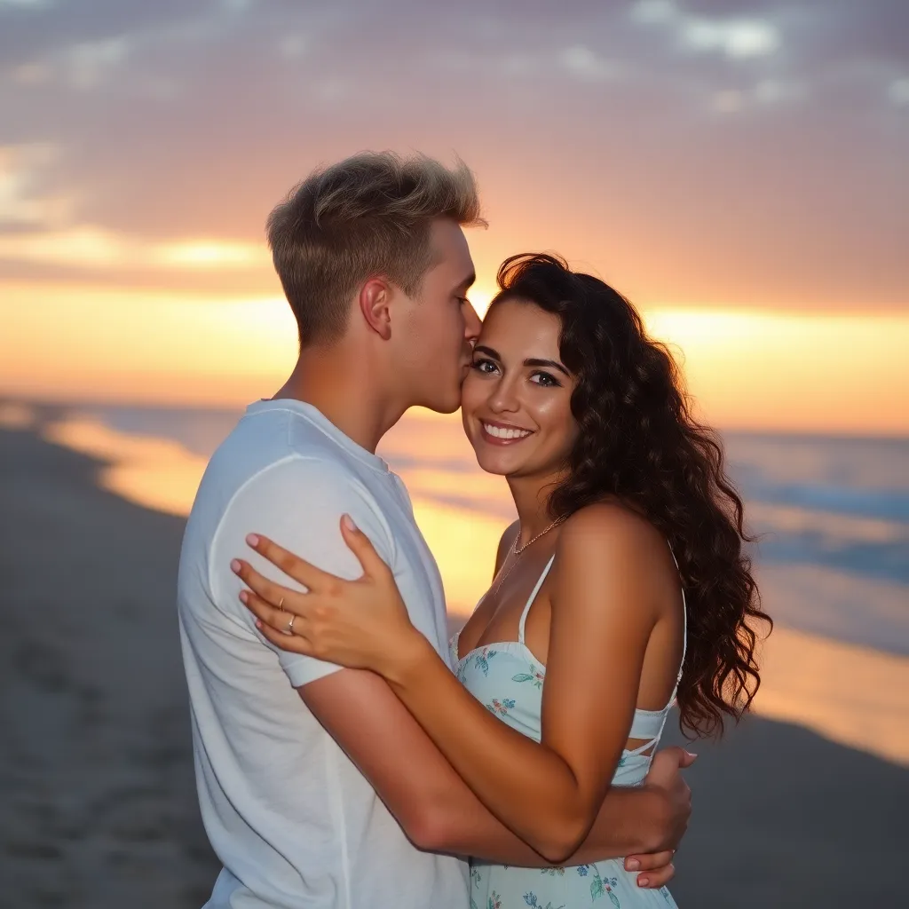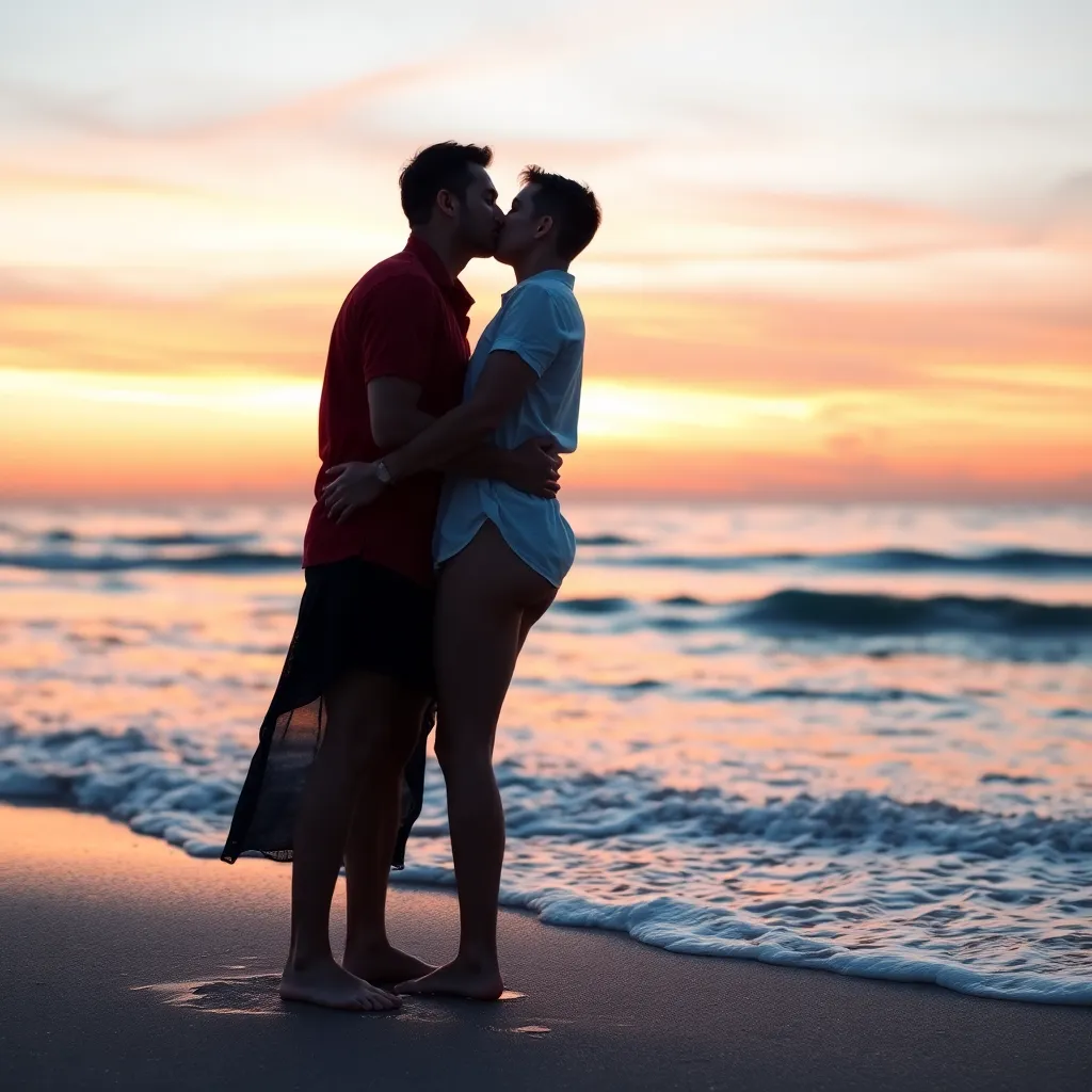 Imagine a warm summer evening, the sun dipping into the ocean. A couple, hand in hand, standing on the beach, feeling the gentle breeze. As they gaze into each other's eyes, their lips meet in a tender kiss, the sound of the waves crashing in the background. Generate an image of this romantic moment.