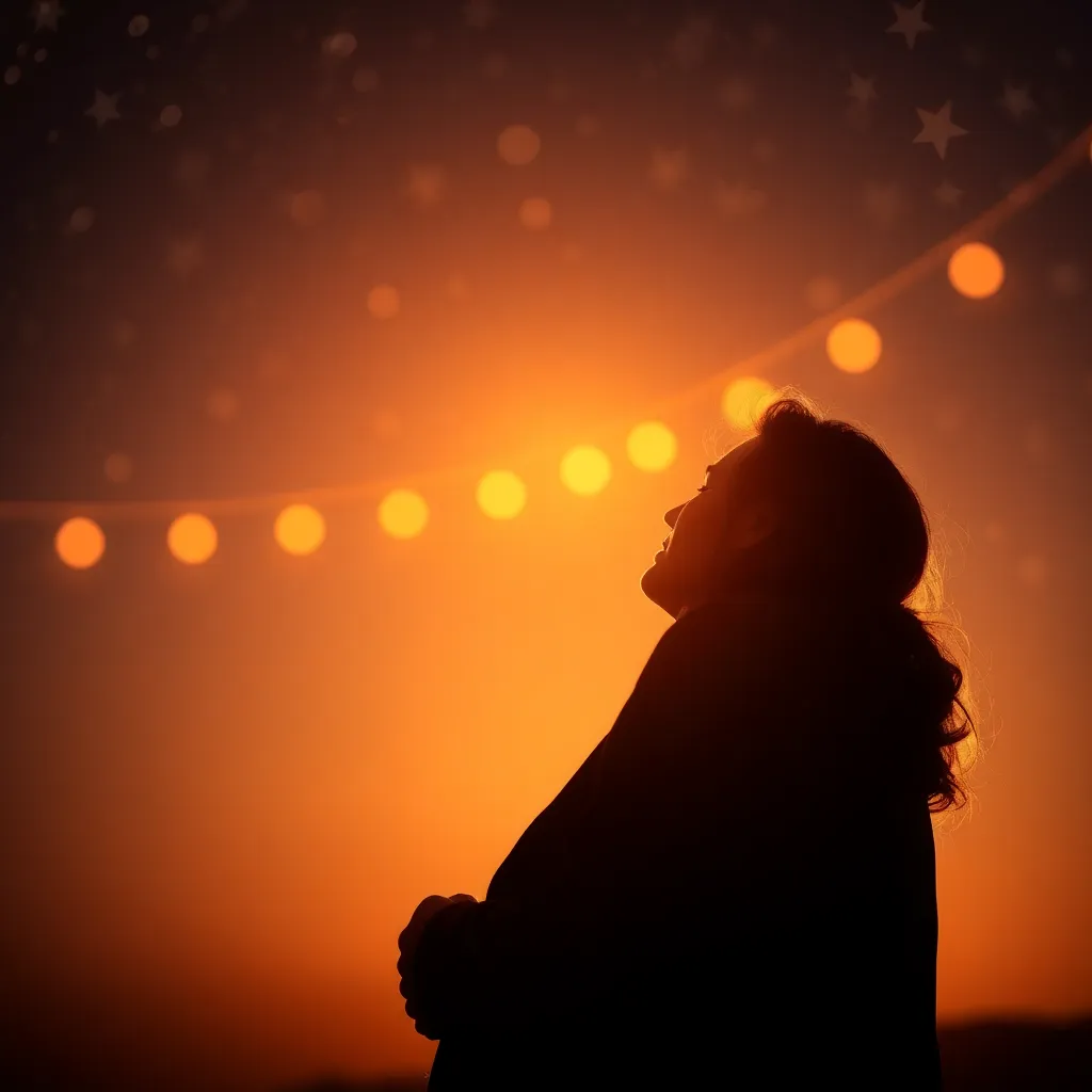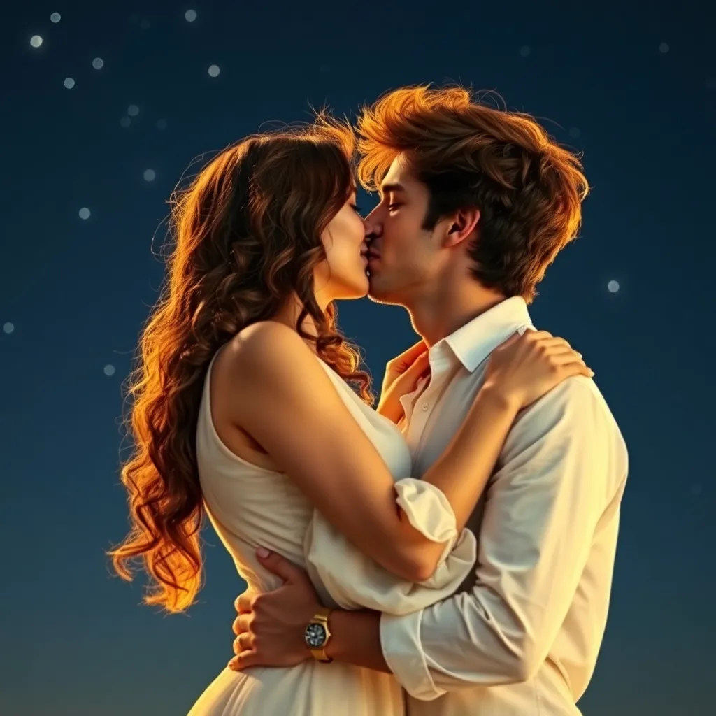 Generate an image of a romantic couple embracing and sharing a tender kiss under a starry night sky. The woman has long, curly brown hair and is wearing a flowing white dress. The man has short, messy brown hair and is dressed in a crisp white shirt. Capture the intimate moment with a warm, golden glow.