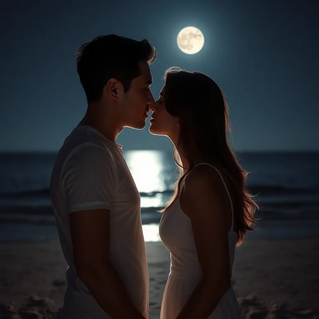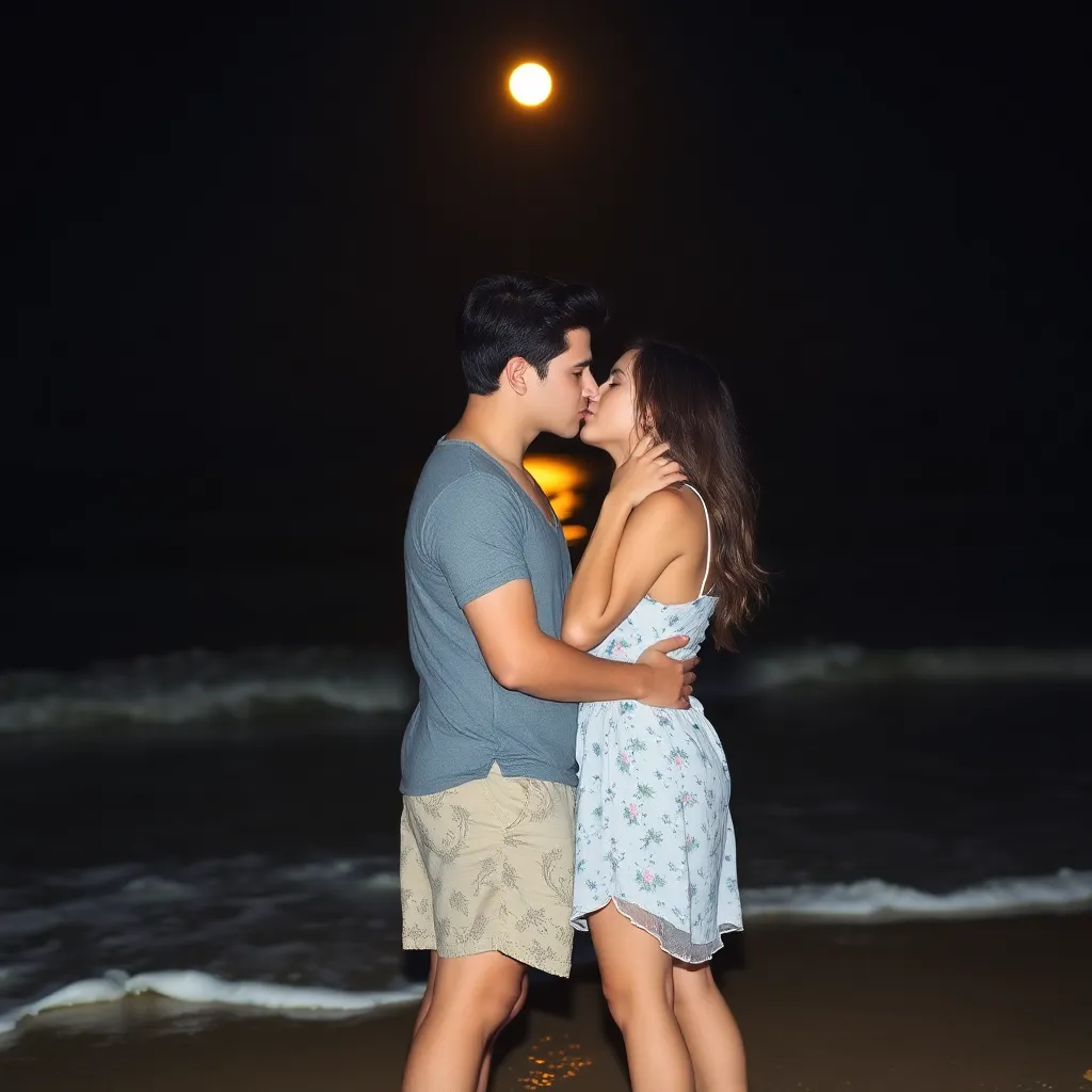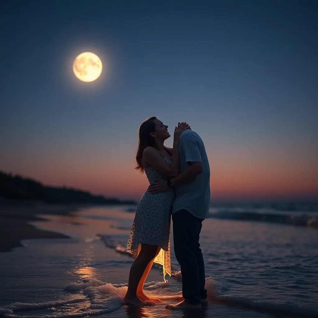 Imagine a romantic evening on a moonlit beach. A couple, Emily and Jack, share a tender kiss as the waves gently lap at their feet. The soft glow of the moon illuminates their smiling faces, capturing the magic of their love. Generate an AI image that conveys the intimacy and joy of this special moment.