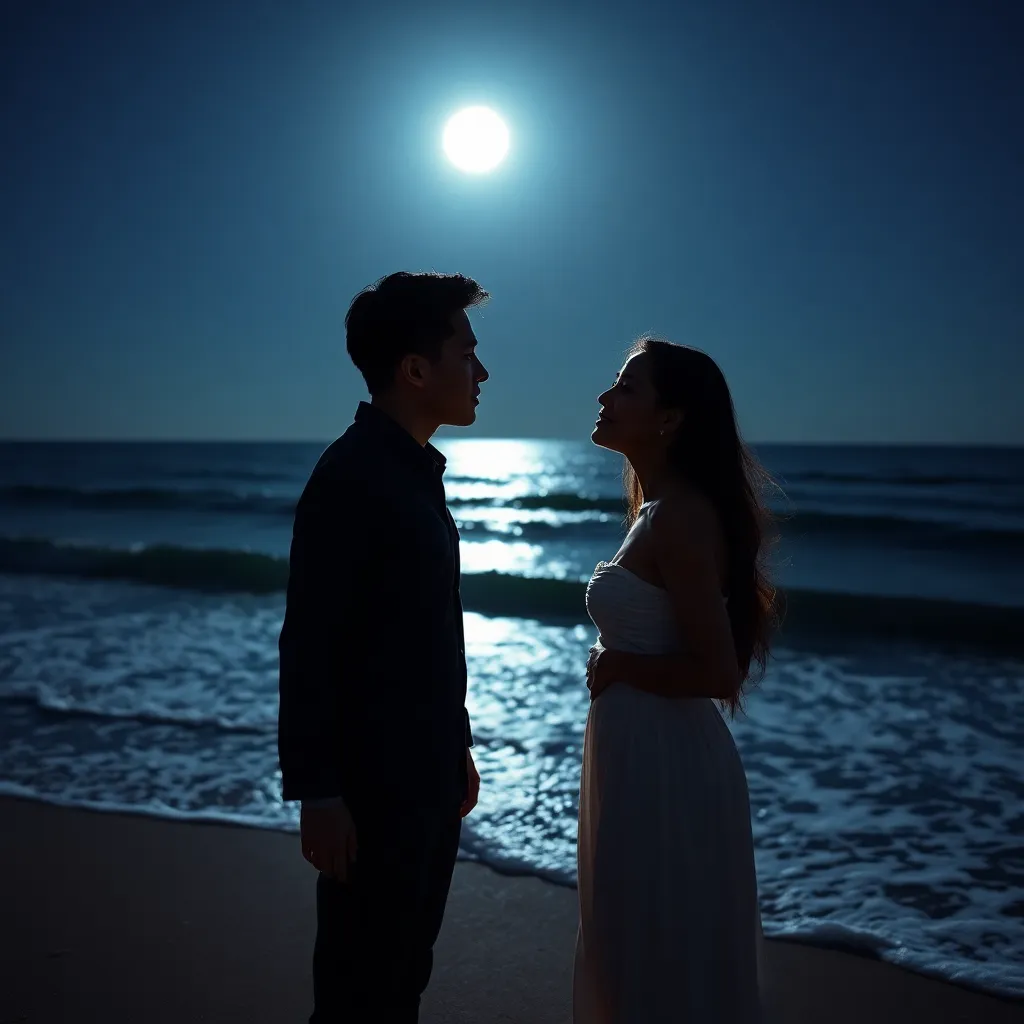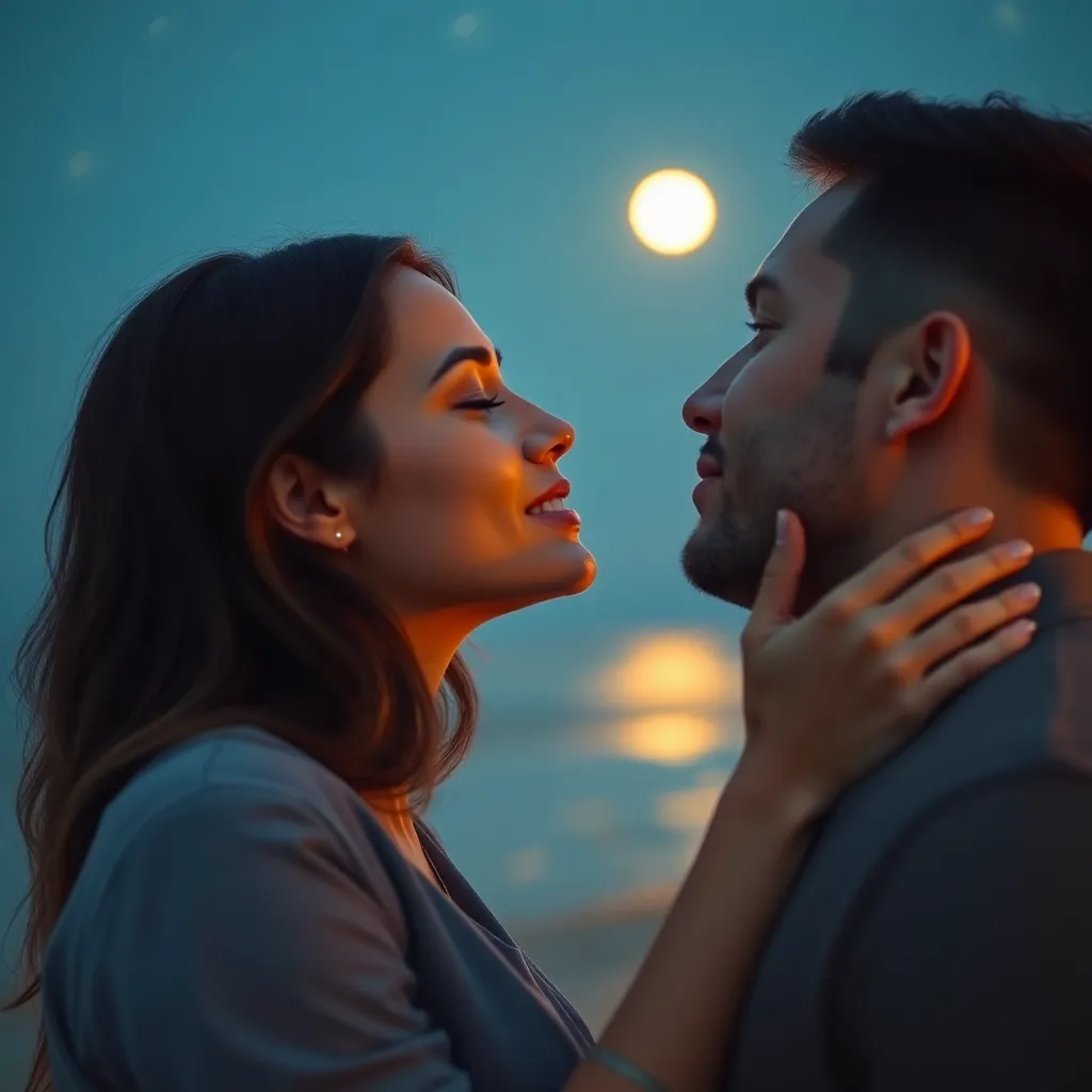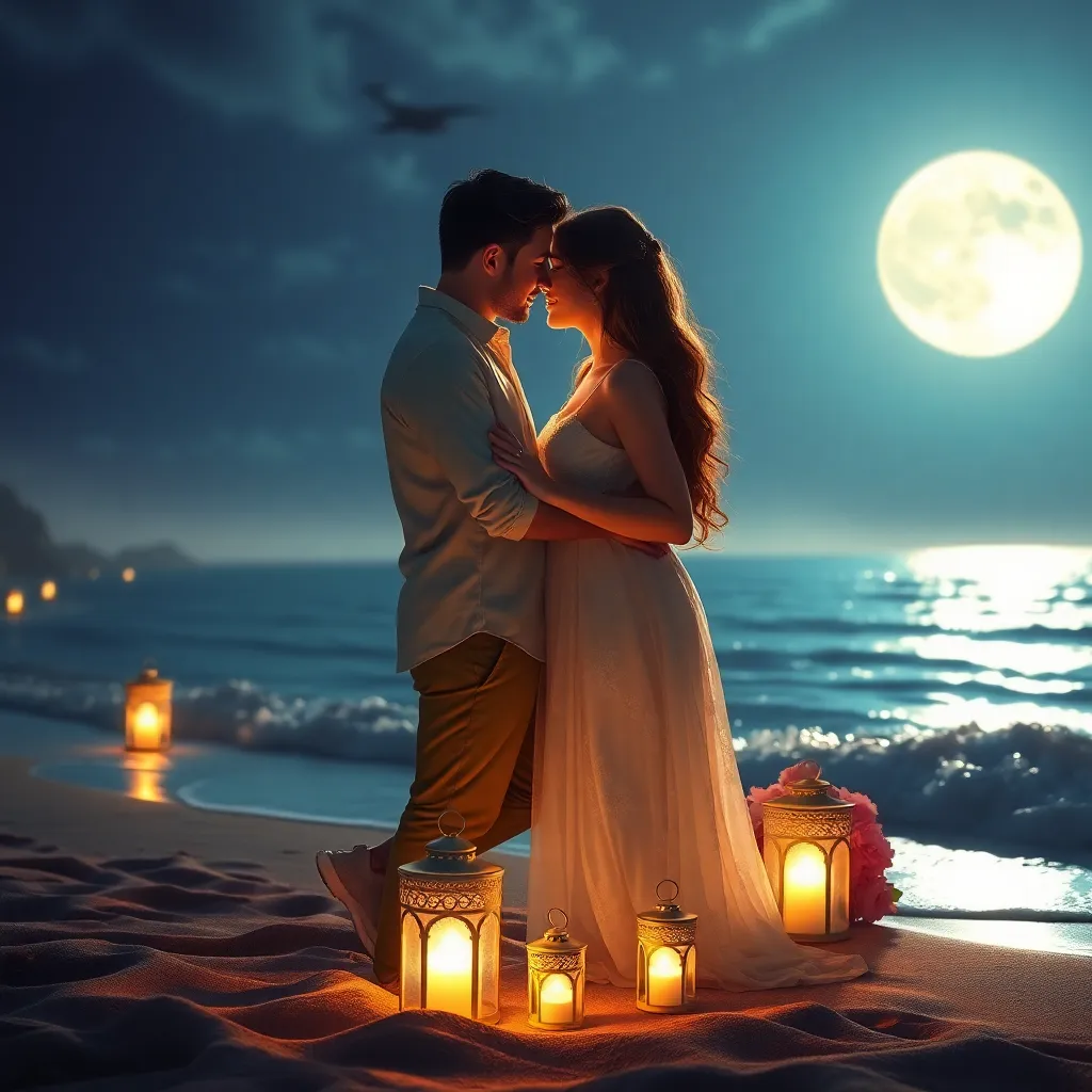 Imagine a romantic evening on a moonlit beach. A couple, Emily and Jack, share a tender kiss as the waves gently lap at their feet. The soft glow of the moon illuminates their smiling faces, capturing the magic of their love. Generate an AI image that conveys the intimacy and joy of this special moment.