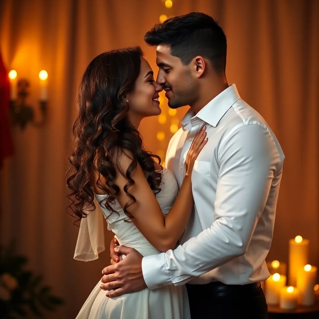Generate an image of a romantic couple embracing in a warm, candlelit setting. The woman has long, curly brown hair and bright blue eyes, wearing a flowing white dress. The man has short, dark hair and a charming smile, dressed in a crisp white shirt and black pants. Capture the tender moment when their lips meet.