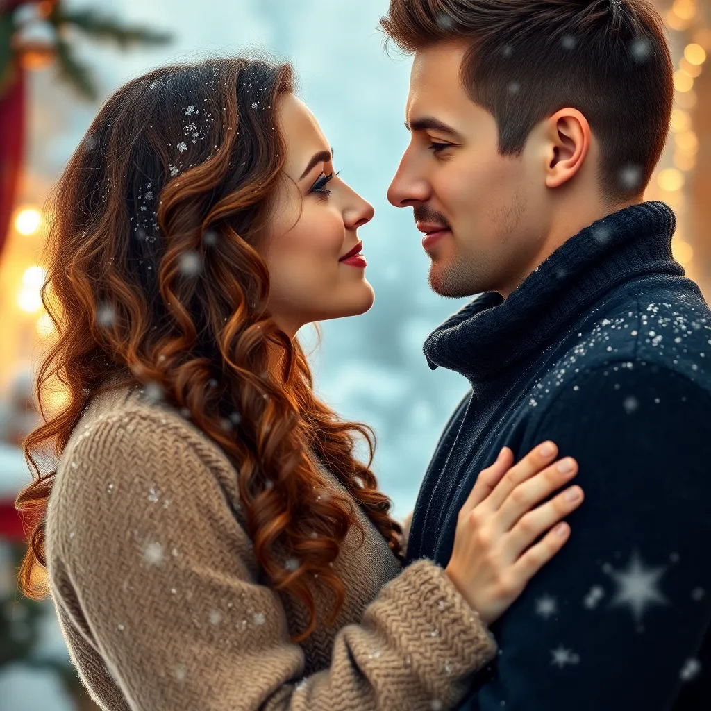 Generate an image of a romantic couple embracing in a cozy winter wonderland setting, with snowflakes gently falling around them. The woman has long, curly brown hair and bright green eyes, while the man has chiseled features and a charming smile. Capture the tender moment when their lips first touch.