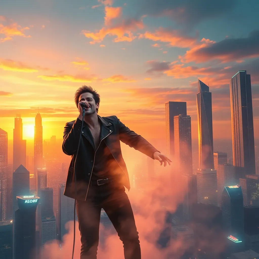 Imagine a futuristic cityscape at sunset, with a holographic concert taking place in the heart of the metropolis. The lead singer, a charismatic androgyne, is belting out a powerful ballad, surrounded by swirling lights and smoke. Generate an image that captures the essence of this electrifying performance.