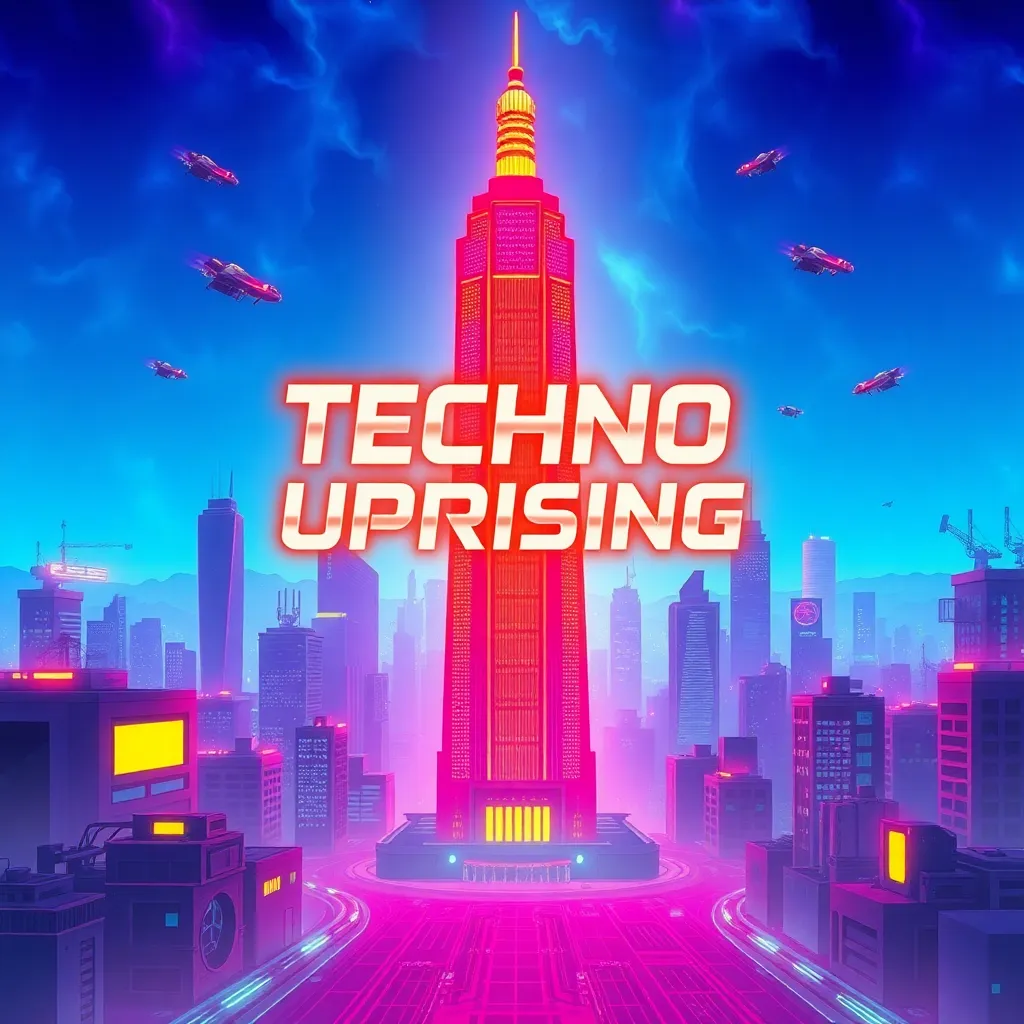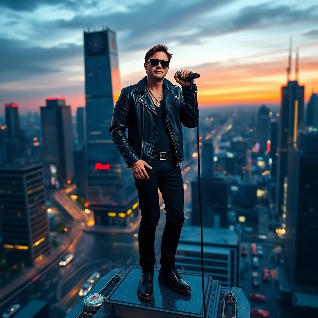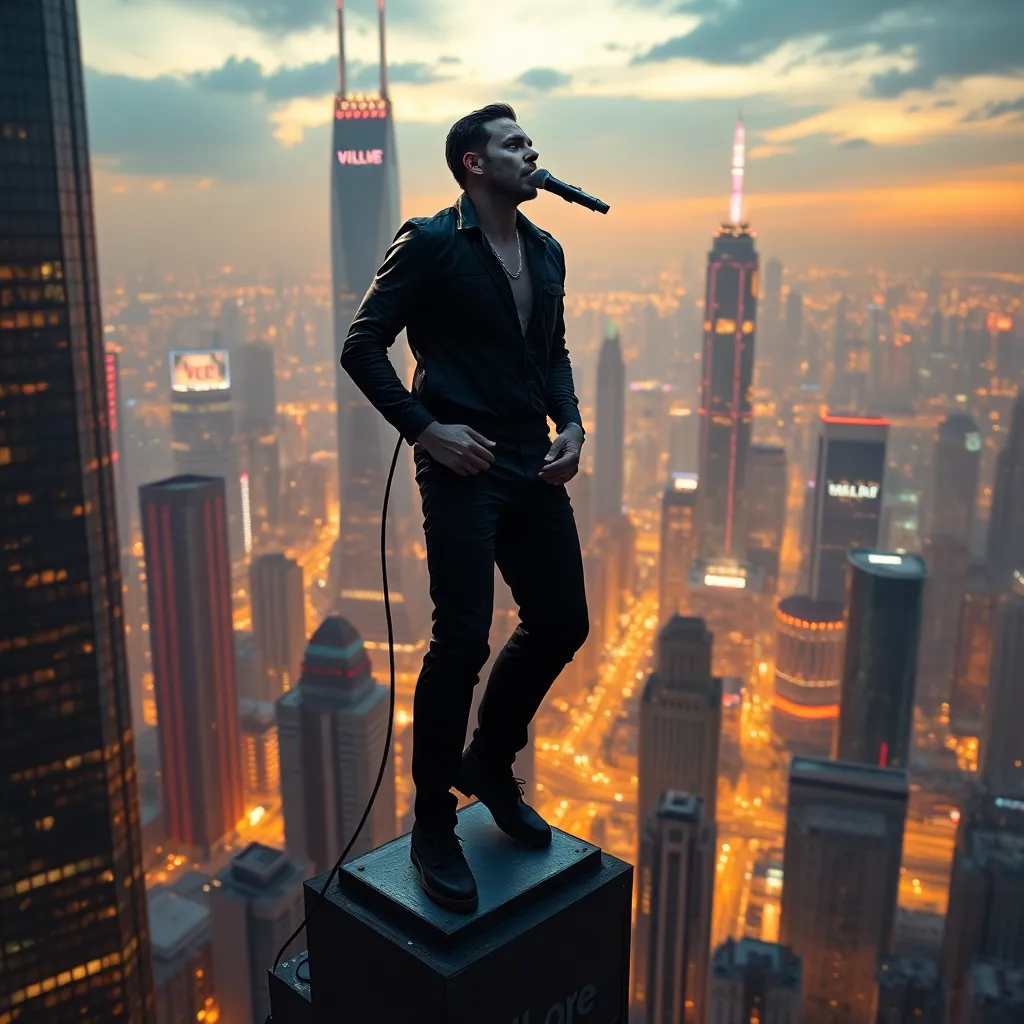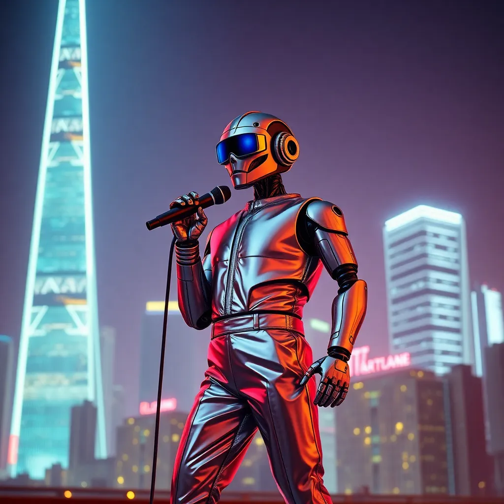 Imagine a futuristic cityscape with a sleek, neon-lit skyscraper in the background. A charismatic robot, dressed in a shimmering jumpsuit, stands confidently in front of the building, microphone in hand, belting out a catchy tune with a retro-futuristic vibe. Generate an AI image that captures this futuristic scene.
