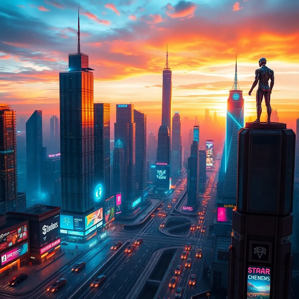 Create an image of a futuristic cityscape at sunset, with towering skyscrapers and flying cars zipping by. The atmosphere is vibrant and energetic, with neon lights and holographic advertisements illuminating the city. Incorporate a futuristic robot standing atop a skyscraper, looking out over the city with a sense of wonder.