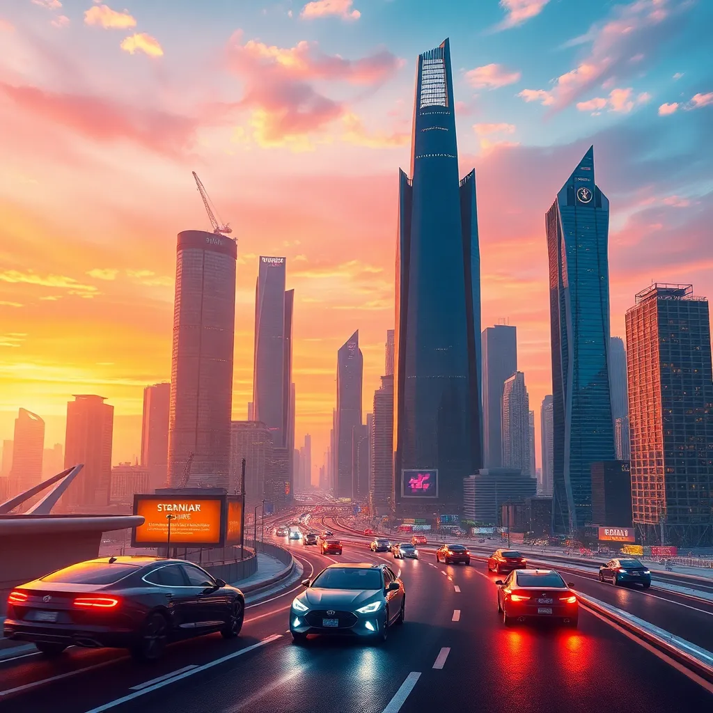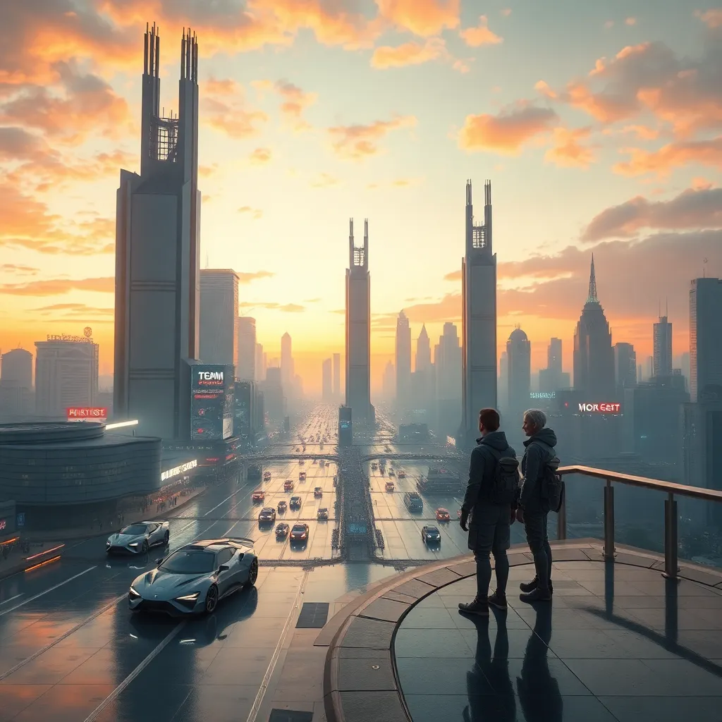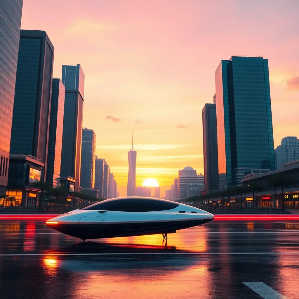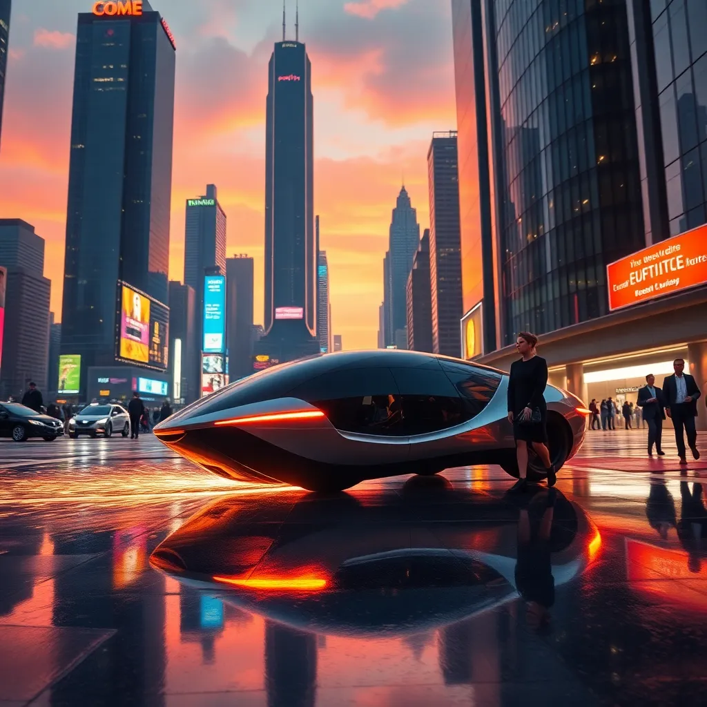 Create a futuristic cityscape at sunset, with towering skyscrapers and neon lights reflecting off the wet pavement. A sleek, silver hovercar zooms by, leaving a trail of sparks behind it. The city's inhabitants, dressed in stylish attire, walk with confidence, their faces illuminated by the vibrant urban glow.