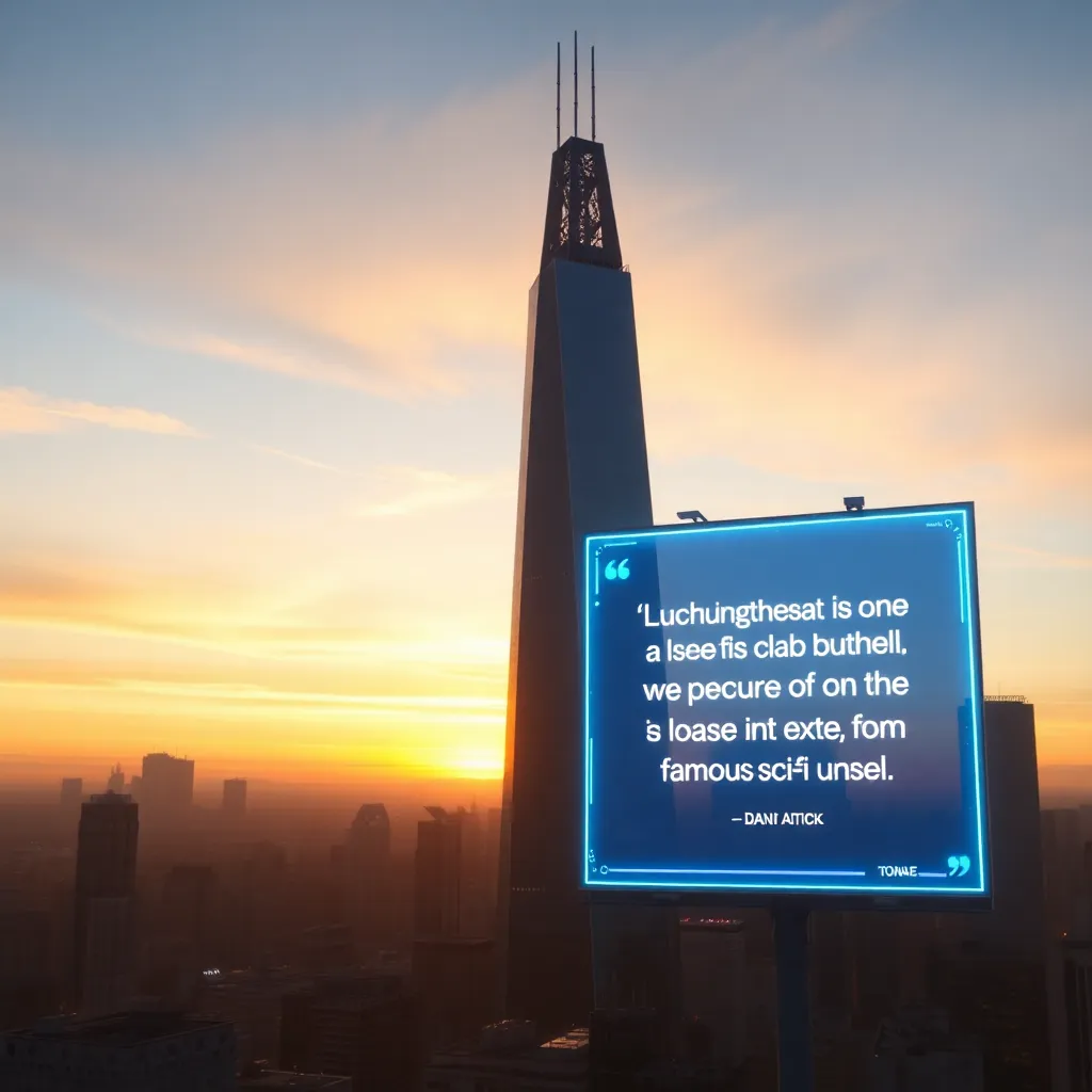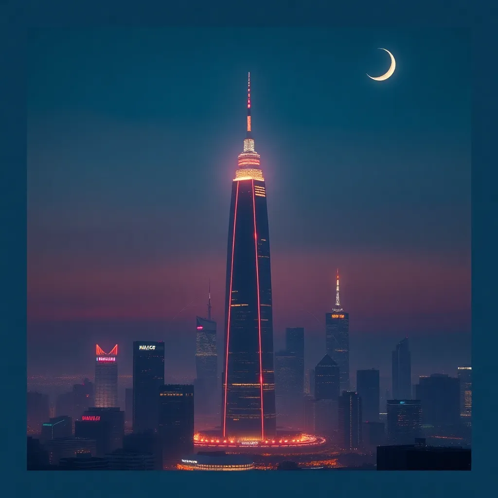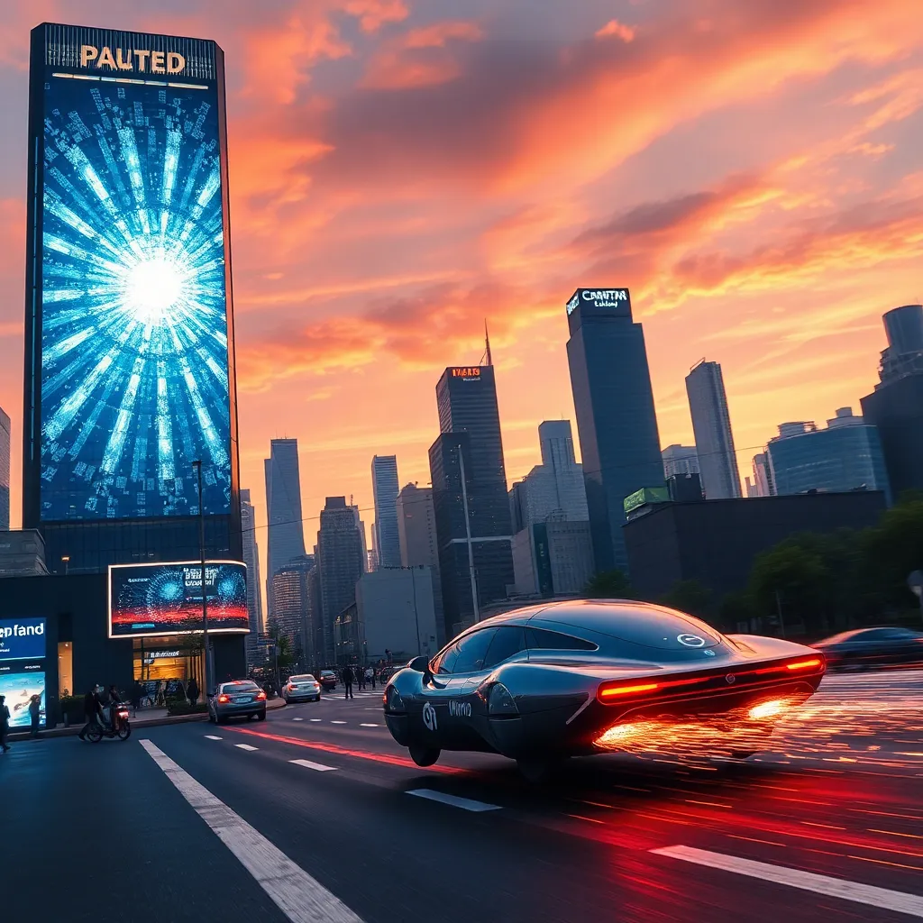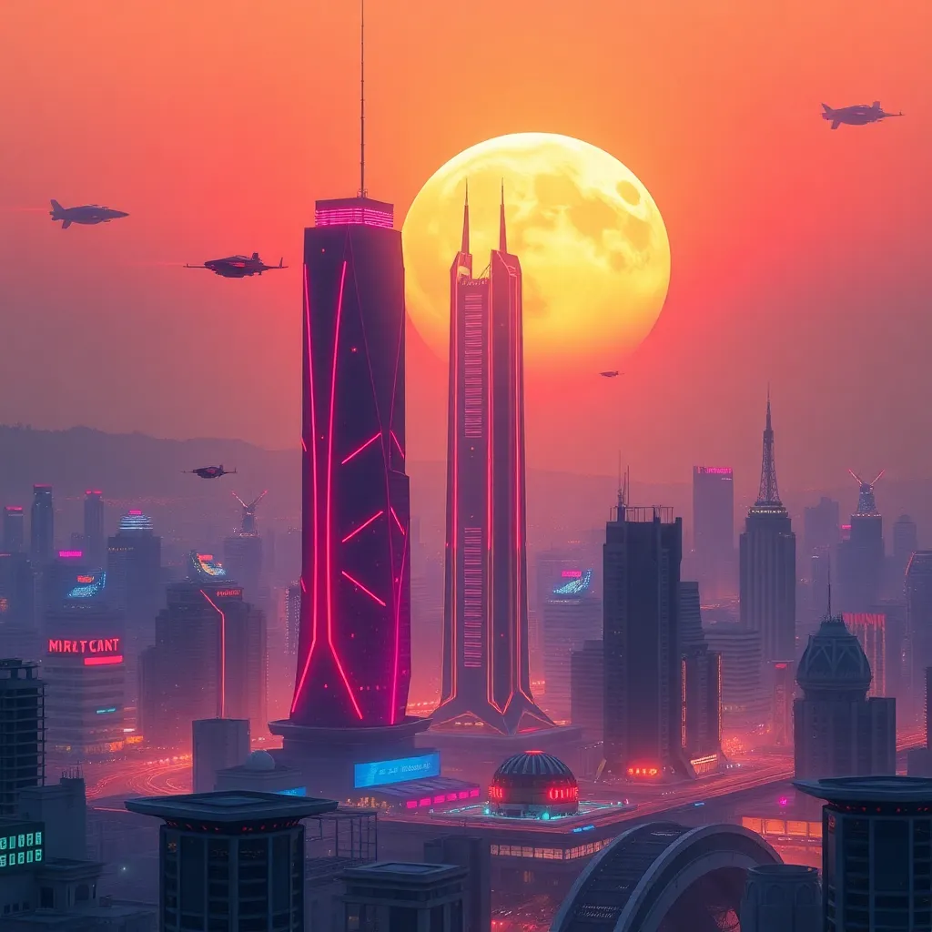 Create an AI-generated image of a futuristic cityscape at sunset, with a bold, neon-lit skyscraper in the center, surrounded by flying cars and robots, and a subtle hint of a giant, glowing moon in the background. The atmosphere should be vibrant and energetic, with a sense of innovation and progress.