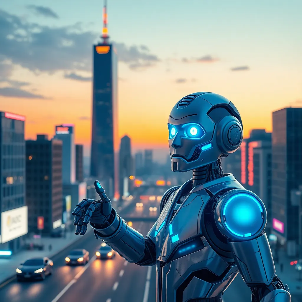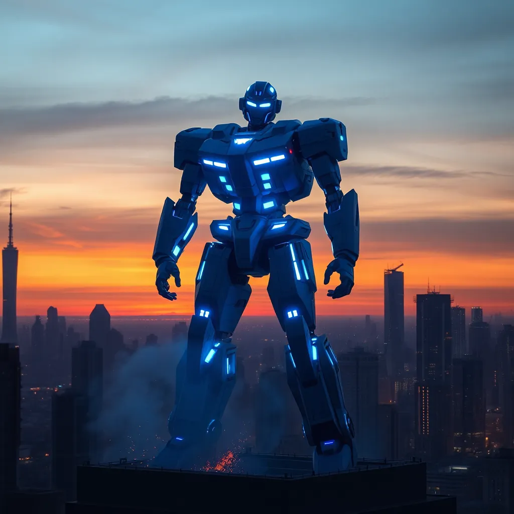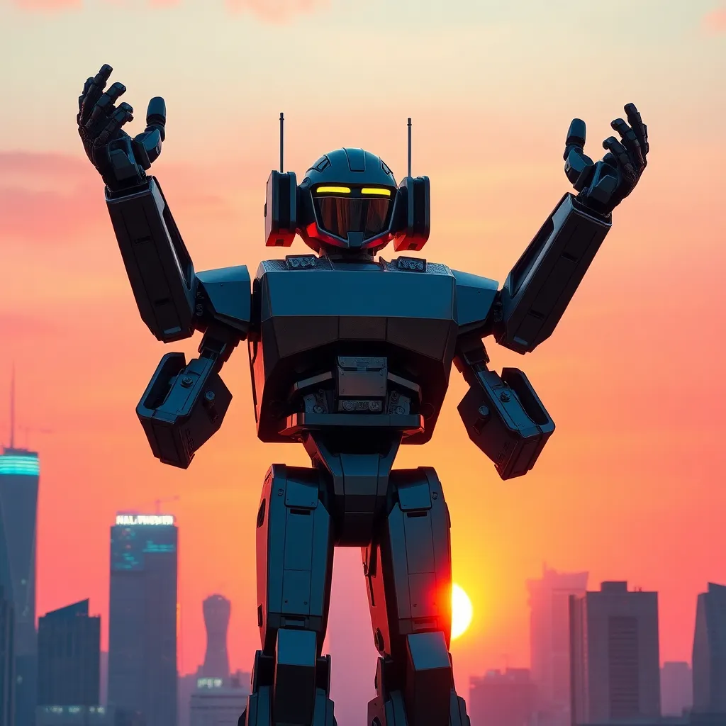 Create an AI-generated image of a futuristic cityscape at sunset, with a giant robot standing tall in the foreground, its mechanical arms raised in celebration. The city lights are reflected in the robot's metallic body, as a bright orange and pink sky sets behind. The atmosphere is vibrant and energetic.