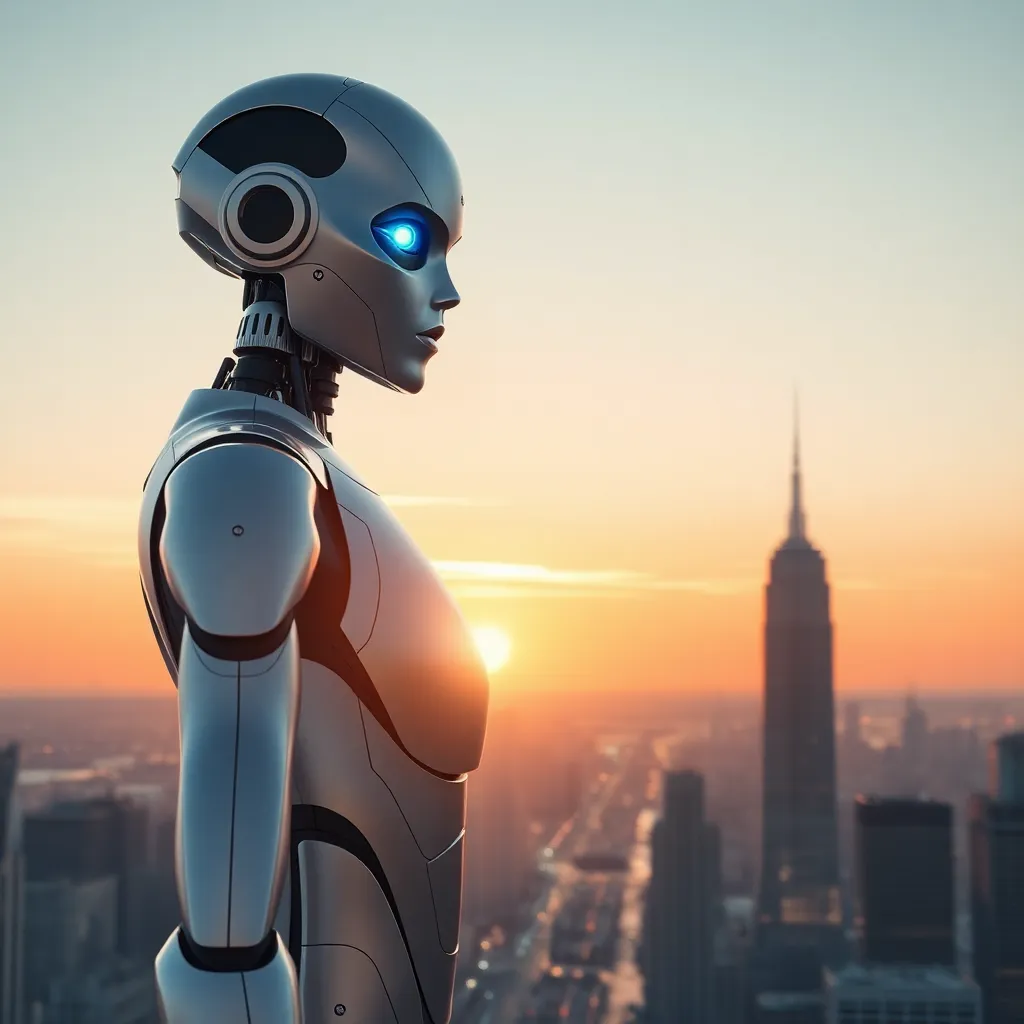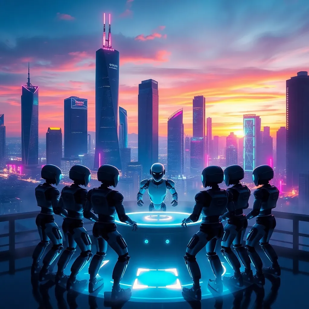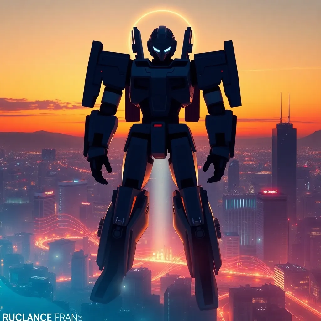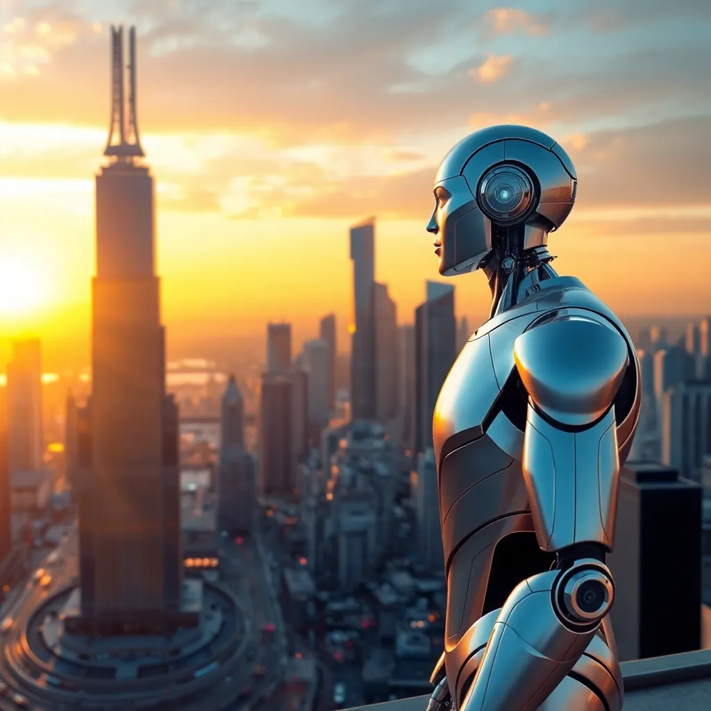 Create an AI-generated image of a futuristic cityscape at sunset, with a giant robot standing tall in the foreground, its mechanical arms raised in celebration. The city lights are reflected in the robot's metallic body, as a bright orange and pink sky sets behind. The atmosphere is vibrant and energetic.