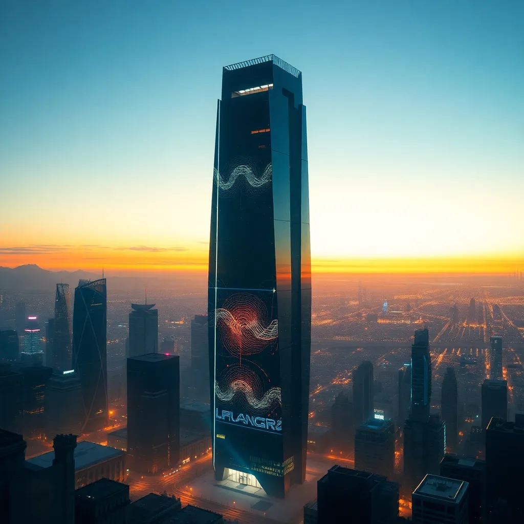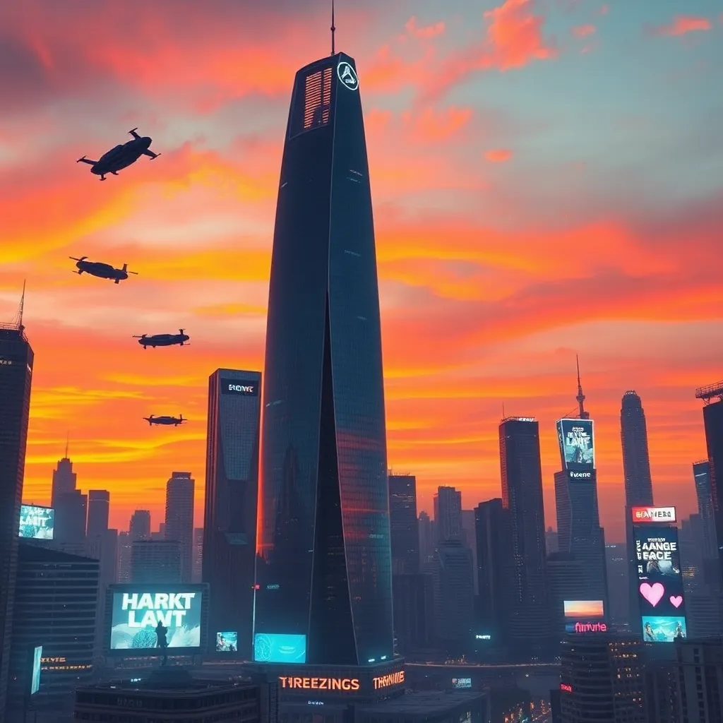 Create a futuristic cityscape at sunset, with a sleek skyscraper in the foreground, surrounded by a haze of neon lights and a vast, glowing metropolis in the distance. The building's facade should feature a holographic display with a futuristic, pulsing design, while the city's inhabitants are going about their evening routines.