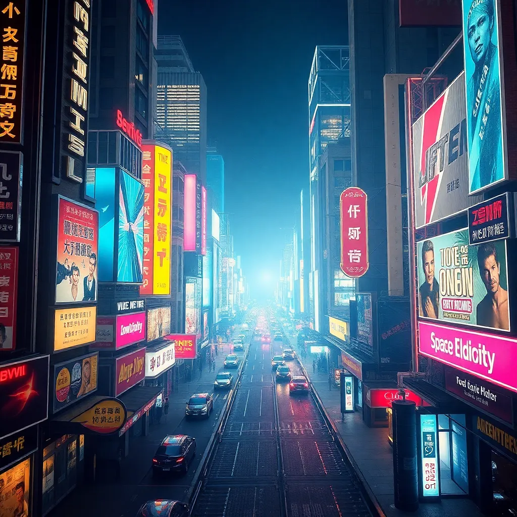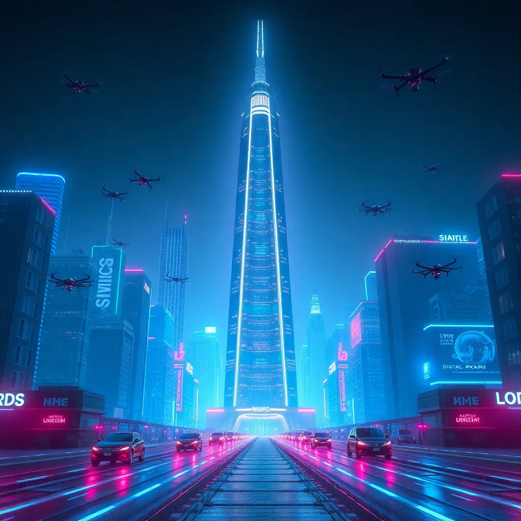 Create a futuristic cityscape with a sleek, neon-lit skyscraper in the center, surrounded by flying cars and hovering drones. Incorporate a holographic billboard displaying a mesmerizing AI-generated lip sync performance of a futuristic pop star singing 'Digital Dreams' in a futuristic, high-tech recording studio.
