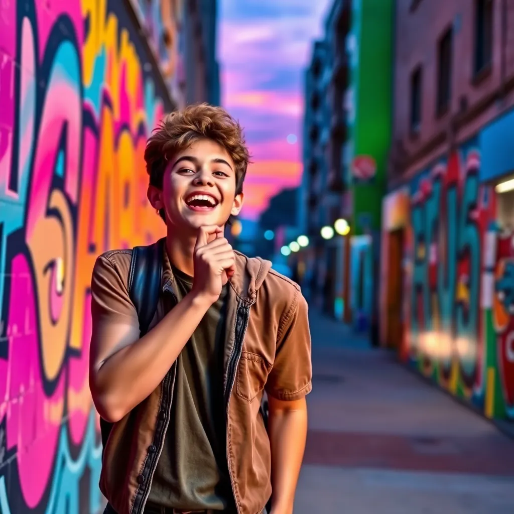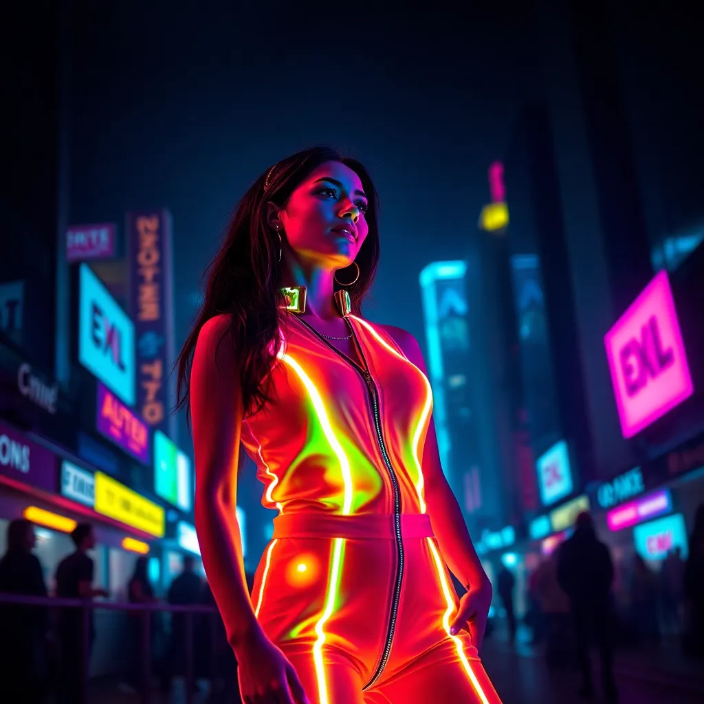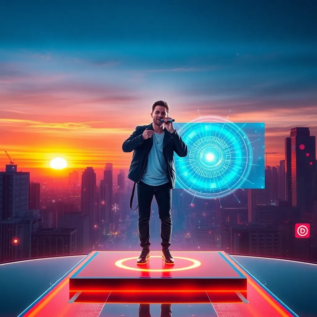 Imagine a futuristic cityscape at sunset, with a holographic concert stage in the center. A charismatic performer is lip-syncing to a catchy electronic song, surrounded by swirling lights and mesmerizing special effects. Create an AI image that captures the vibrant energy and futuristic atmosphere of this extraordinary performance.