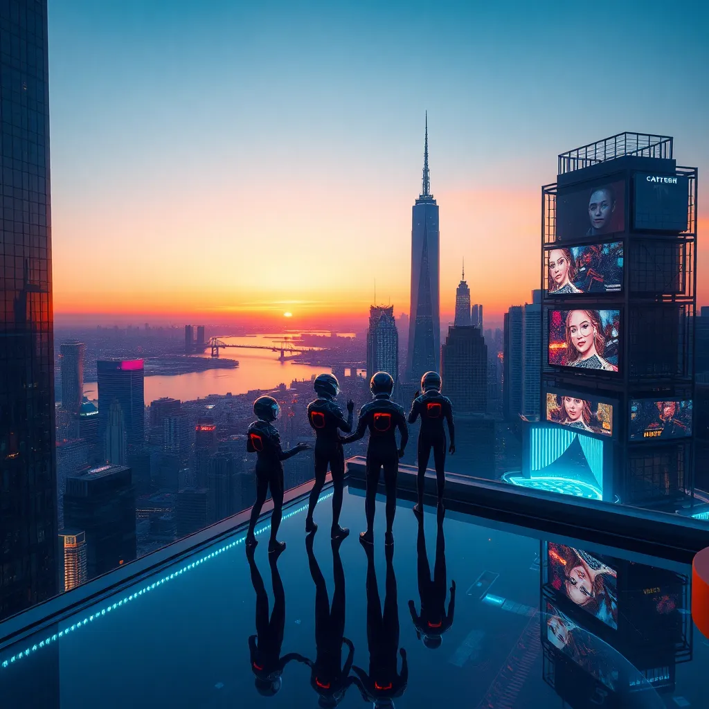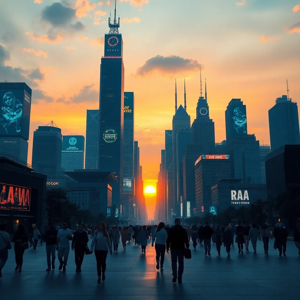 Create an image of a futuristic cityscape at sunset, with towering skyscrapers and holographic advertisements illuminating the darkening sky. Incorporate a subtle AI-generated crowd of people walking and talking, with a faint glow surrounding their faces as they gaze up at the city's majestic skyline.