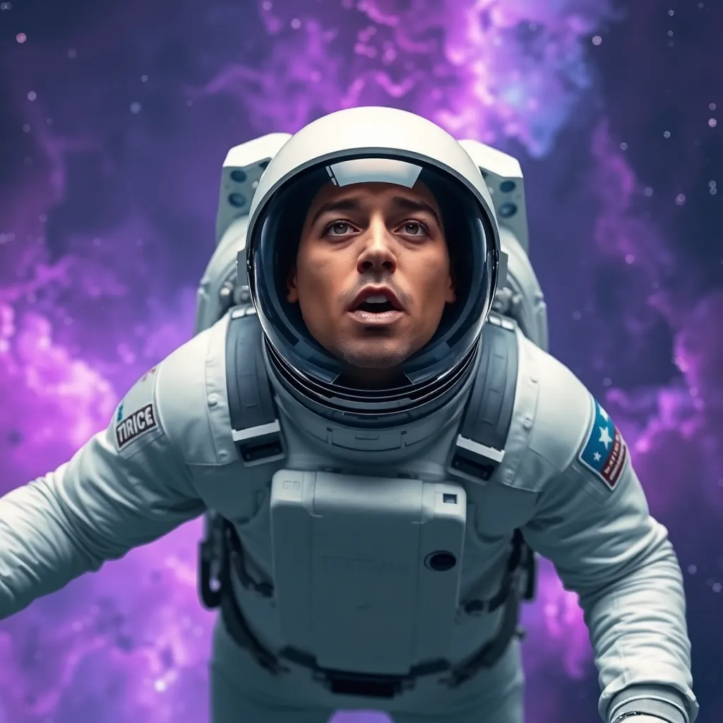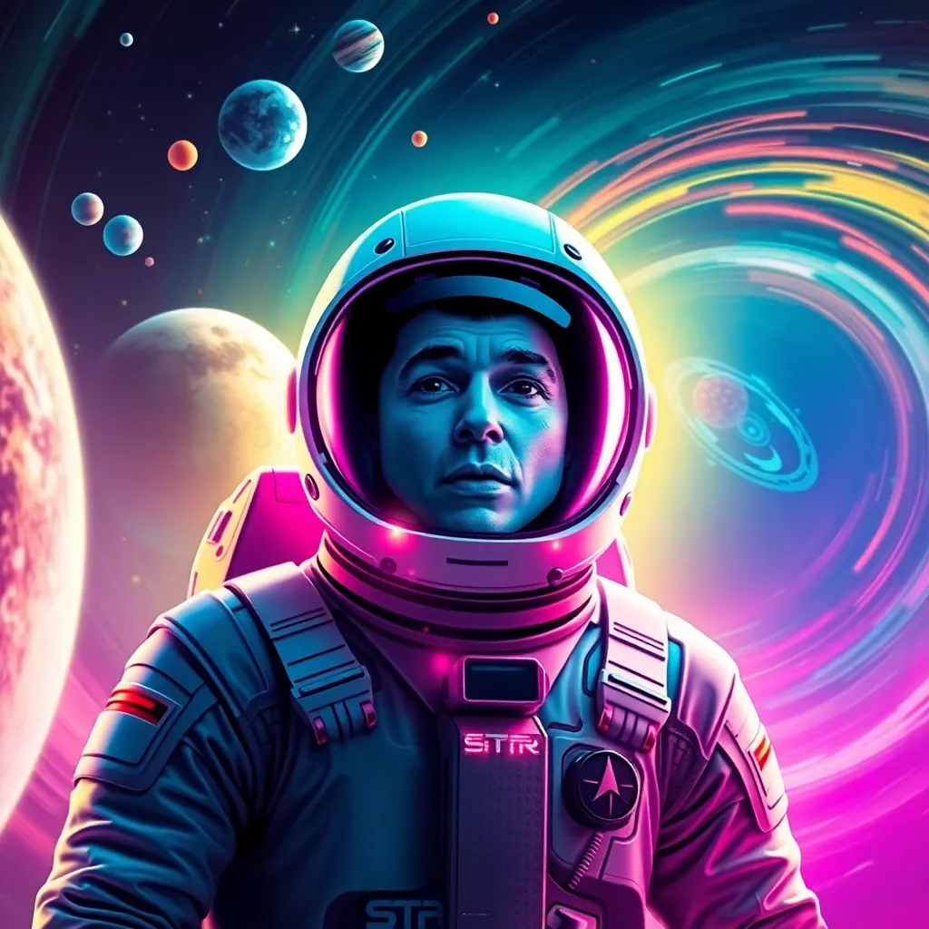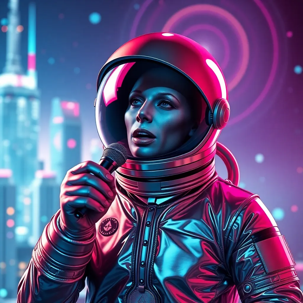 Create an AI image of a retro-futuristic astronaut lip-syncing to the iconic song 'Space Oddity' by David Bowie. The astronaut should be dressed in a shiny metallic spacesuit, with a futuristic cityscape or space station background. Incorporate neon lights and swirling stars to capture the song's otherworldly essence.