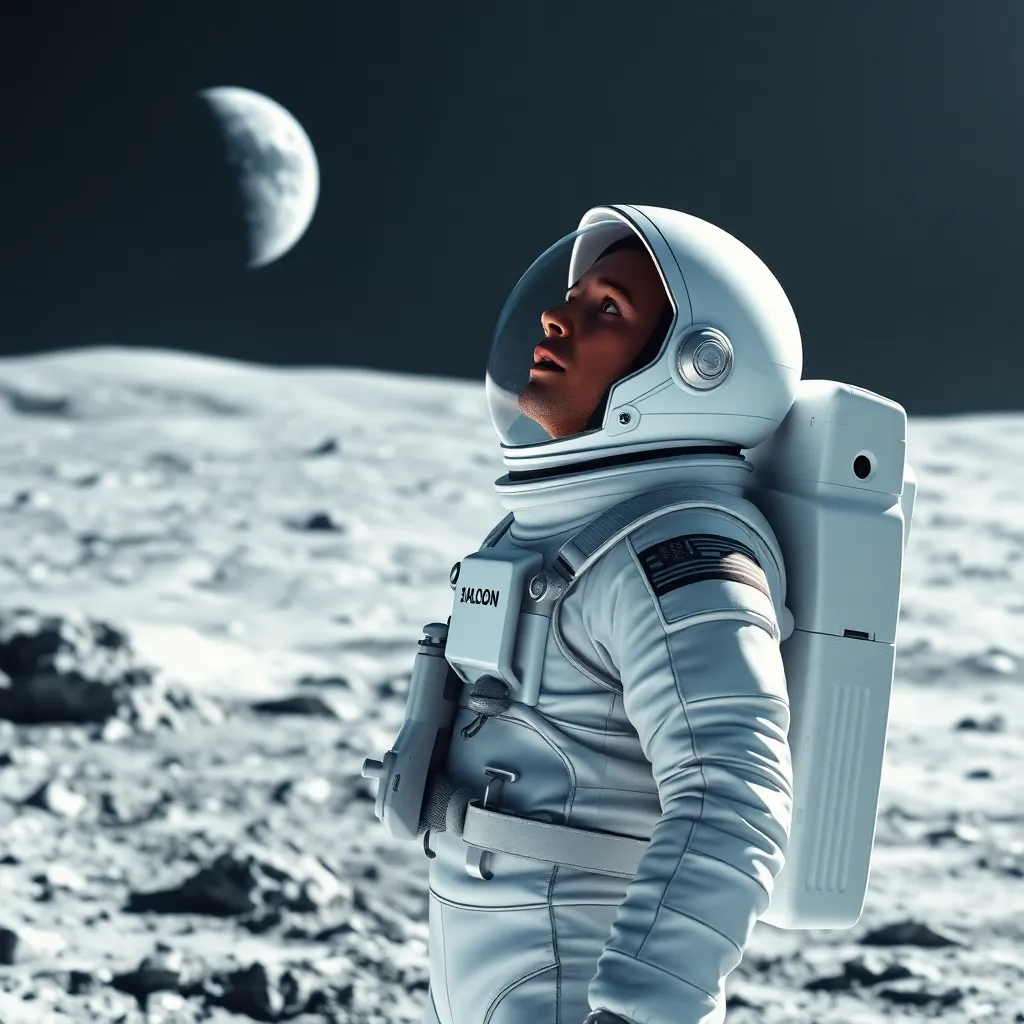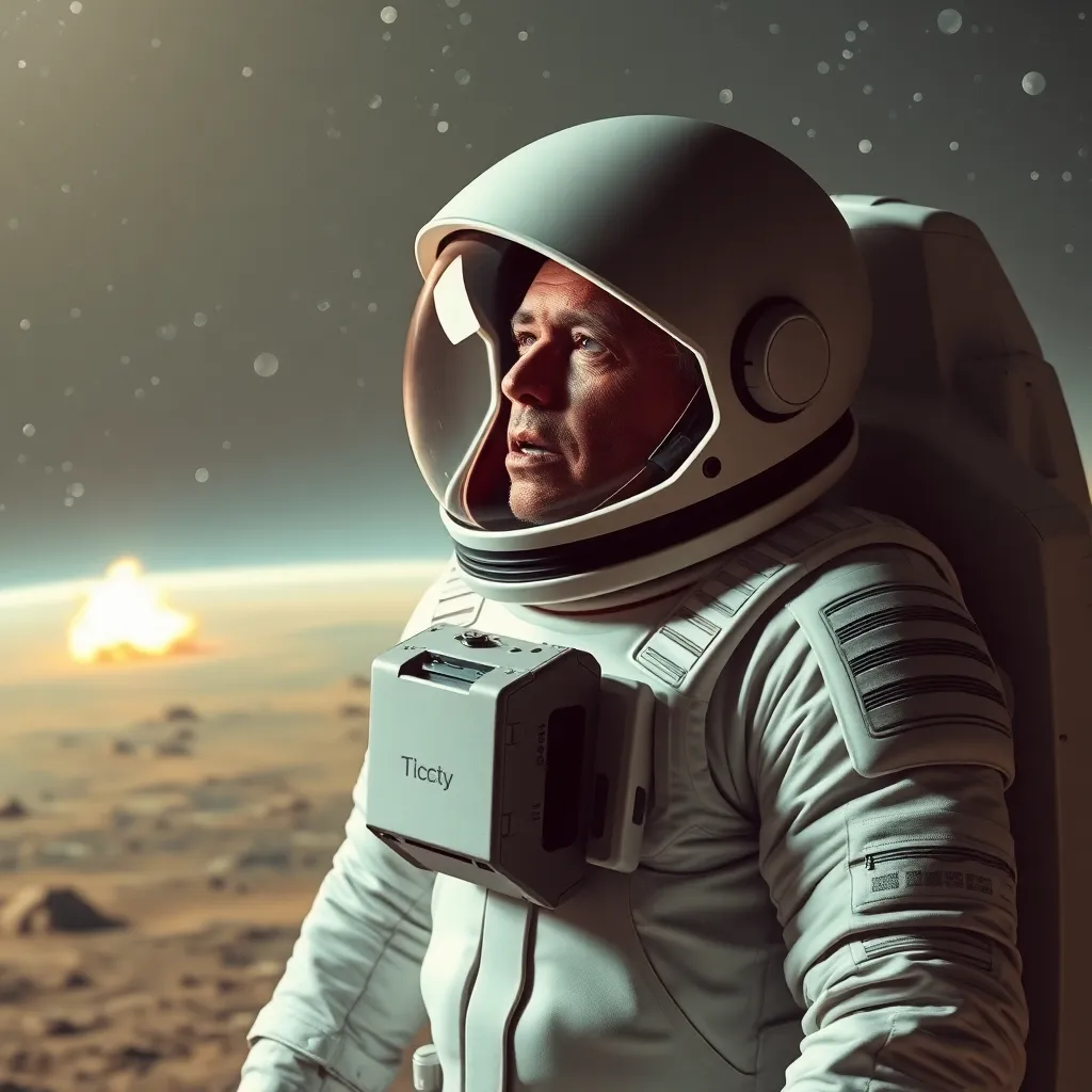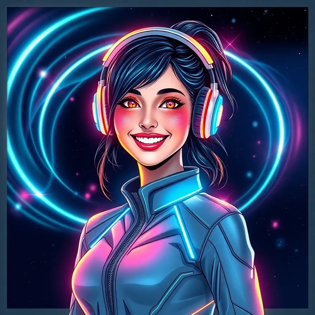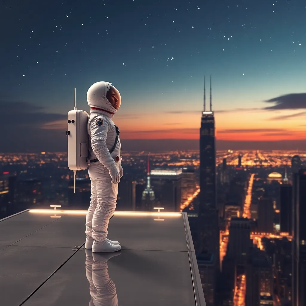 Create an AI image of a retro-futuristic astronaut lip-syncing to the iconic song 'Space Oddity' by David Bowie. The astronaut should be dressed in a shiny metallic spacesuit, with a futuristic cityscape or space station background. Incorporate neon lights and swirling stars to capture the song's otherworldly essence.