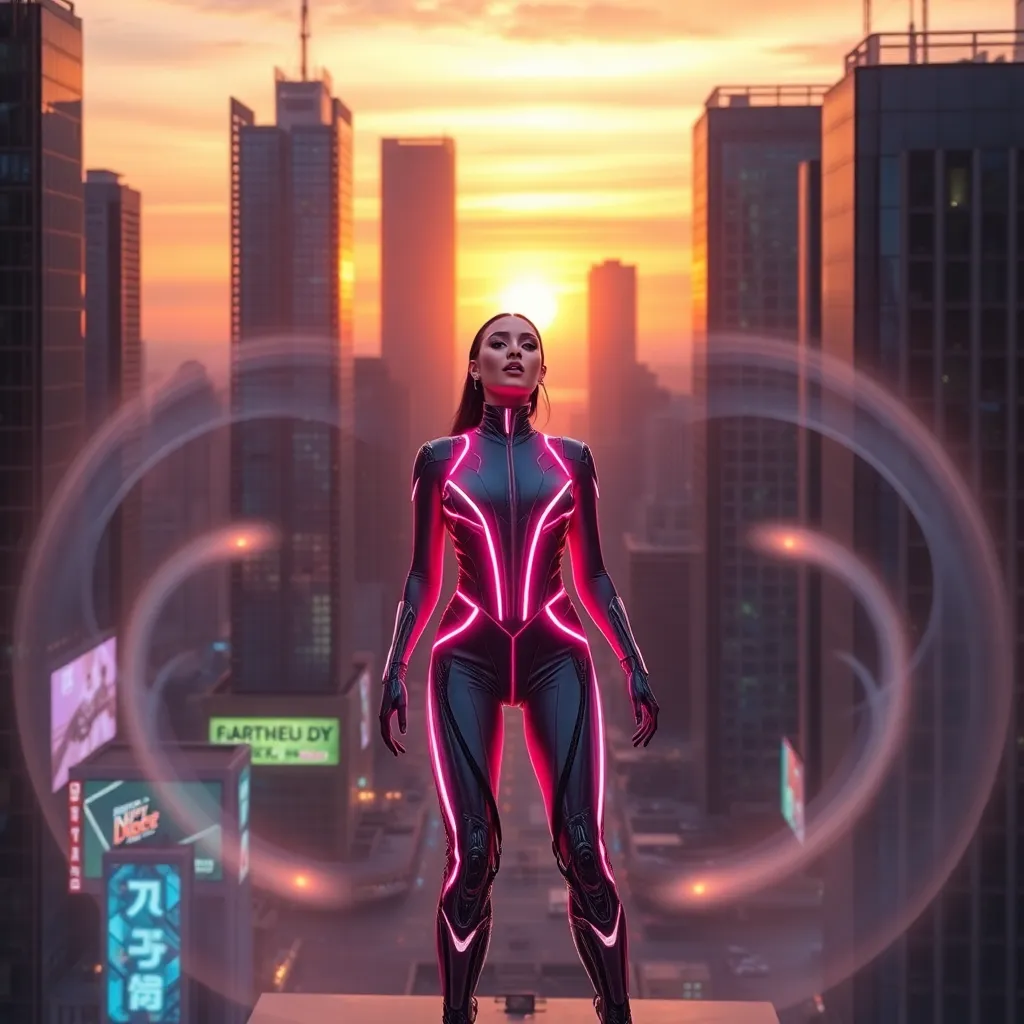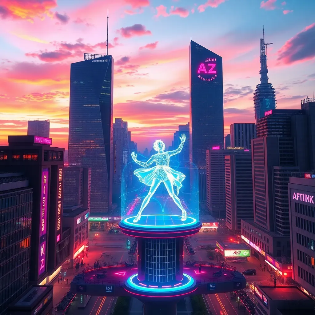 Create an AI-generated image of a futuristic cityscape at sunset, with sleek skyscrapers, neon lights, and a holographic display projecting a mesmerizing dance performance. Incorporate vibrant colors, sharp lines, and a sense of movement to capture the essence of a futuristic world where technology meets art.