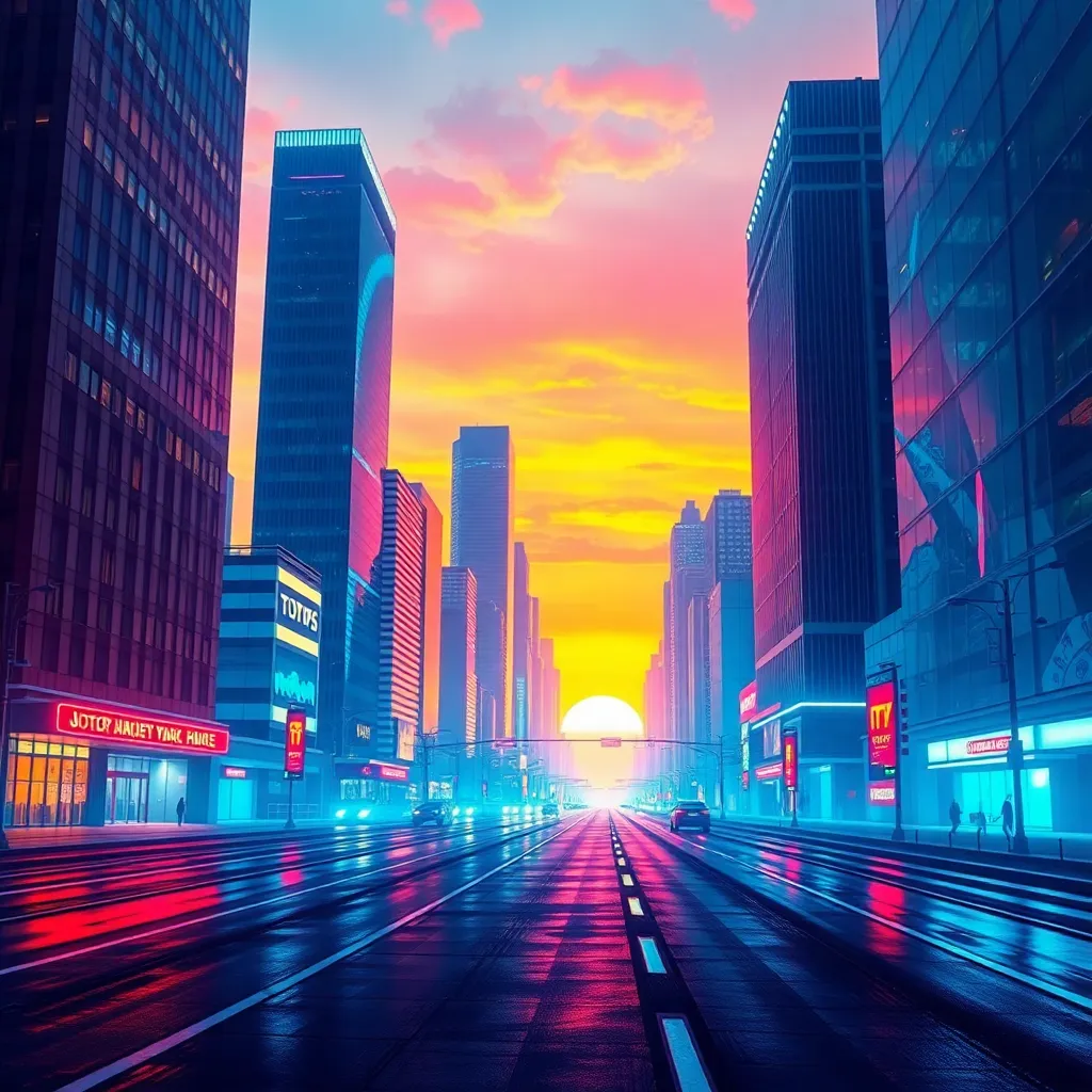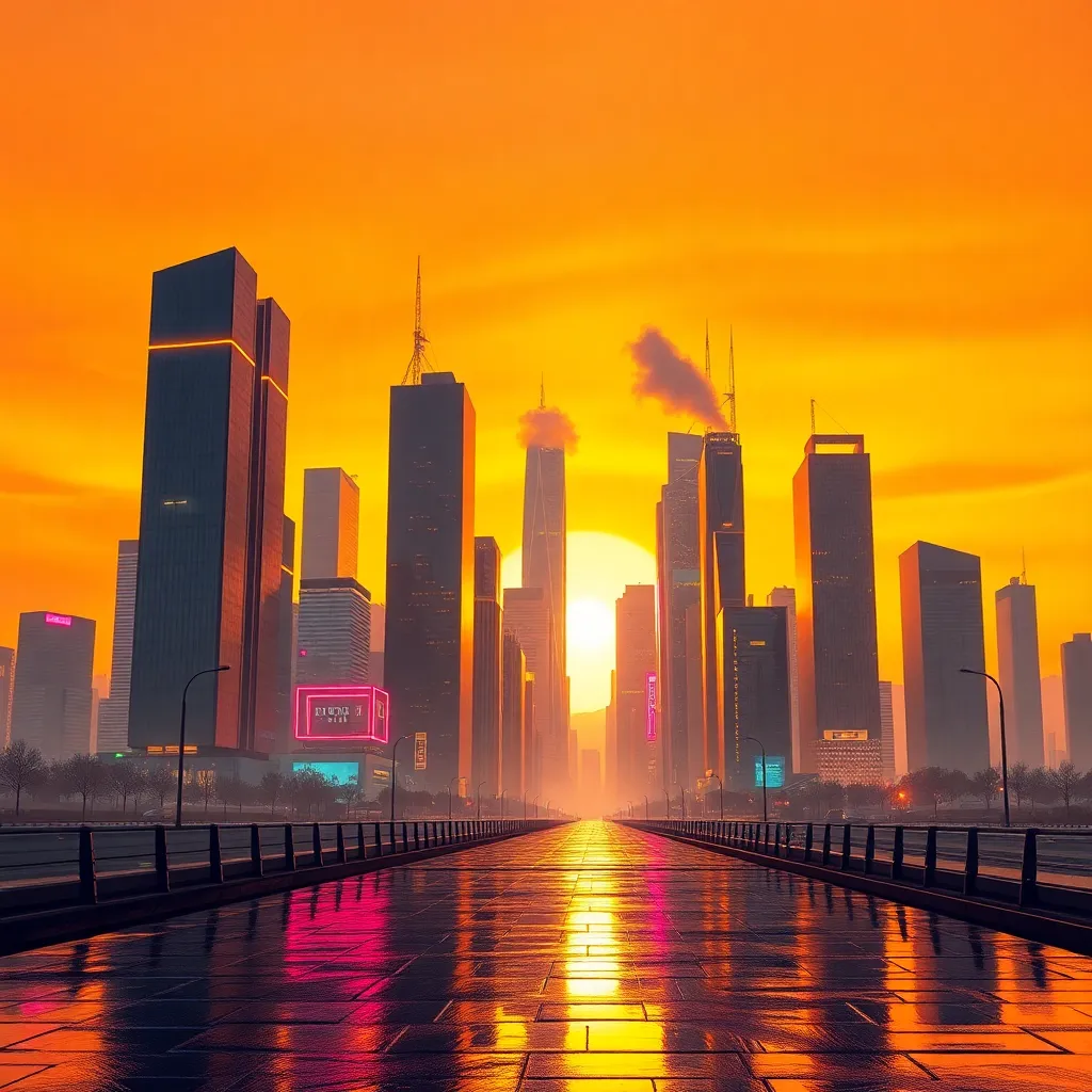 Create an AI-generated image of a futuristic cityscape at sunset, with sleek skyscrapers and neon lights reflecting off the wet pavement. The atmosphere is vibrant and energetic, with a subtle hint of futuristic technology and innovation. Use bold colors and sharp lines to capture the city's dynamic spirit.