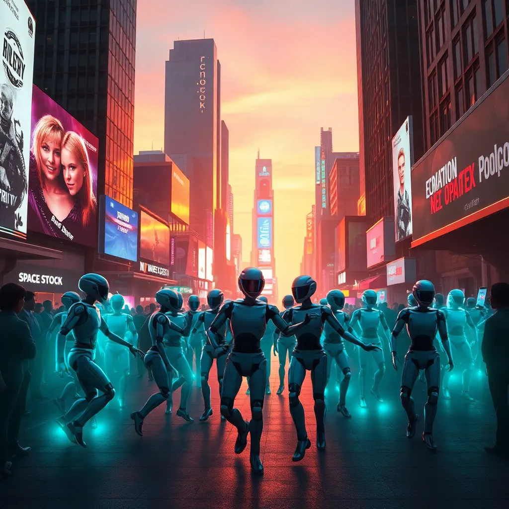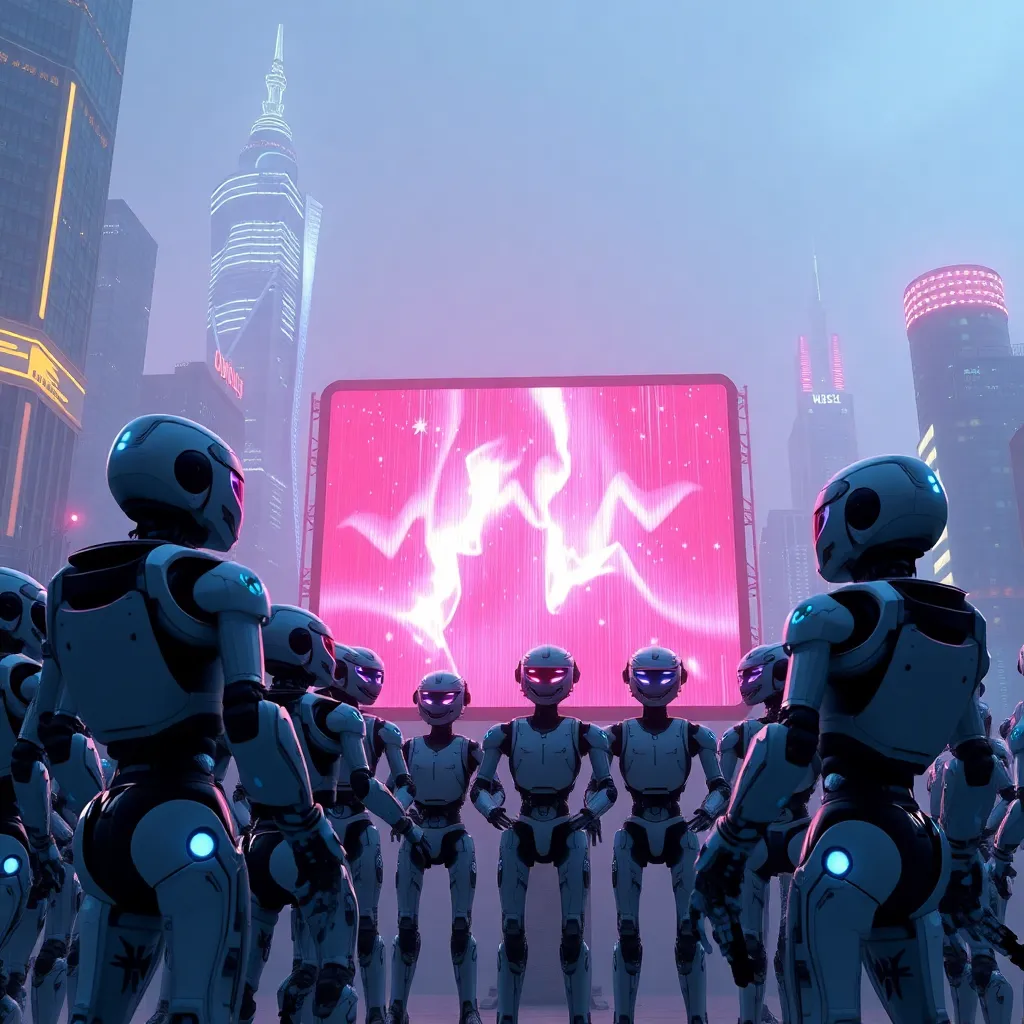 Create a futuristic cityscape with neon lights and towering skyscrapers. A group of robots, each with a unique design, gather around a giant screen displaying a mesmerizing AI-generated lip sync performance of a futuristic pop song. The robots sway and move in unison, their LED eyes glowing with excitement.