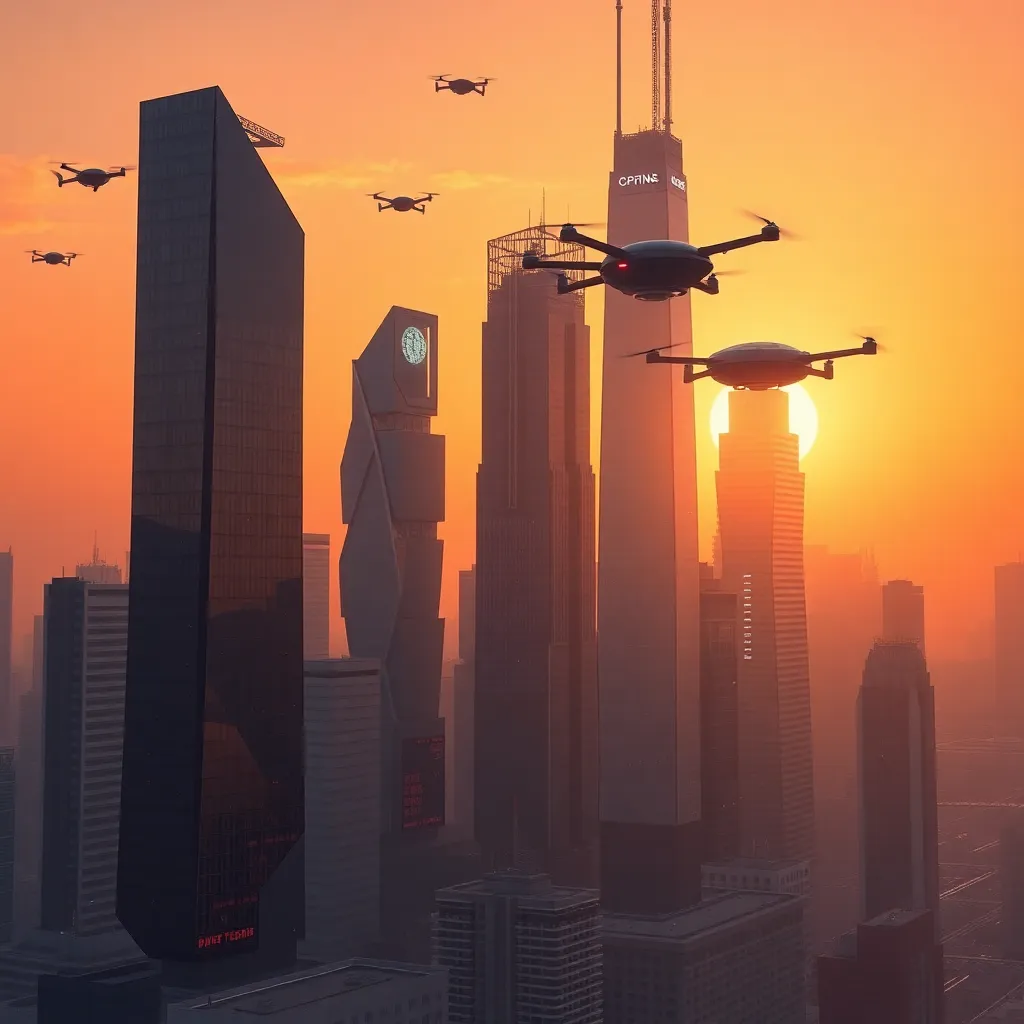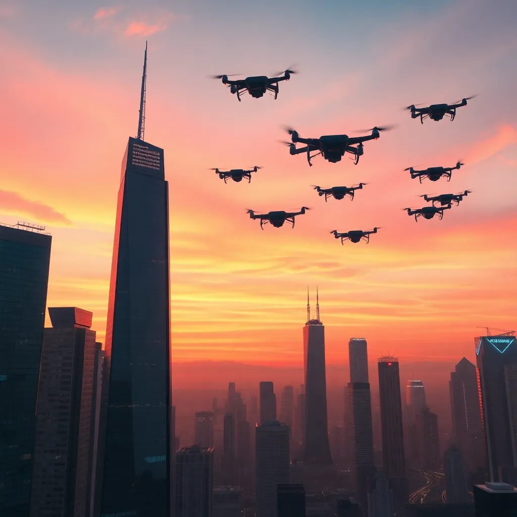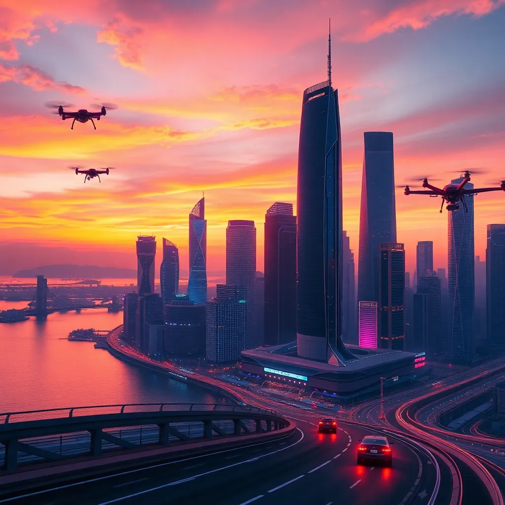 Create an AI-generated image of a futuristic cityscape at sunset, with towering skyscrapers and neon lights reflecting off the water. Incorporate a dramatic sky with hues of orange, pink, and purple. Add a sense of movement with speeding cars and flying drones. Use bold, vibrant colors to bring the scene to life.
