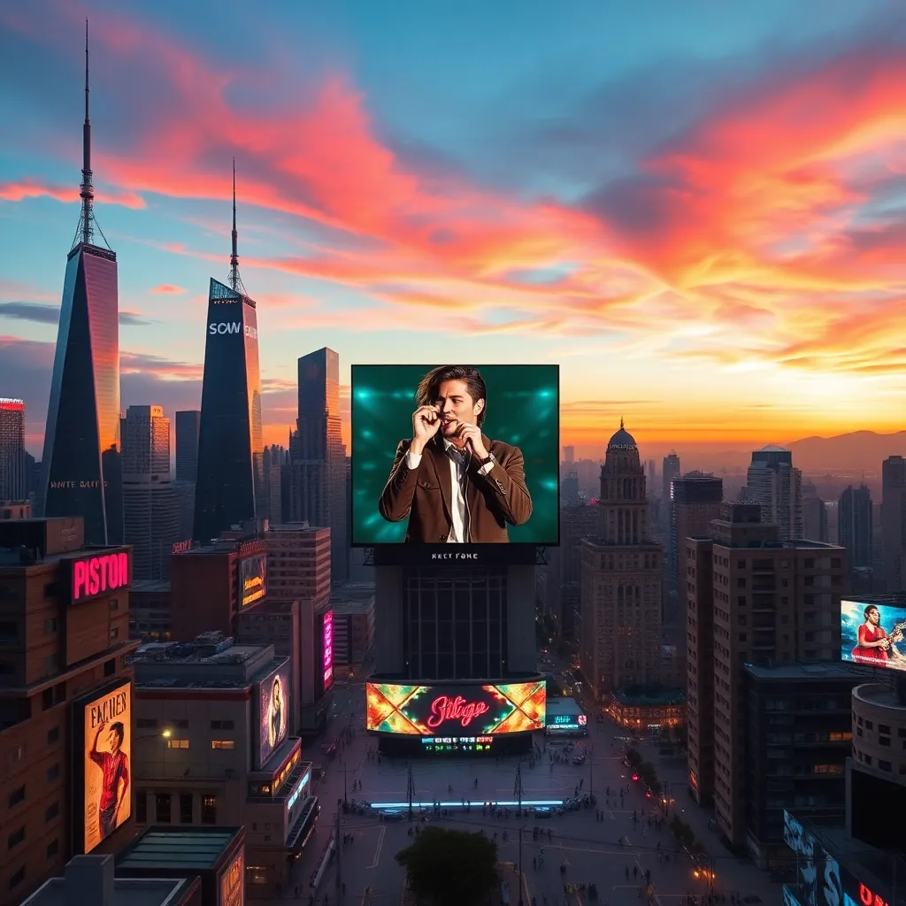 Create an image of a futuristic cityscape at sunset, with a giant screen displaying a lip-sync performance of a popular song by a famous artist. The city's skyline is a blend of sleek skyscrapers and retro-futuristic architecture, with neon lights and holographic advertisements adding to the vibrant atmosphere.