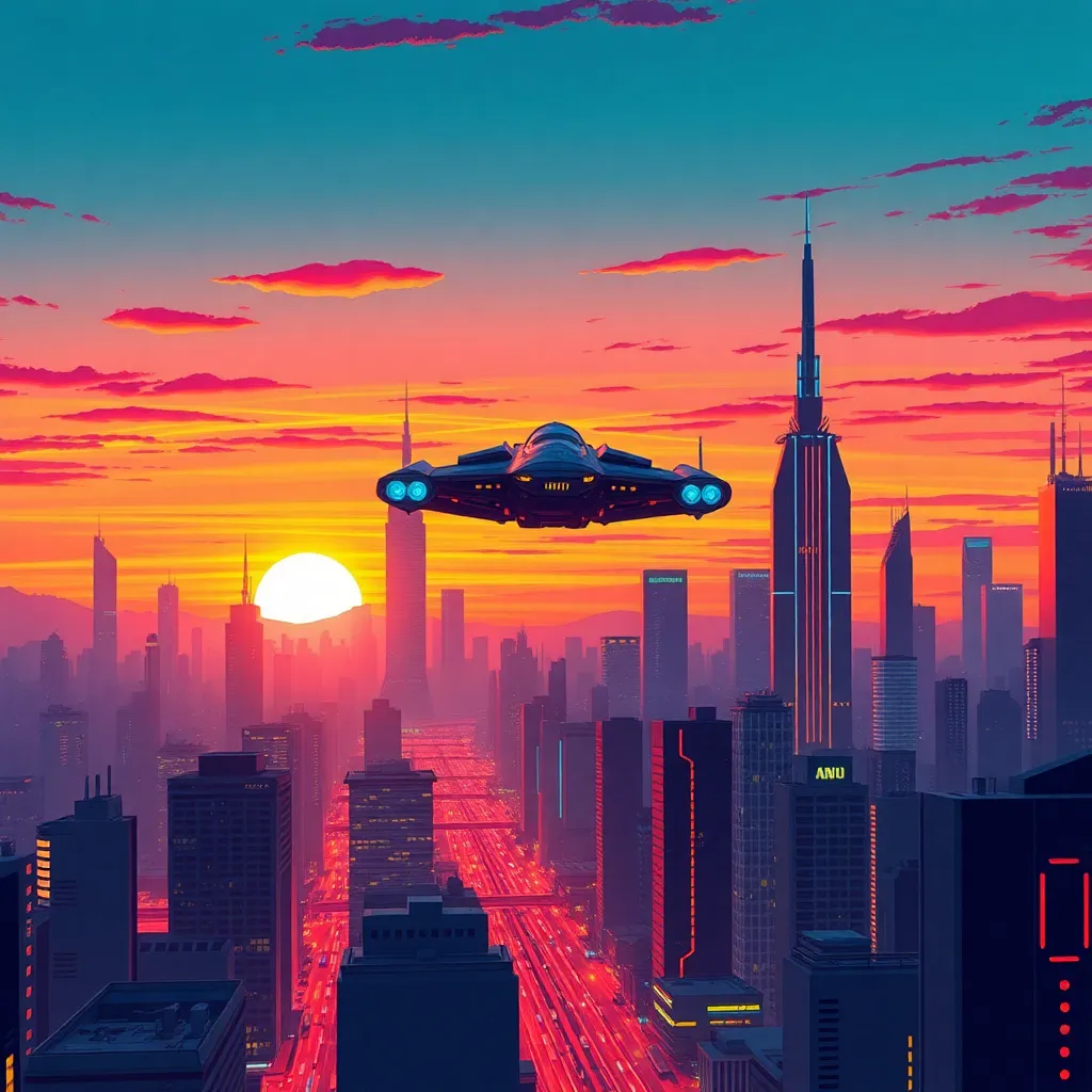 Create an image of a futuristic cityscape at sunset, with a sleek spaceship landing in the distance. The city is filled with neon lights and towering skyscrapers. The atmosphere is electric, with a sense of excitement and possibility in the air. Use vibrant colors and bold lines to bring this scene to life.