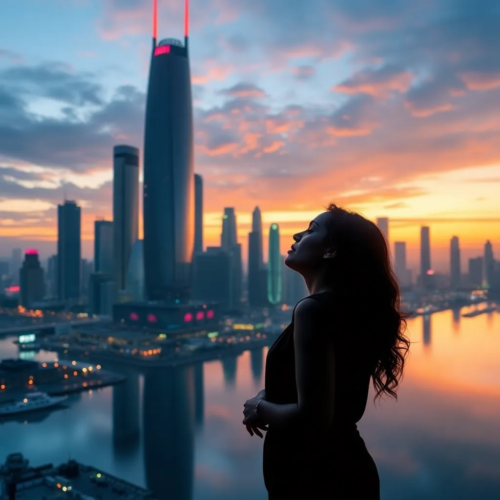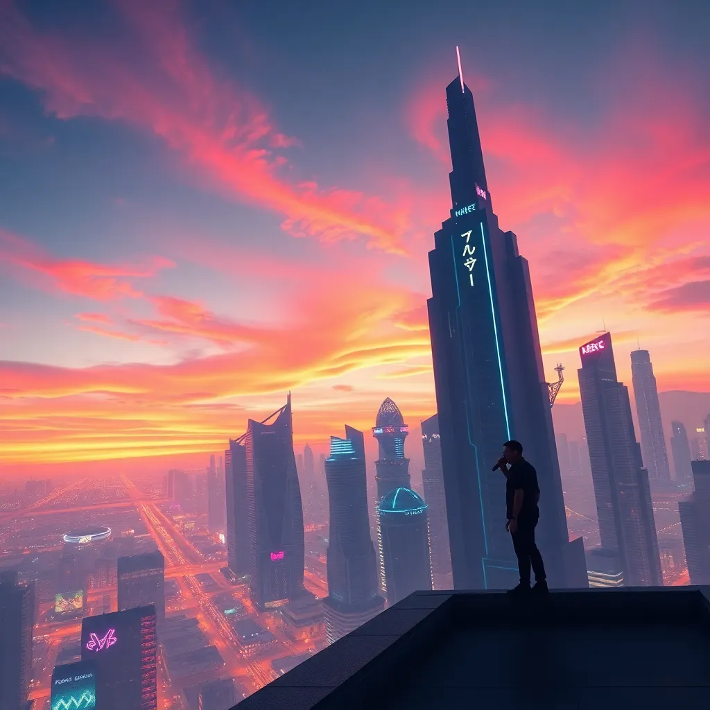 Imagine a futuristic cityscape at sunset, with towering skyscrapers and flying cars zipping by. A sleek, silver robot stands at the edge of the city, looking out at the breathtaking view. The robot's lips are moving, as if it's singing a haunting melody. Generate an AI image that captures this scene.