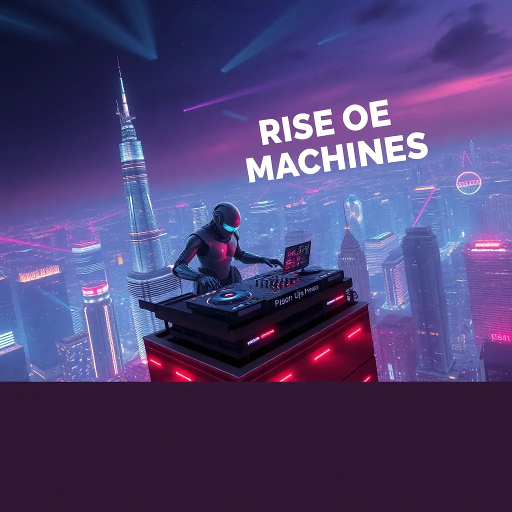Create a futuristic cityscape at dusk, with a sleek skyscraper in the center, surrounded by neon-lit streets and hovercars zipping by. In the foreground, a charismatic robot with glowing blue eyes and a silver suit is lip-syncing to a catchy electronic tune, its mechanical limbs moving in perfect sync.