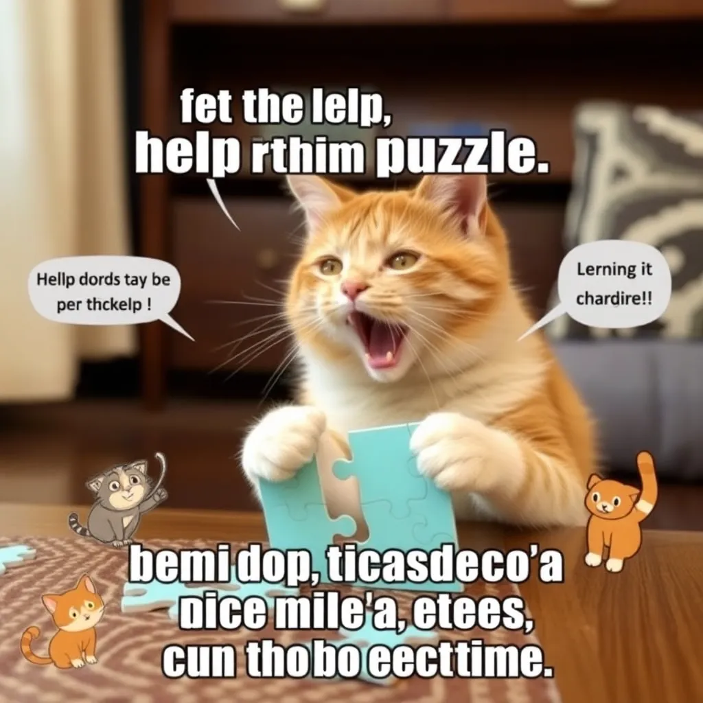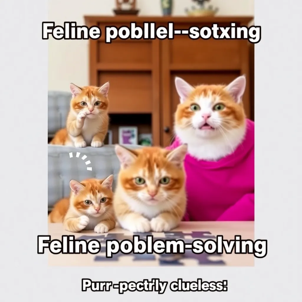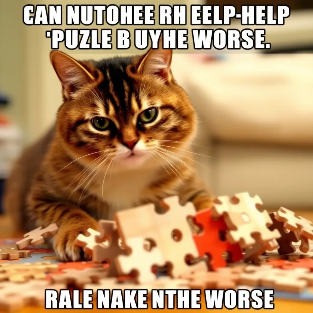 Create a humorous meme video featuring a cat trying to 'help' its owner with a puzzle, with each attempt ending in hilarious failure. Use bright colors, exaggerated expressions, and comedic sound effects to bring the scene to life. Add a caption like 'Feline problem-solving skills' or 'Purr-fectly clueless'.