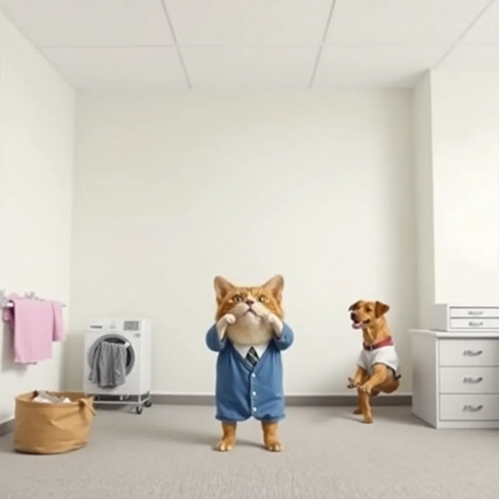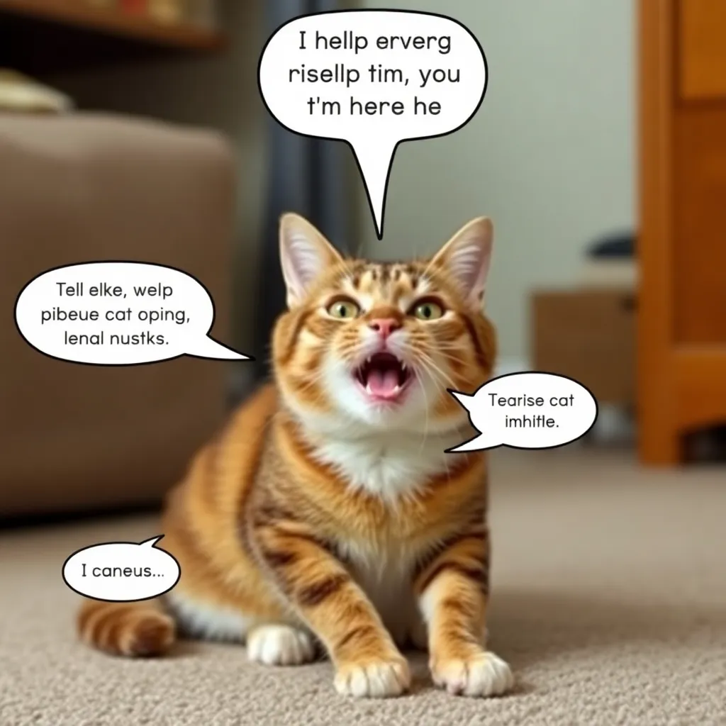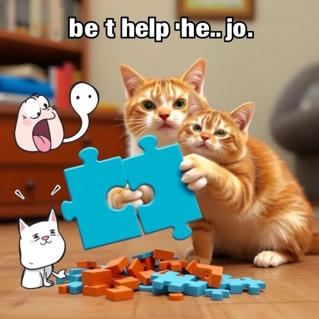 Create a humorous meme video featuring a cat trying to 'help' its owner with a puzzle, with each attempt ending in hilarious failure. Use bright colors, exaggerated expressions, and comedic sound effects to bring the scene to life. Add a caption like 'Feline problem-solving skills' or 'Purr-fectly clueless'.
