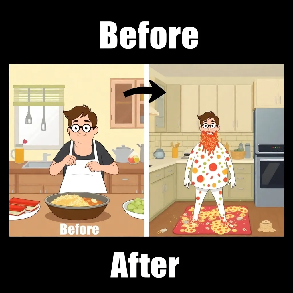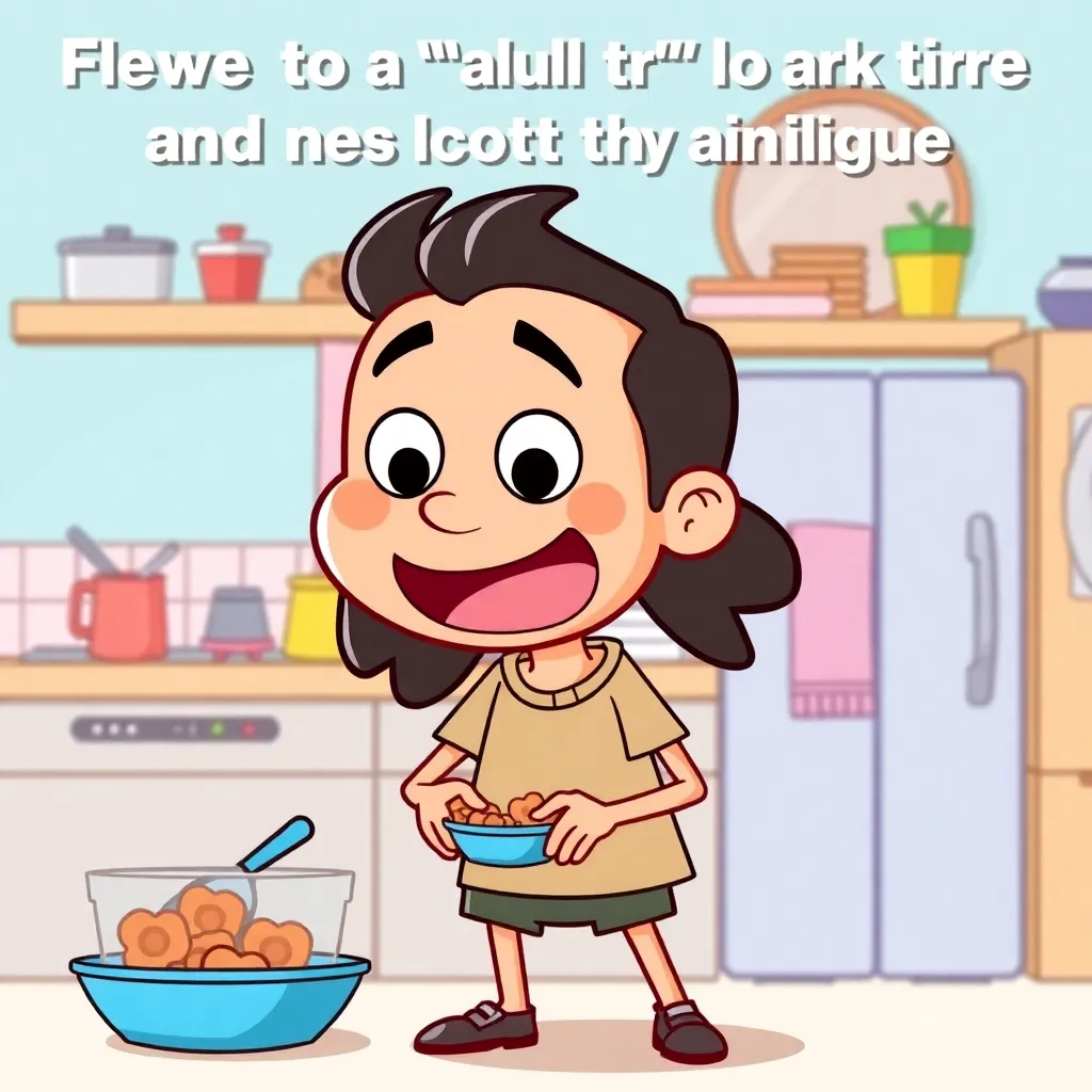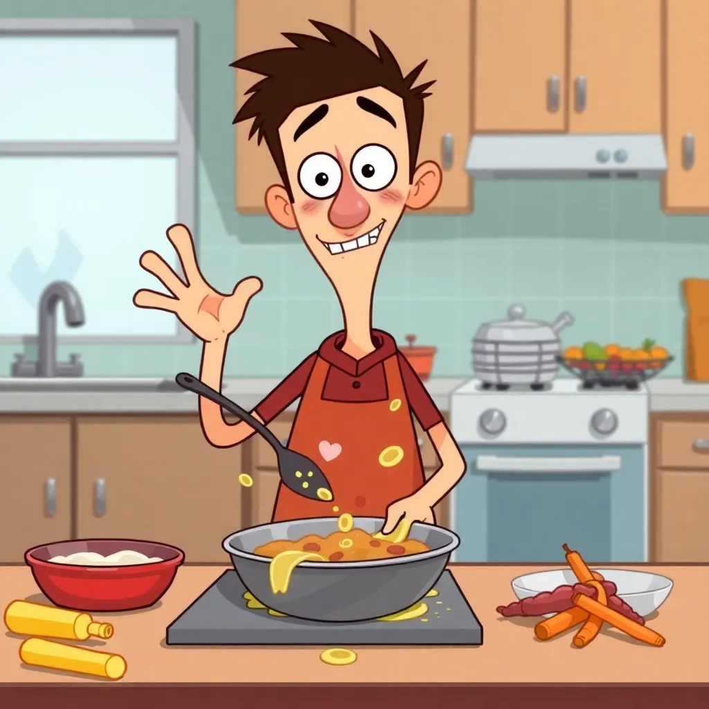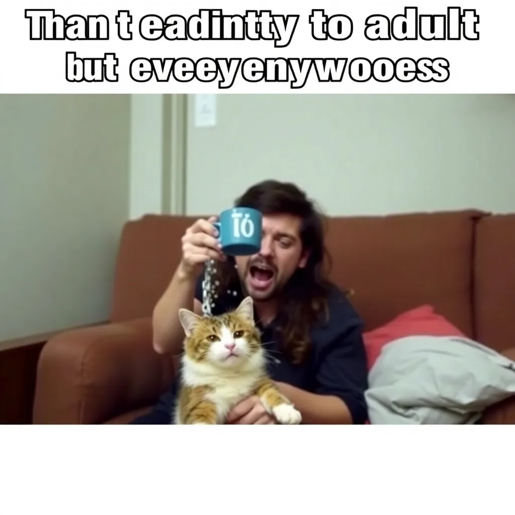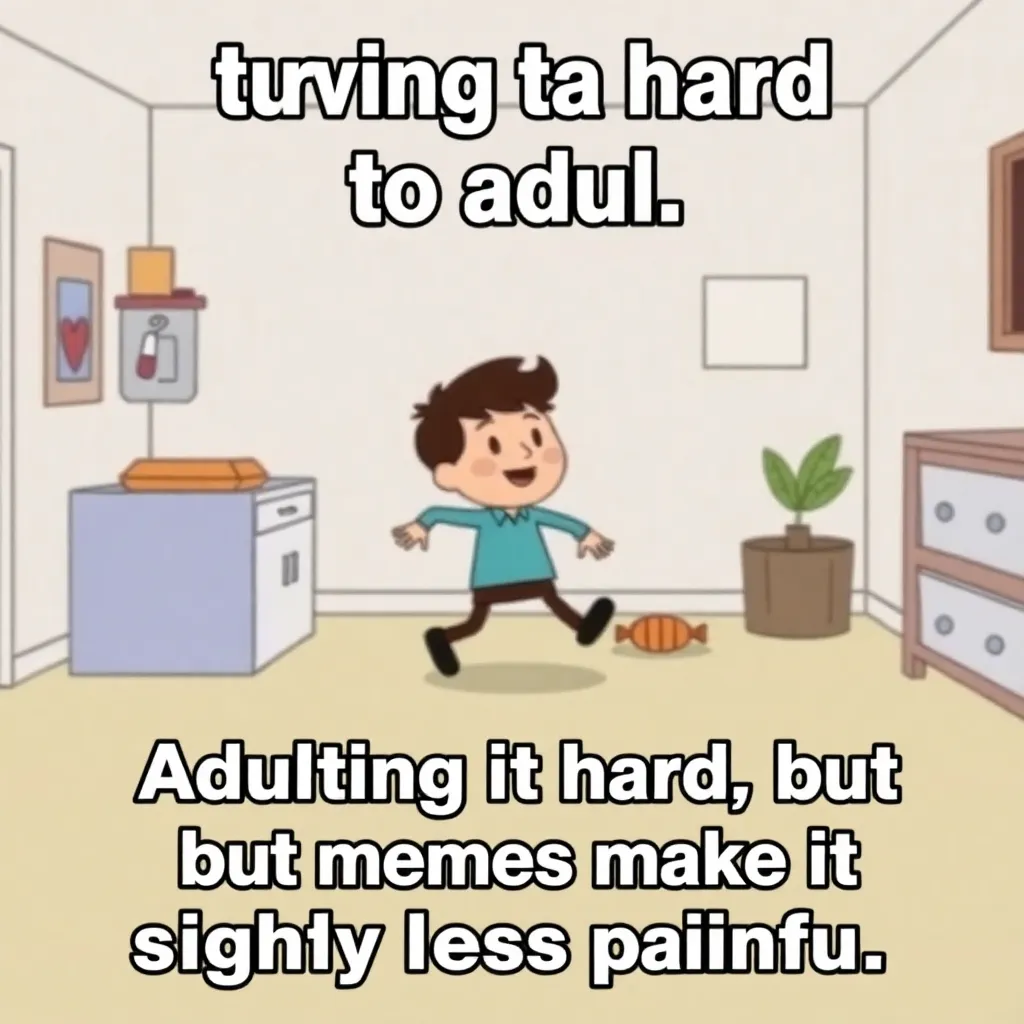 Create a humorous meme video featuring a cartoon character trying to 'adult' for the first time, with hilarious consequences. Incorporate relatable scenes of cooking, doing laundry, and paying bills, all while maintaining a goofy and playful tone. Use bright colors and exaggerated animations to bring the meme to life.