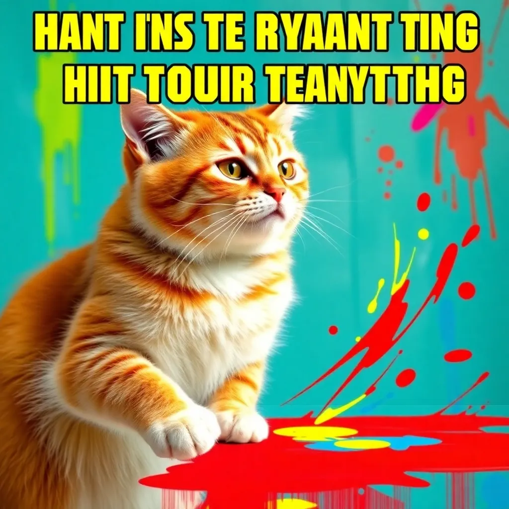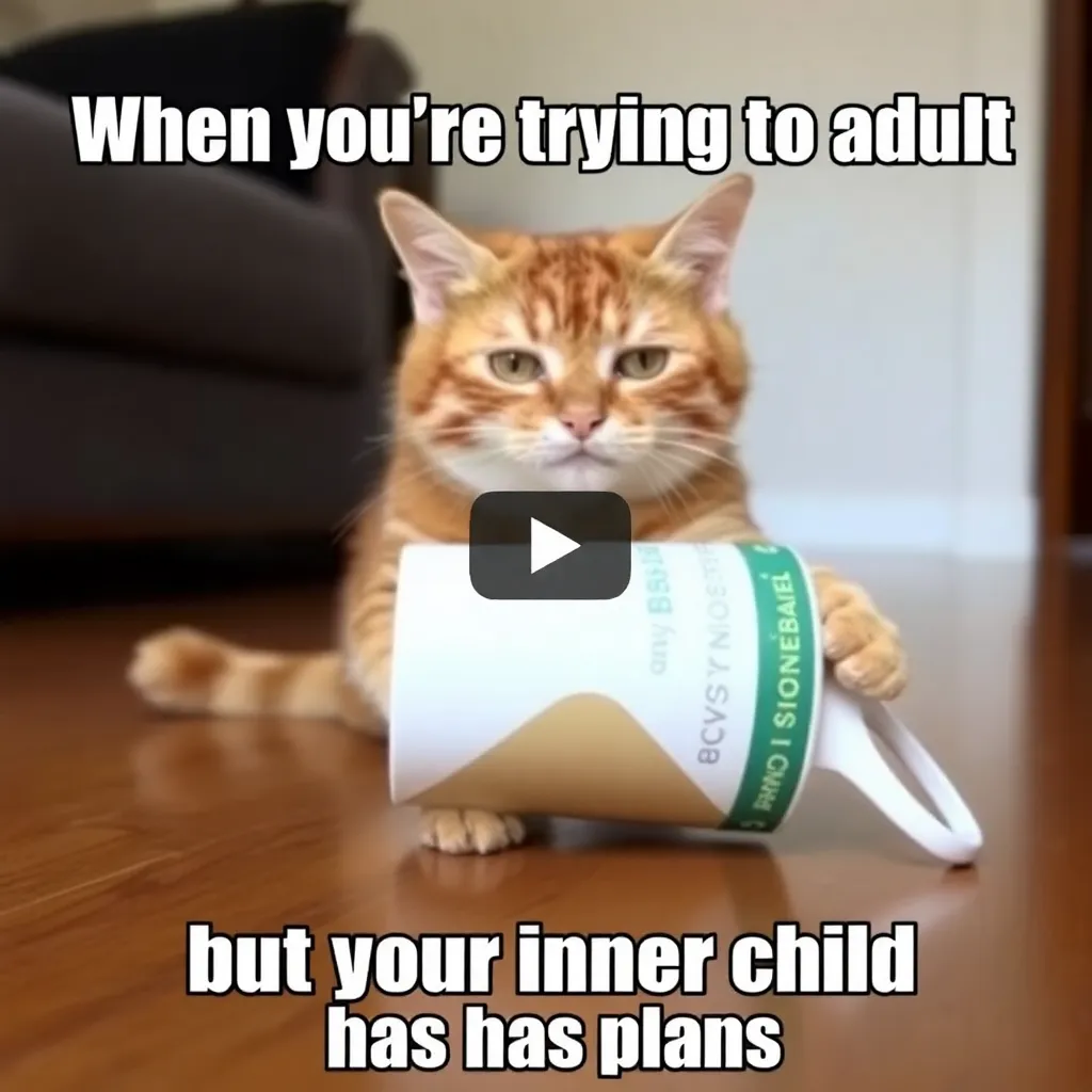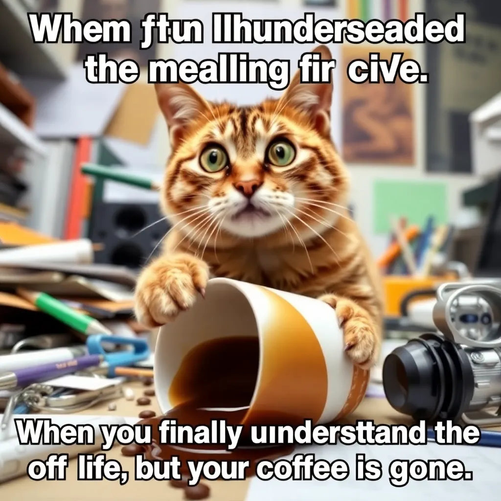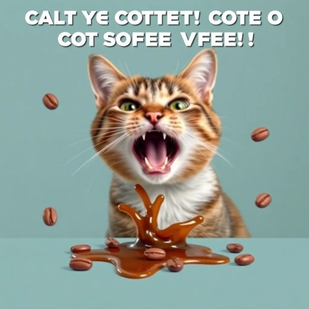 Create a hilarious meme video showcasing a cat's over-the-top reaction to a sudden coffee spill, set to a dramatic soundtrack. Use bold, colorful graphics and animated coffee beans to add to the comedic effect. The cat's face should be contorted in a comically exaggerated expression of shock and dismay.