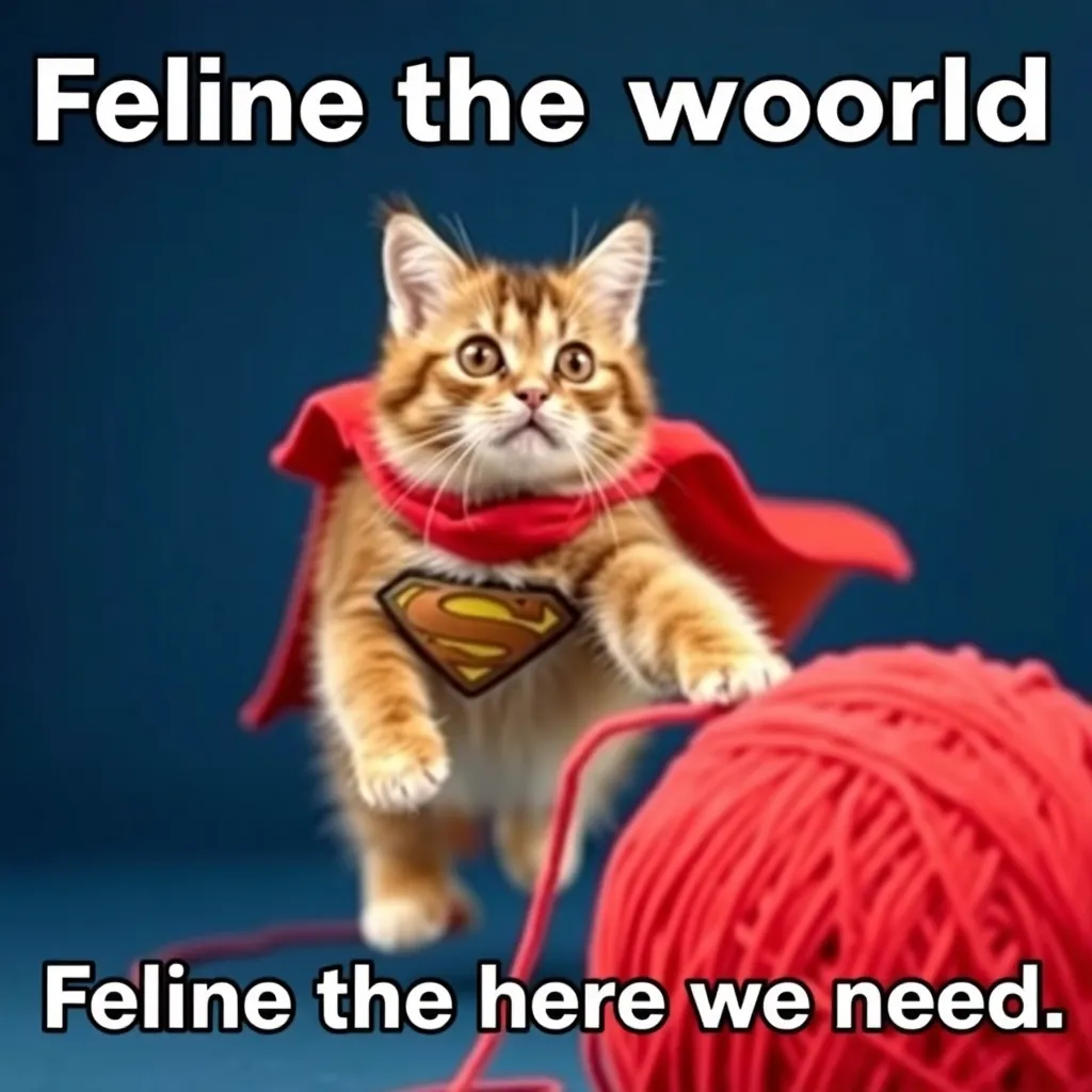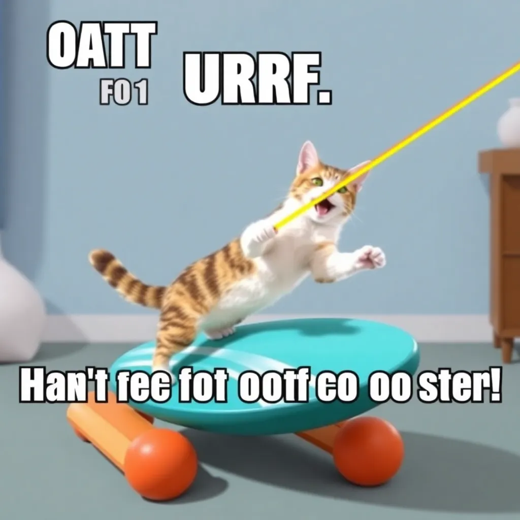 Create a humorous meme video featuring a cat trying to 'urf' on a giant cat toy in a hilarious attempt to catch a laser pointer, set to upbeat music and overlaid with funny captions and animations. Use bright colors, cartoon-style visuals, and exaggerated expressions to make it a laugh-out-loud masterpiece!
